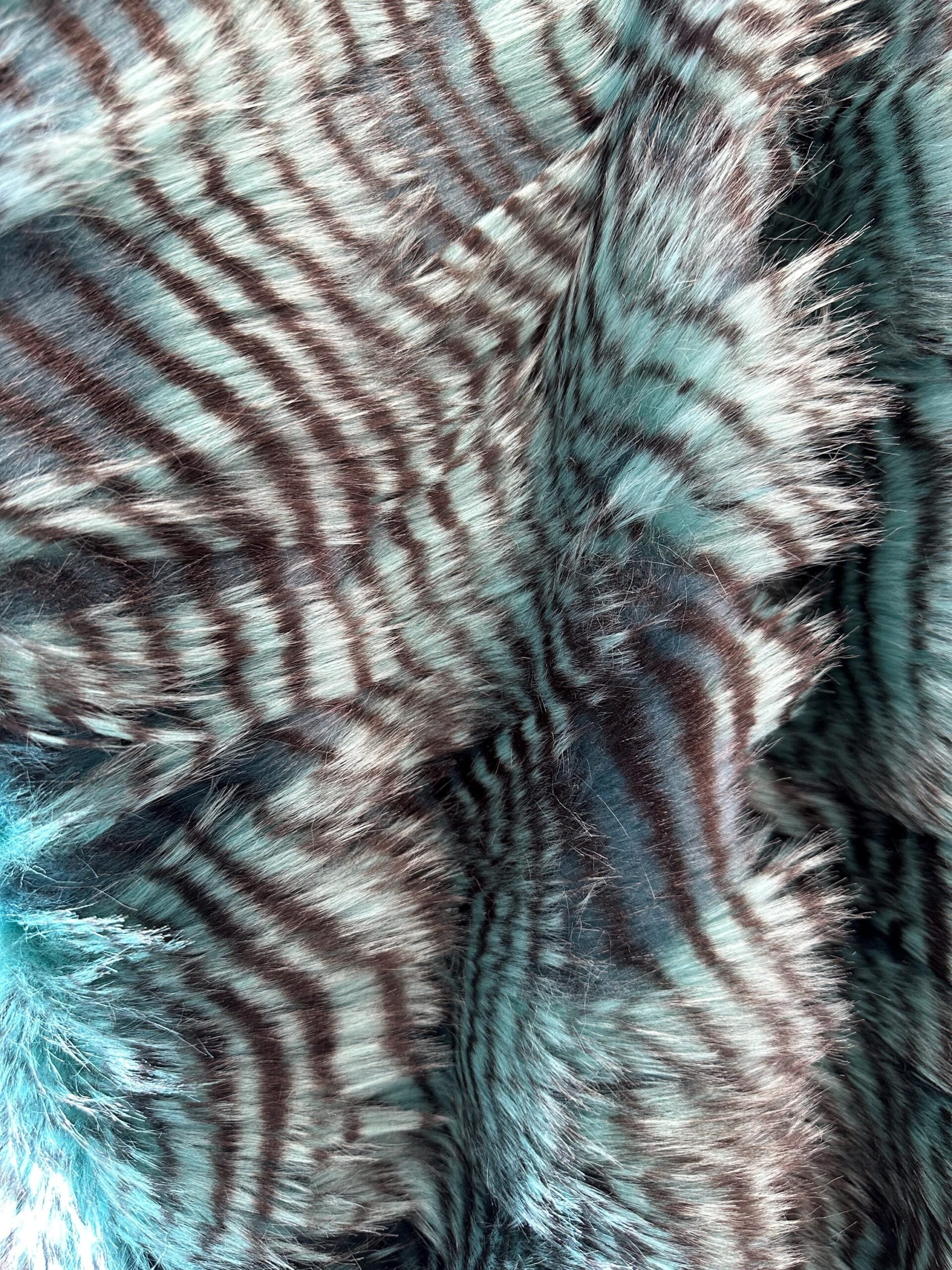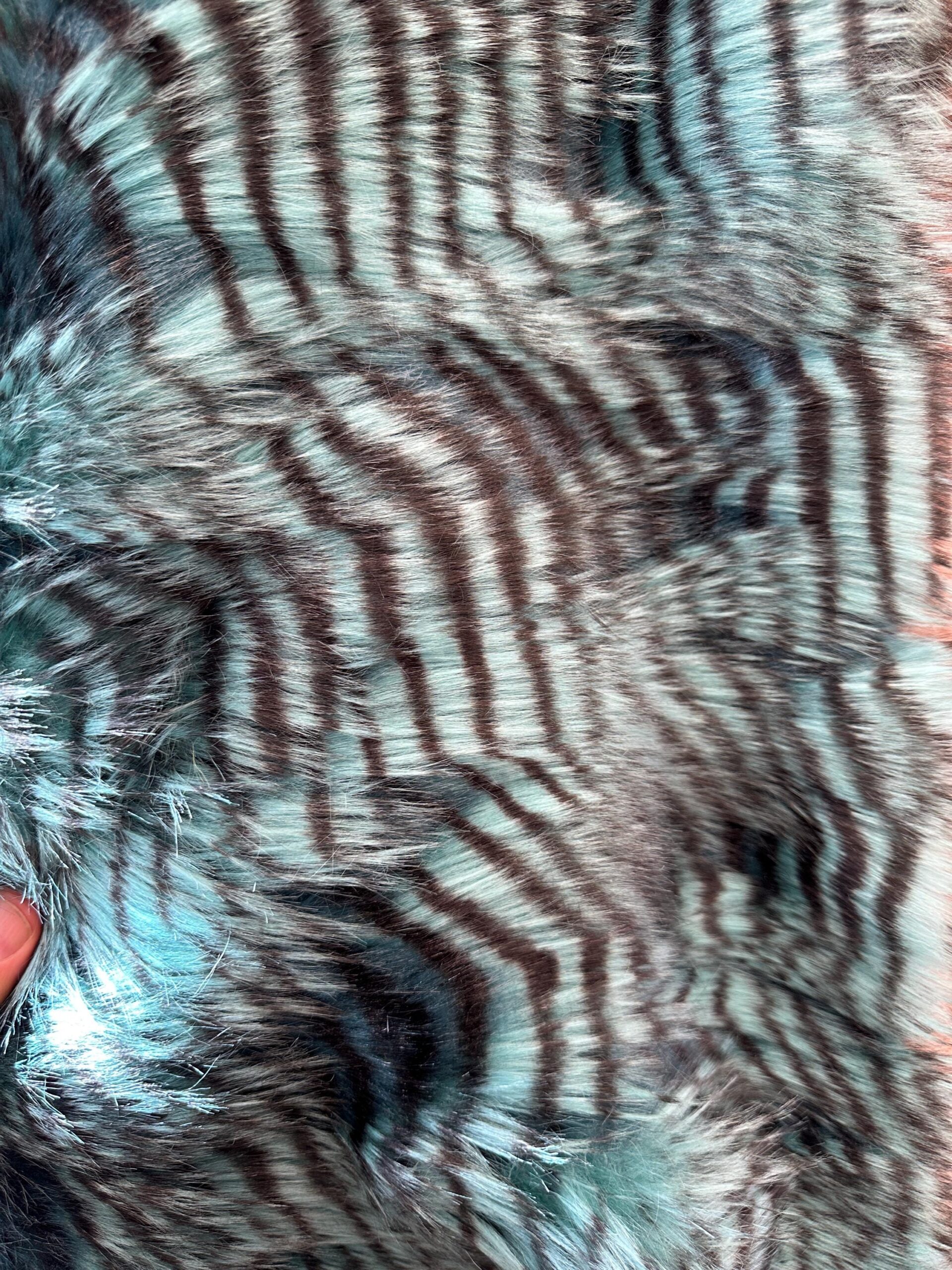 Add a bold and luxurious touch to your next project with this stunning Aqua & Black fancyFaux Fur Fabric. This eye-catching material features soft long-pile fibers with a beautiful striped pattern blending aqua blue, grey, and deep black tones. The fur is incredibly soft to the touch and has a natural flow that mimics real animal fur — perfect for statement coats, cosplay costumes, pillows, blankets, or chic upholstery accents.