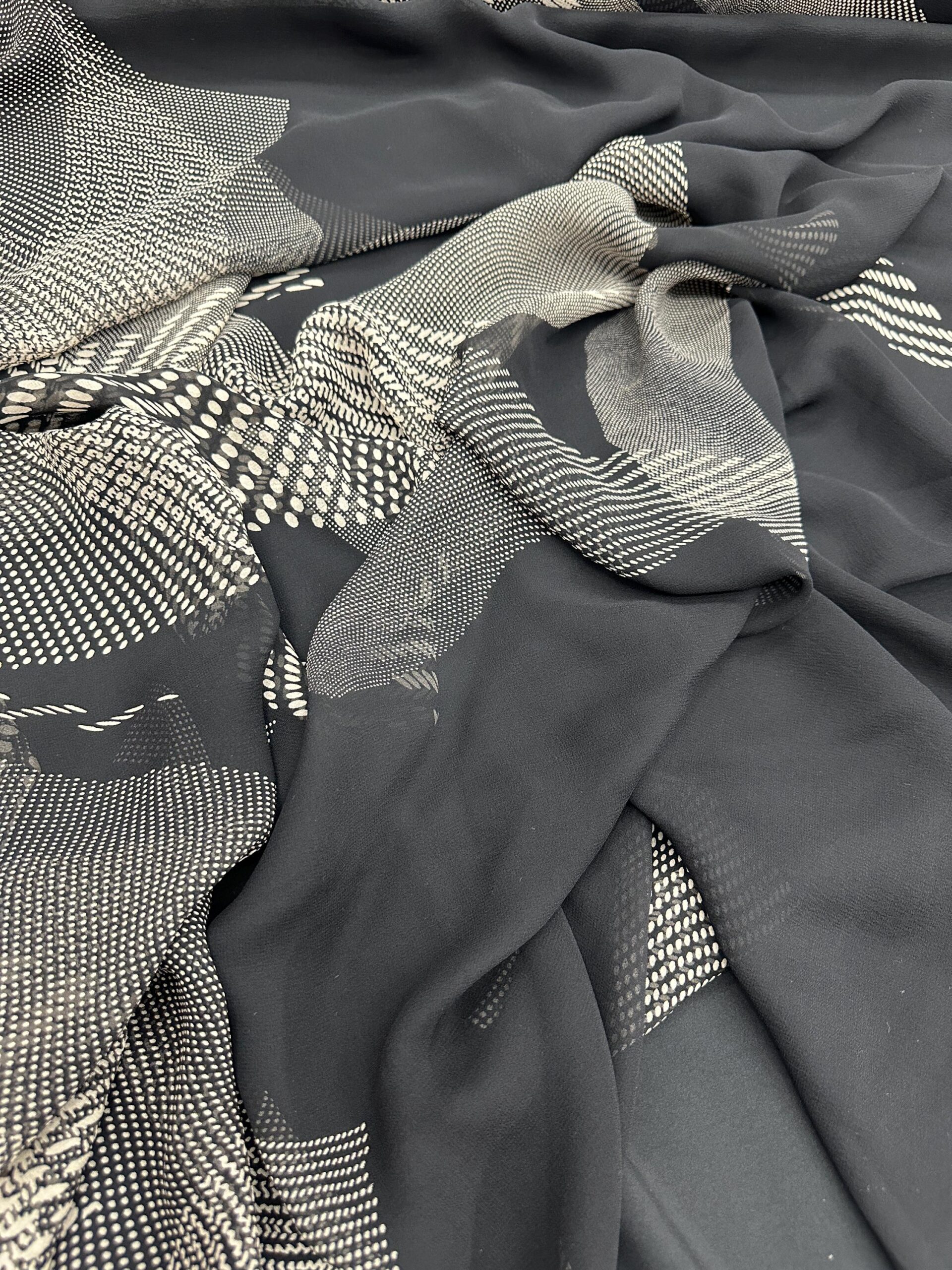 Indulge in luxury with this 100% Silk Chiffon Fabric, featuring a stunning abstract ivory wave print on deep black. This designer-quality mulberry silk chiffon is delicately sheer, feather-light, and incredibly soft with a beautiful flowing drape.