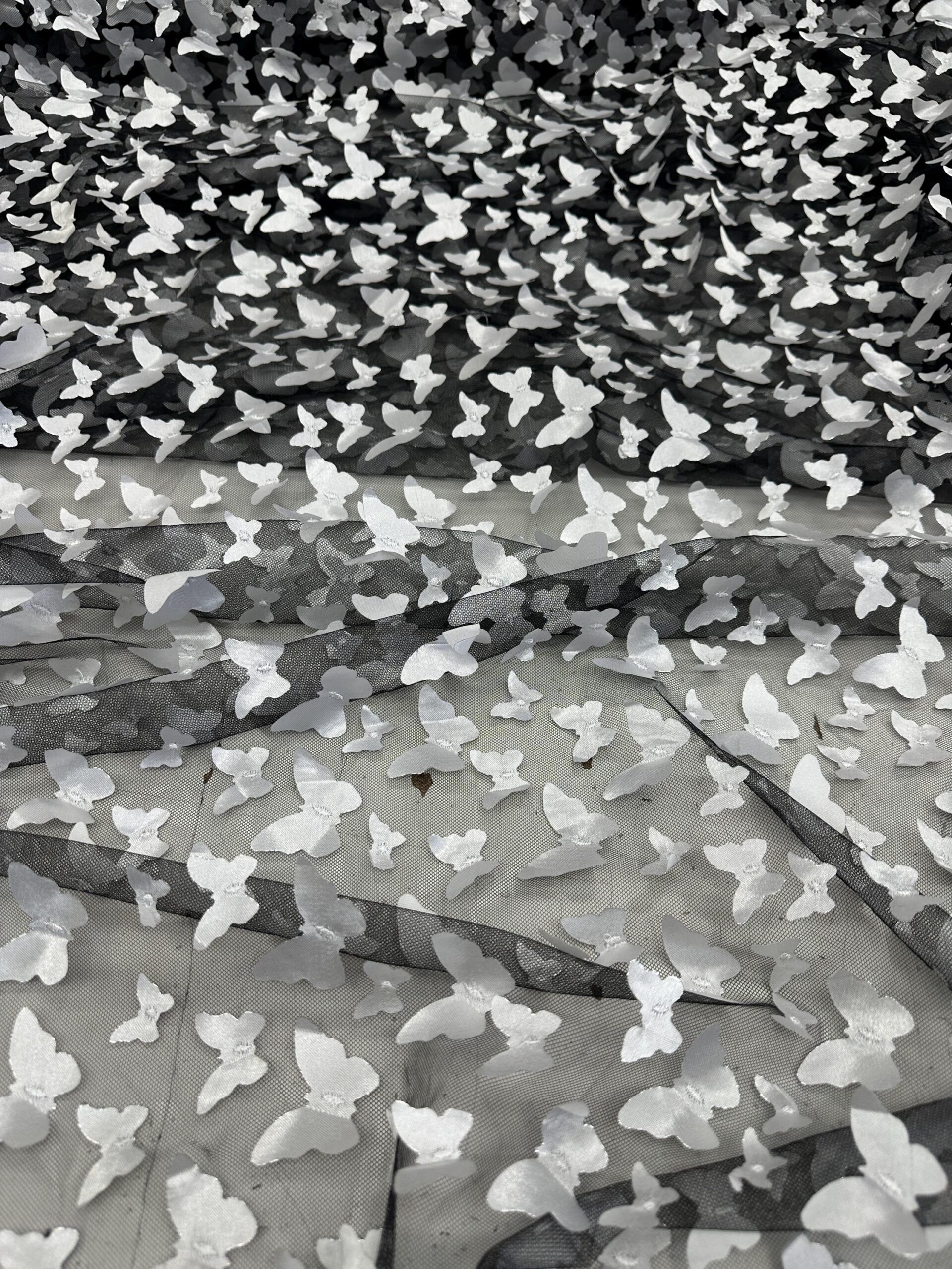 Introducing this stunning Black 3D Butterfly Mesh Fabric, a perfect blend of elegance and dimension. This fabric features a soft, sheer black mesh base adorned with raised white satin butterflies in various sizes, giving the material a beautifully textured, floating effect.