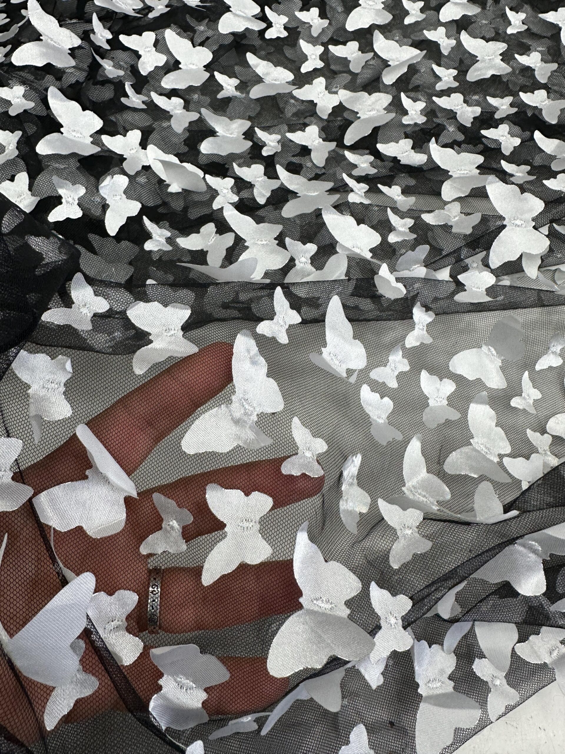 Black Butterfly 3D Appliqué Mesh Fabric by the Yard | Sheer Black Tulle with White Satin Butterflies | 58/60” Wide | Bridal, Costumes