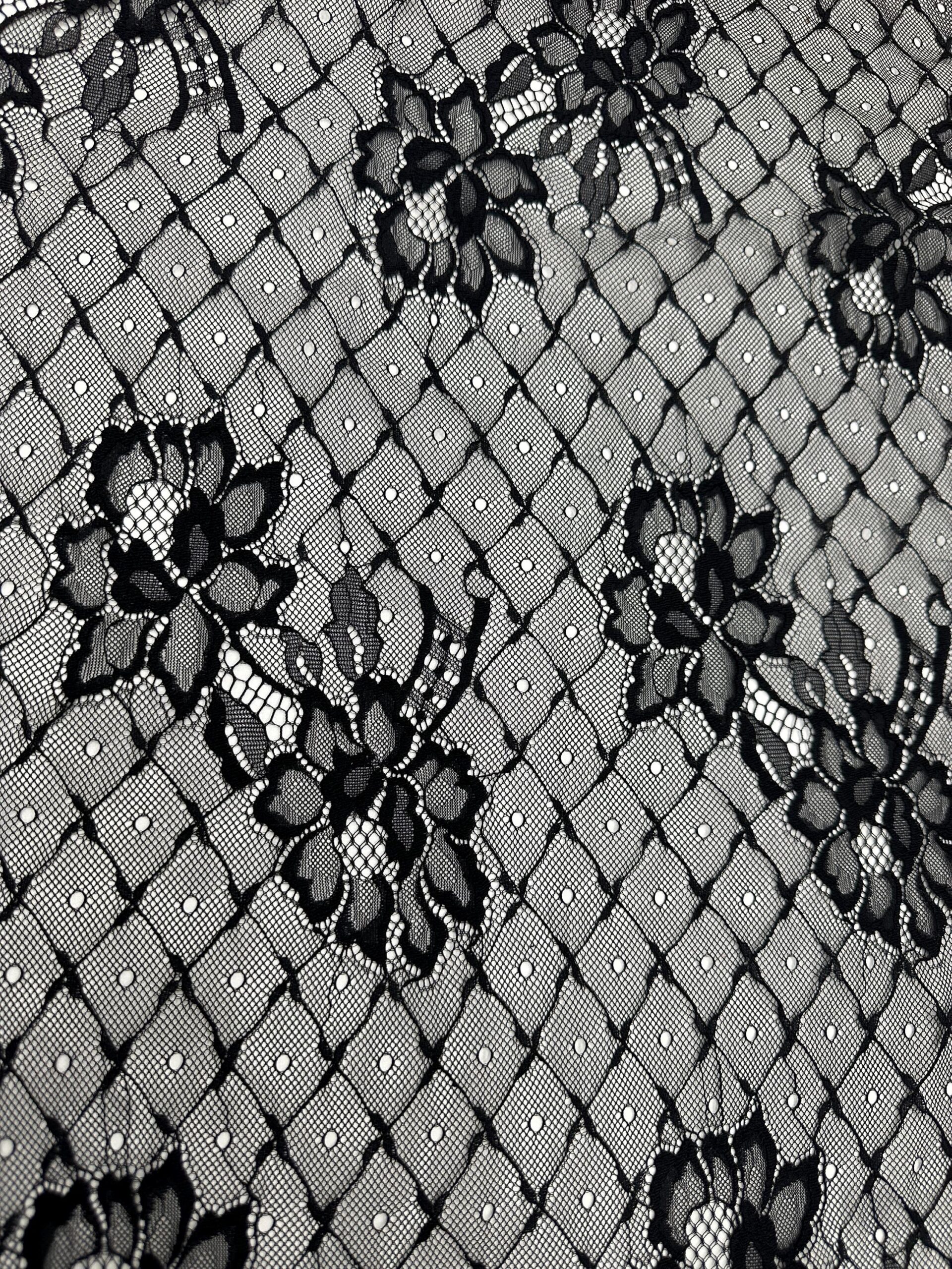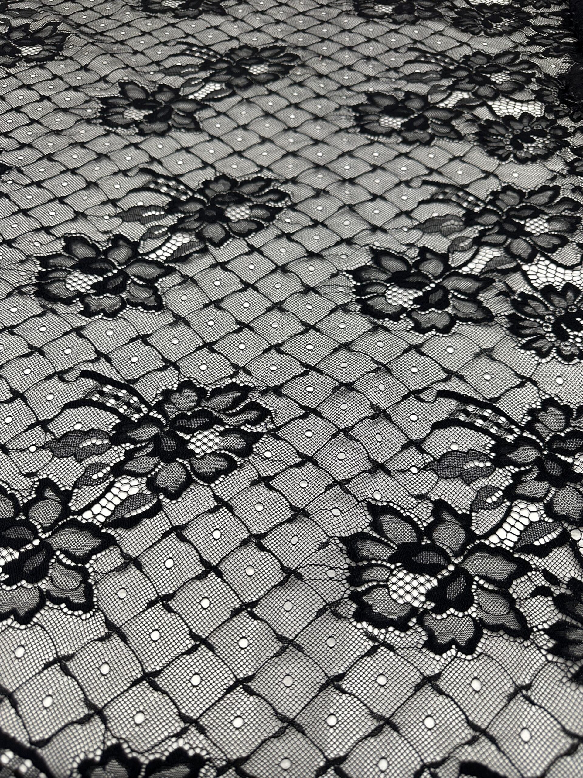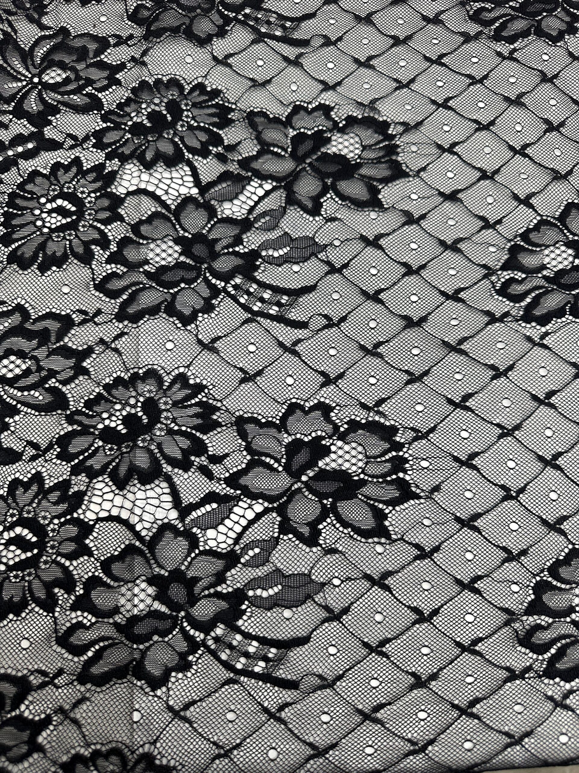 Black Chantilly Lace Fabric by the Yard | Floral Mesh Lace with Dots | Elegant Sheer Lace for Dresses, Lingerie, Bridal, Overlays