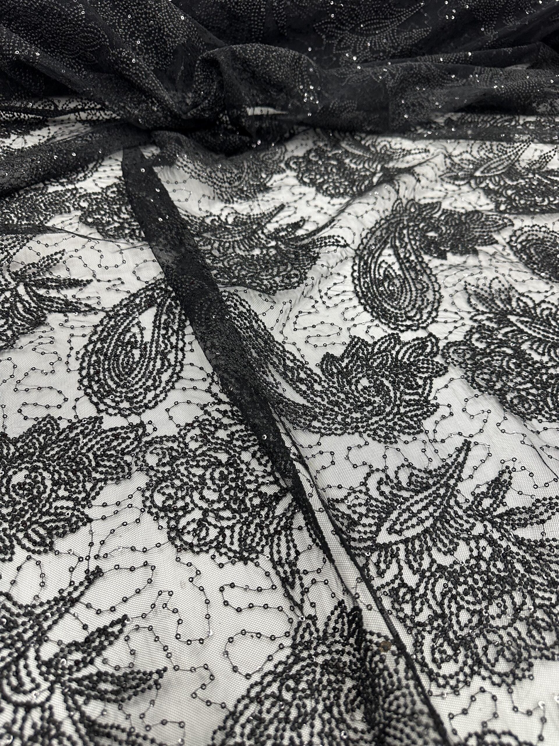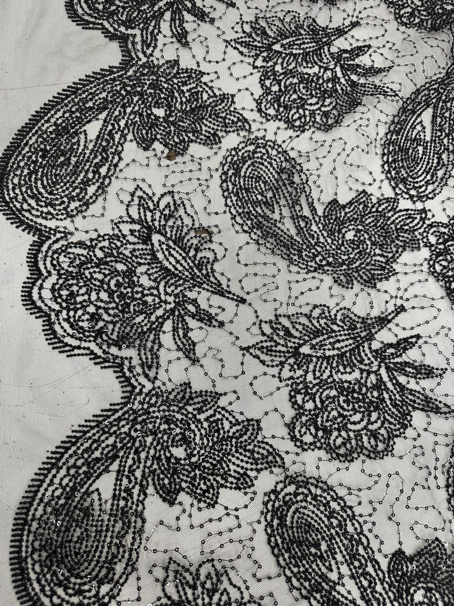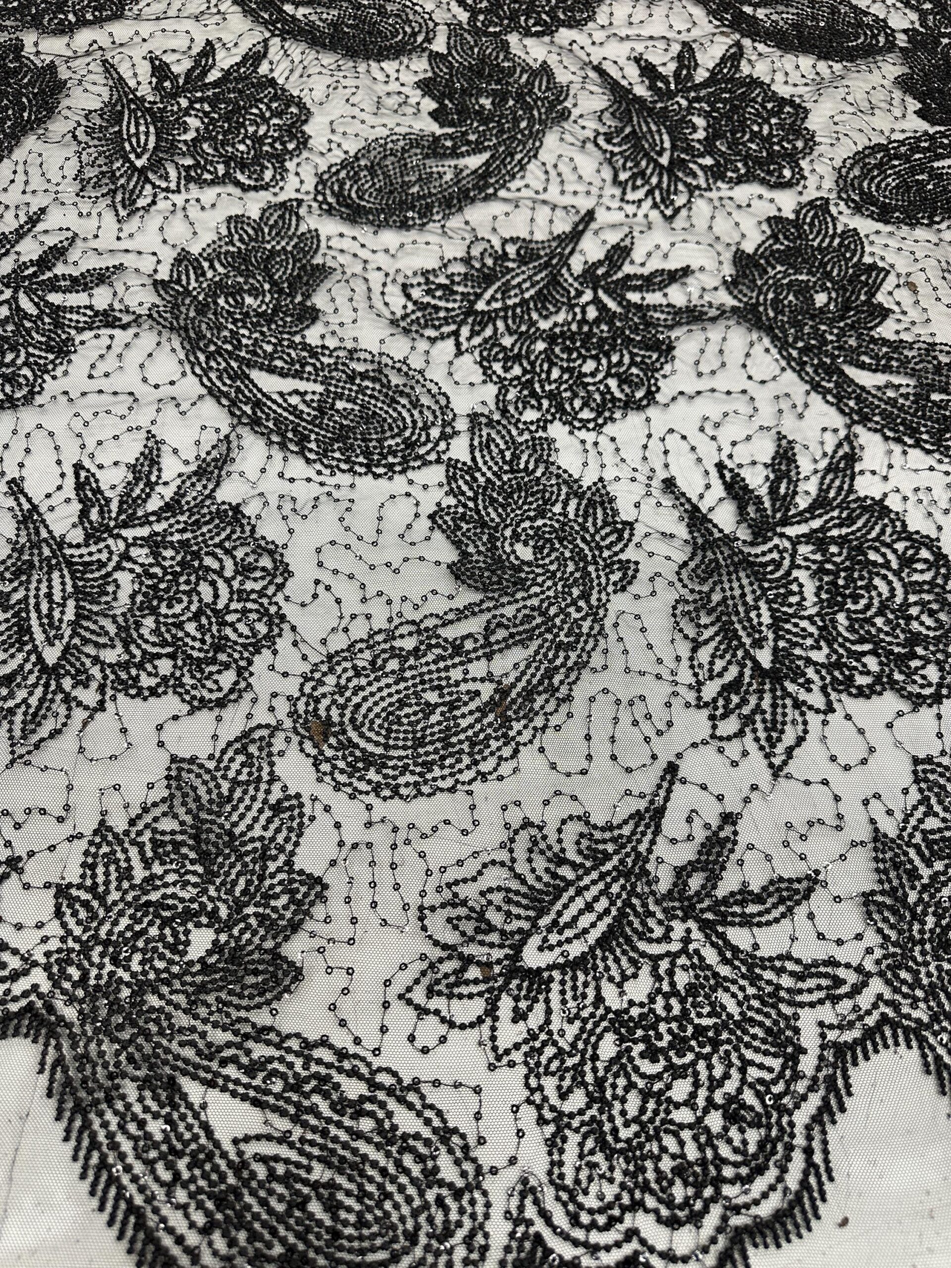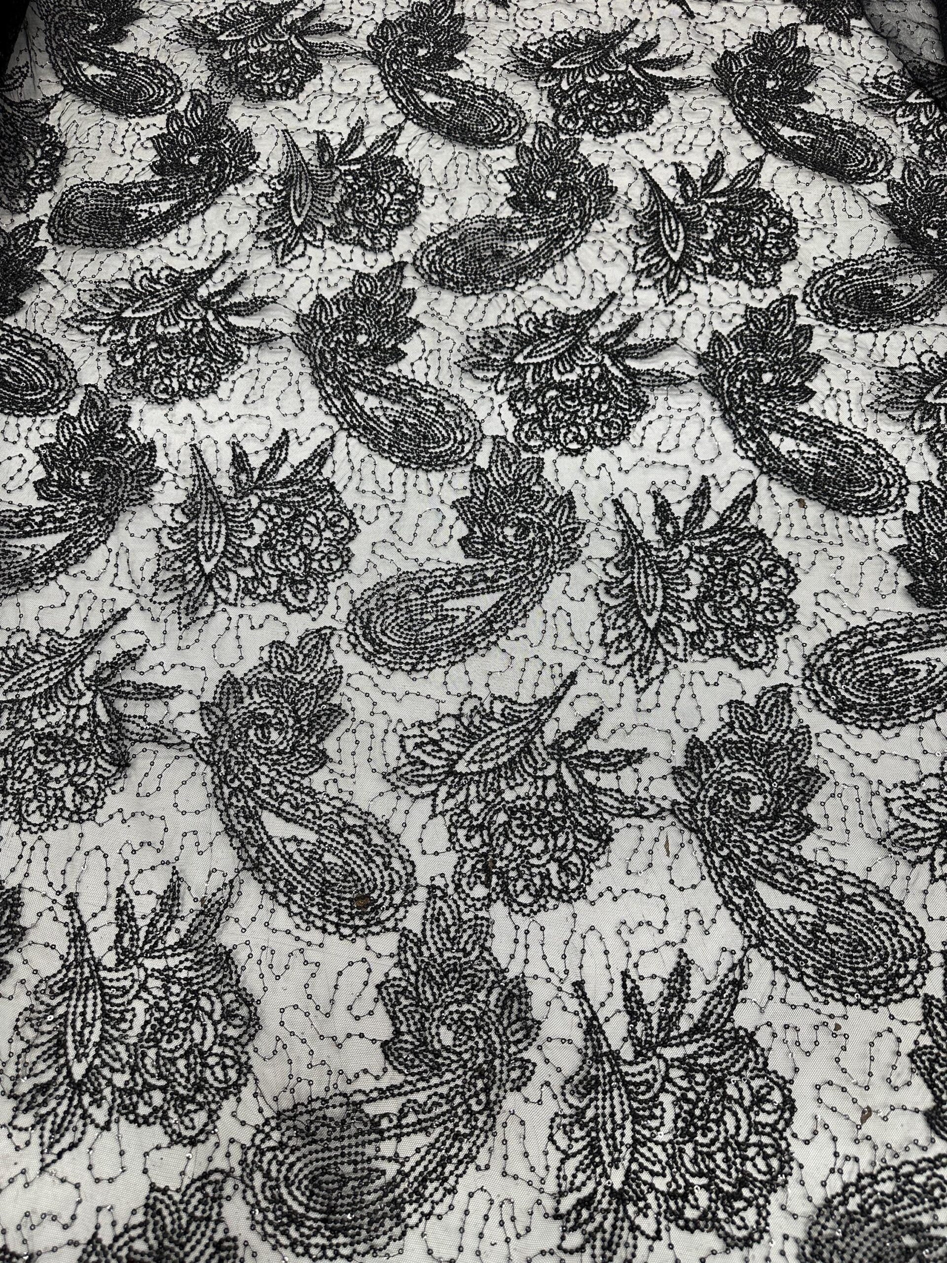 Black Embroidered Lace Fabric by the Yard | Paisley Floral Mesh Lace | Elegant Eveningwear & Bridal Overlay | 52/54β Wide