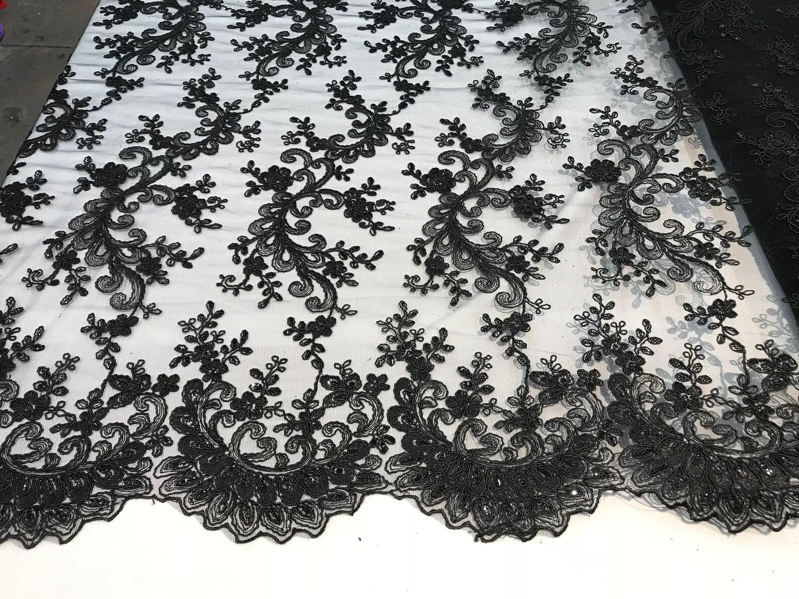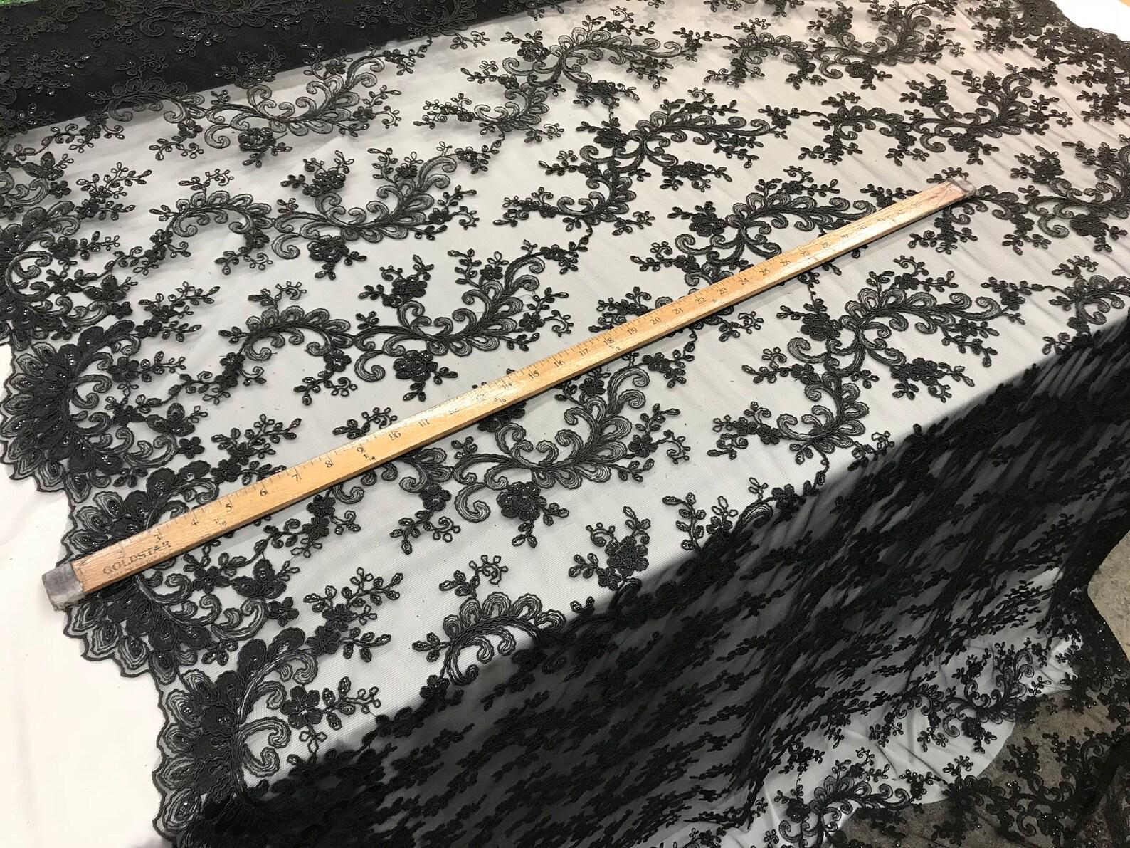 Black Floral Embroidered Lace Fabric Beaded Scalloped Edge Bridal Veil
