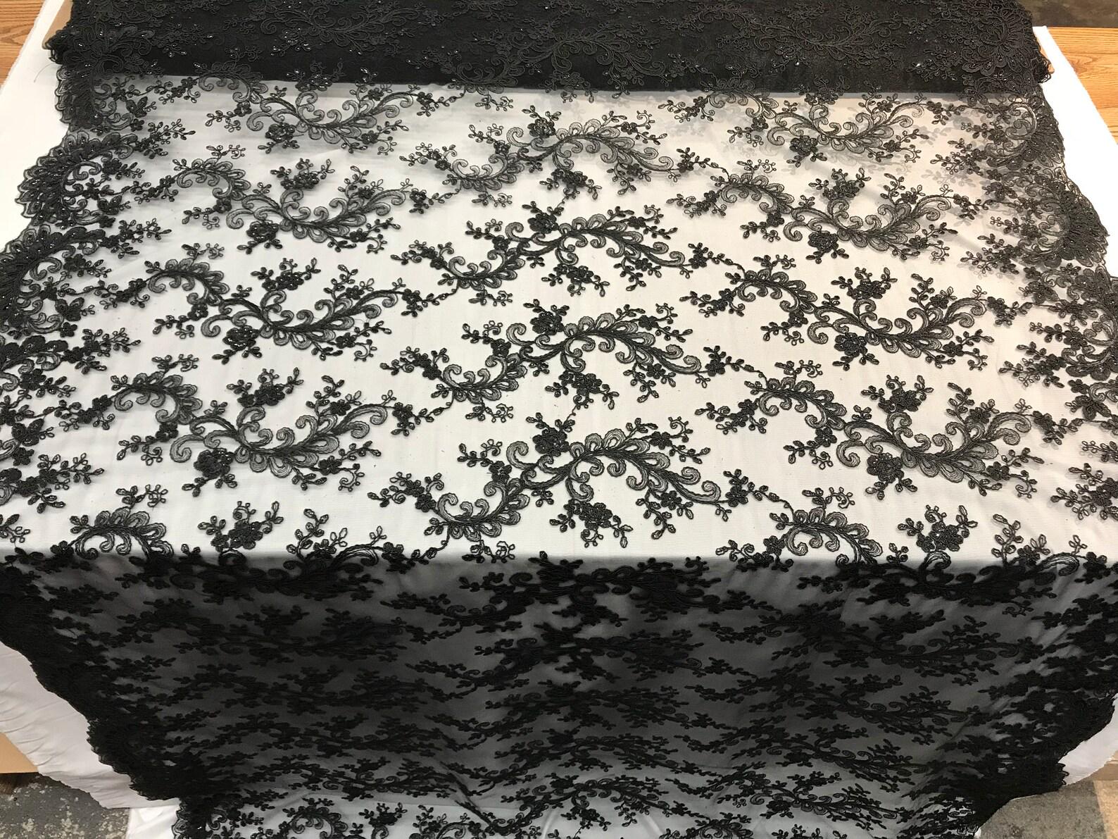 Bring timeless elegance to your creations with this Black Beaded Corded Floral Embroidered Lace Fabric, featuring delicate scroll and floral motifs on a sheer mesh base. The lace includes beautiful corded outlines and subtle beadwork, adding depth, texture, and a sophisticated sparkle.