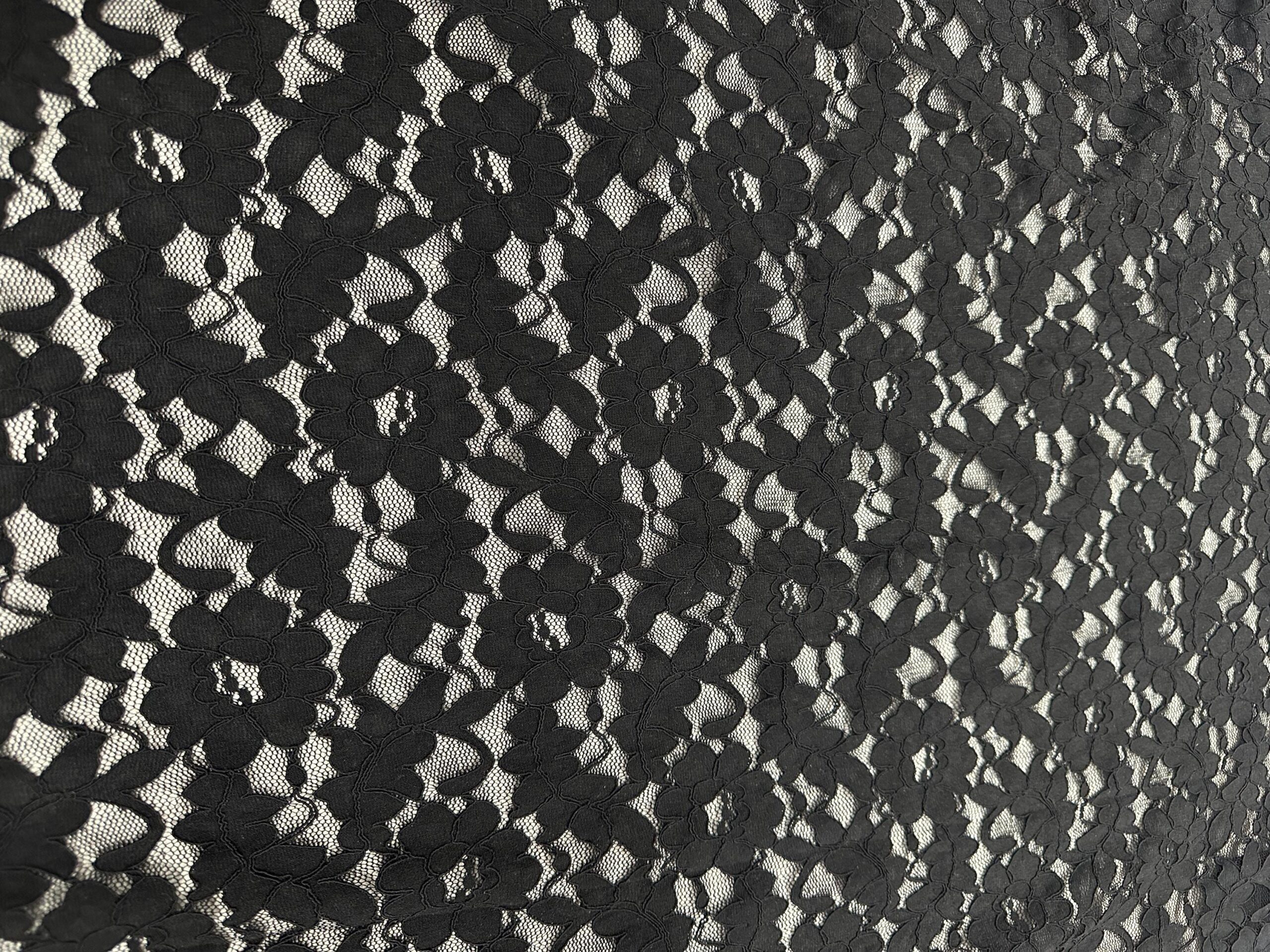 Bring elegance and texture to your sewing projects with this Black Stretch Floral Lace Fabric. Featuring a beautiful large-floral pattern over a delicate mesh background, this lace offers both softness and flexibility, making it perfect for fitted garments and layered designs.