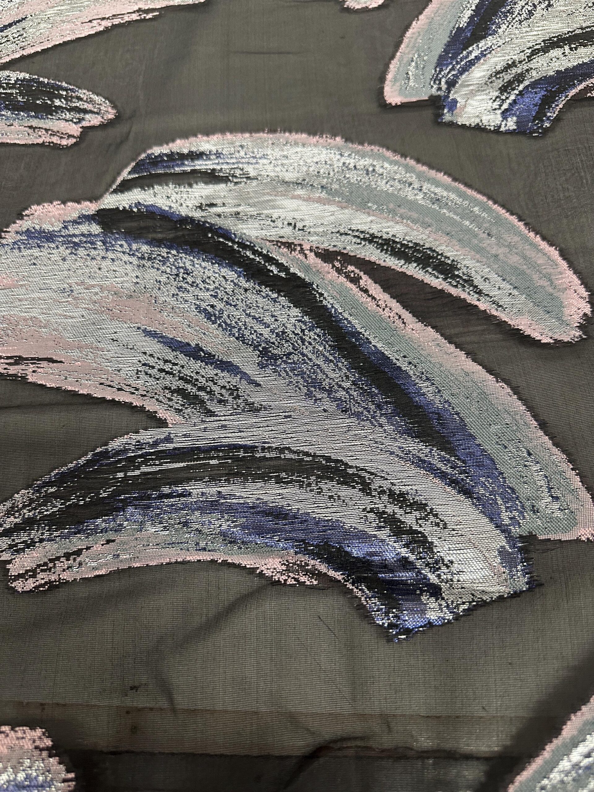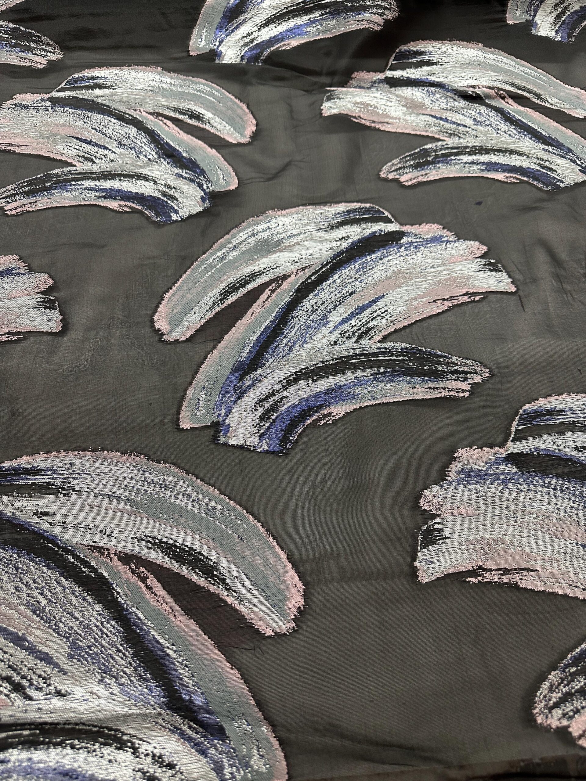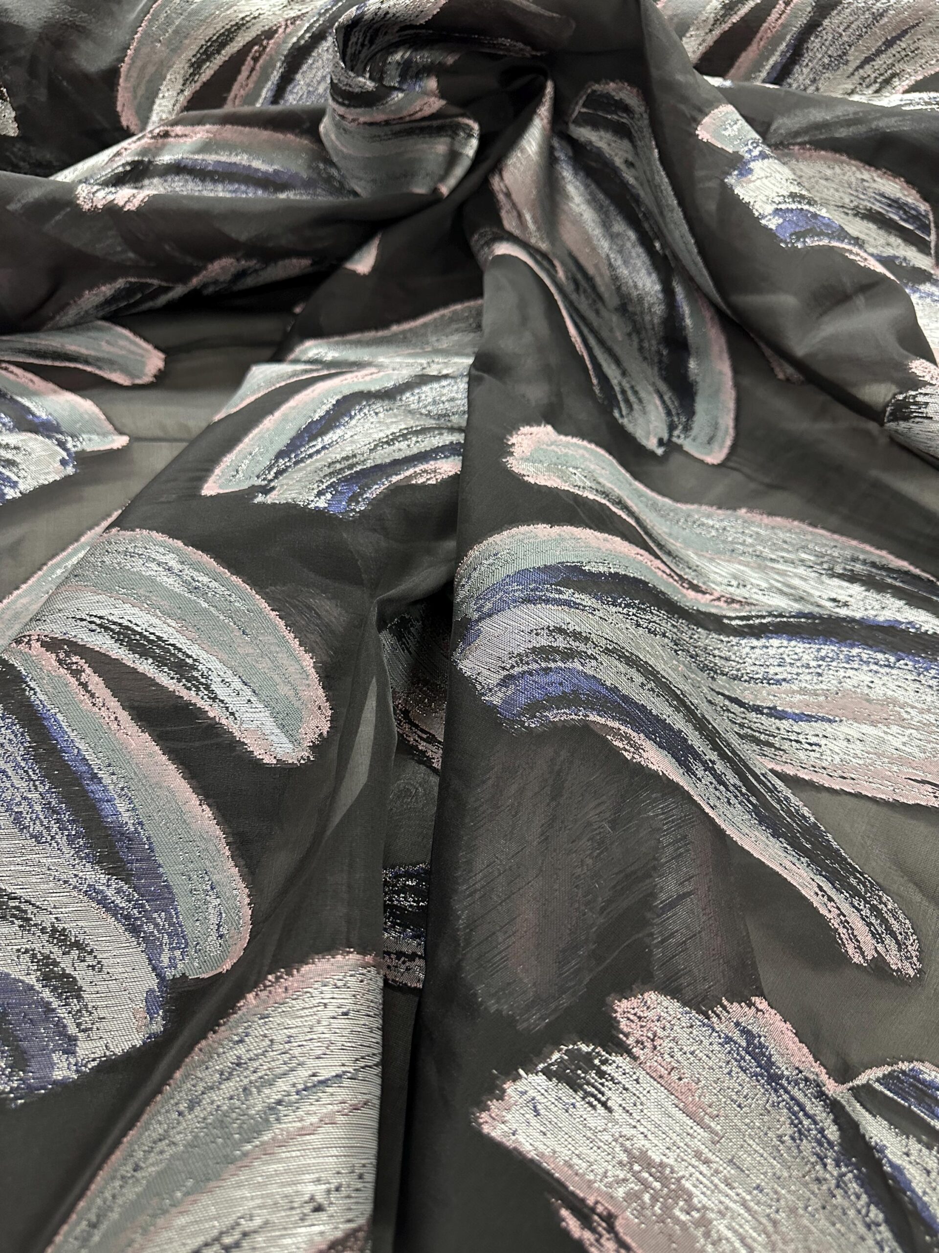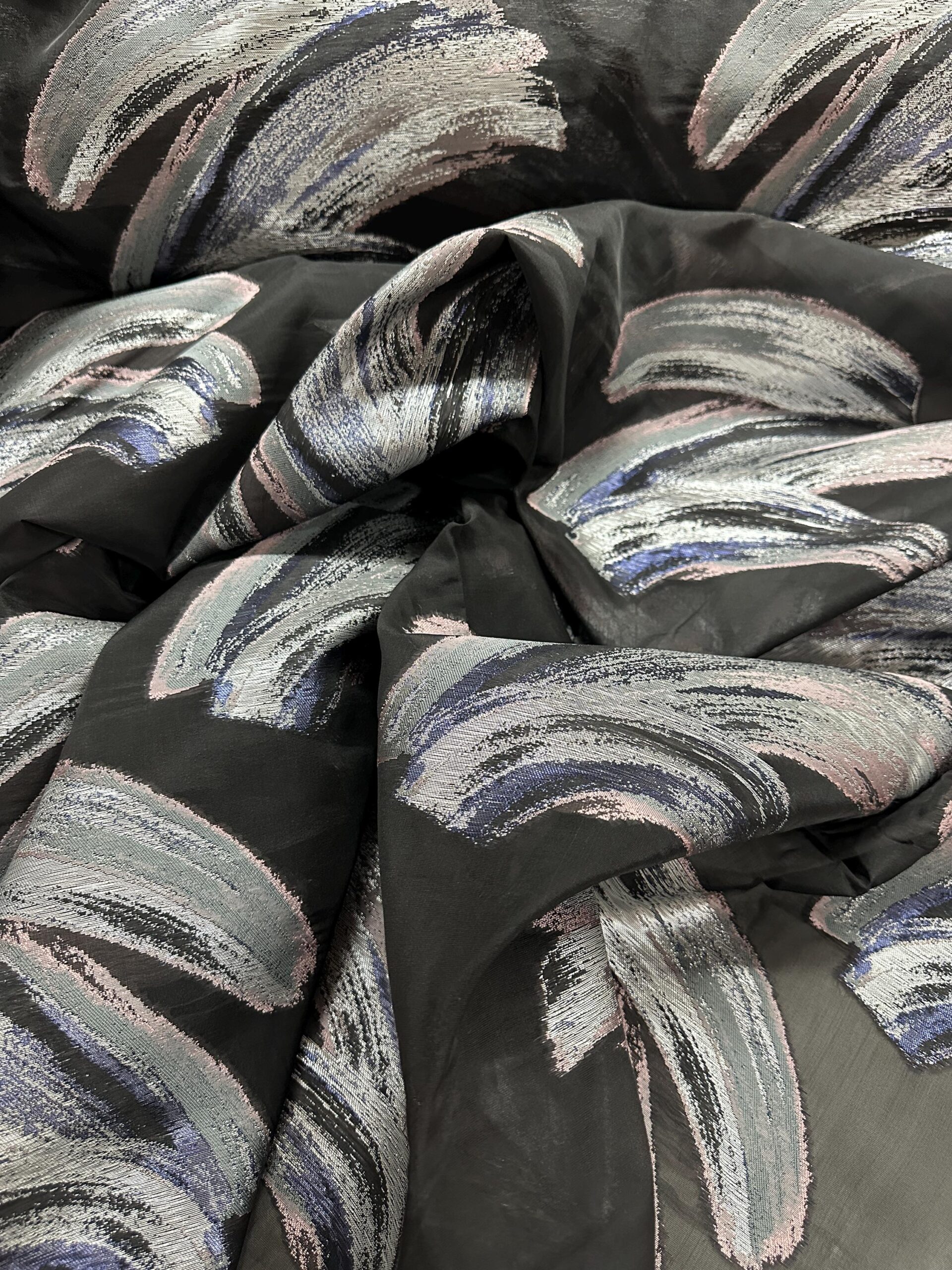 Add sophistication and modern artistry to your designs with this Black Metallic Organza Brocade Fabric. This luxurious material blends the lightweight, sheer elegance of organza with the intricate texture of brocade. The abstract brushstroke pattern shimmers in tones of silver, gray, blue, and soft pink, catching light with a subtle iridescent glow.