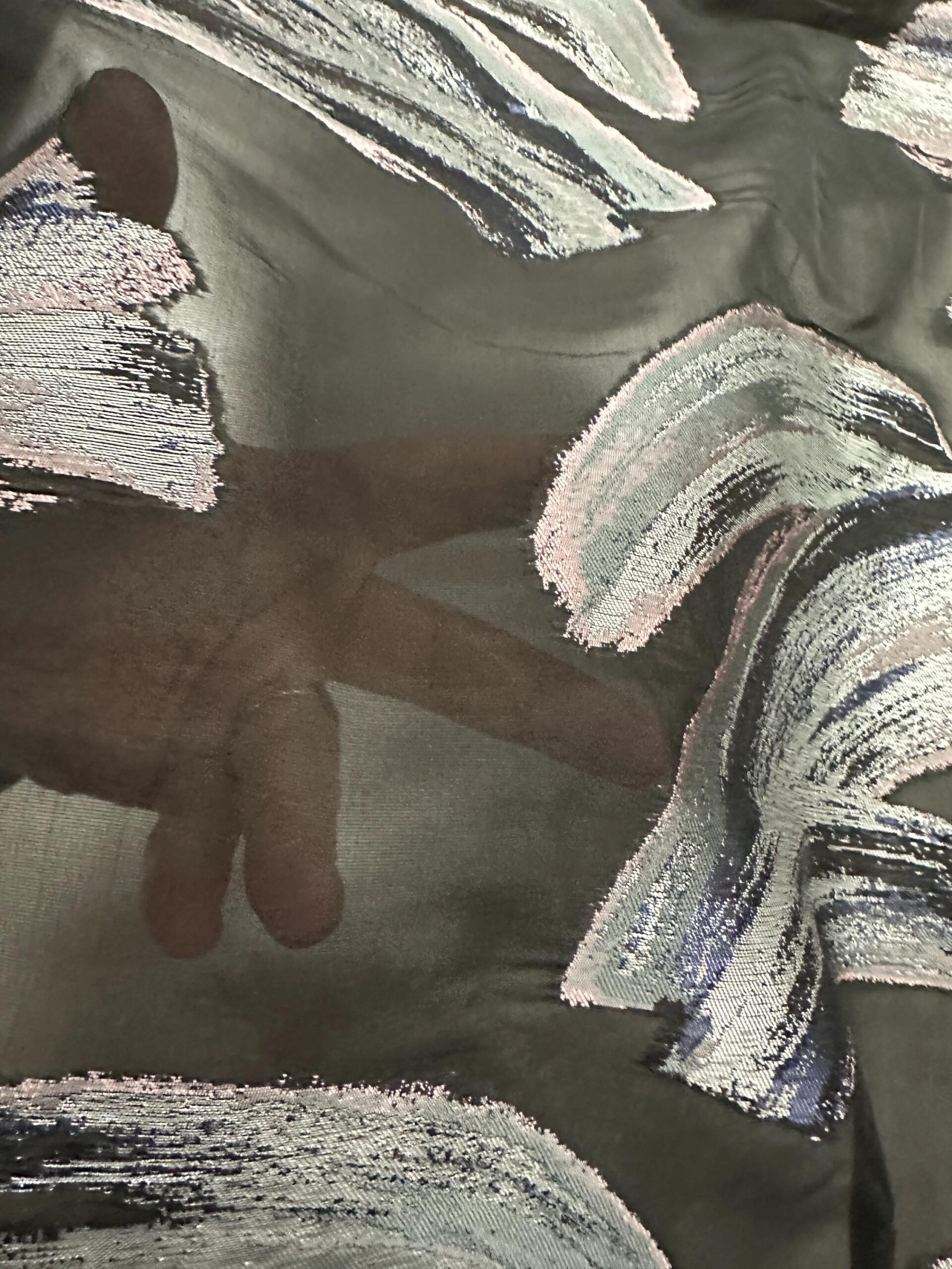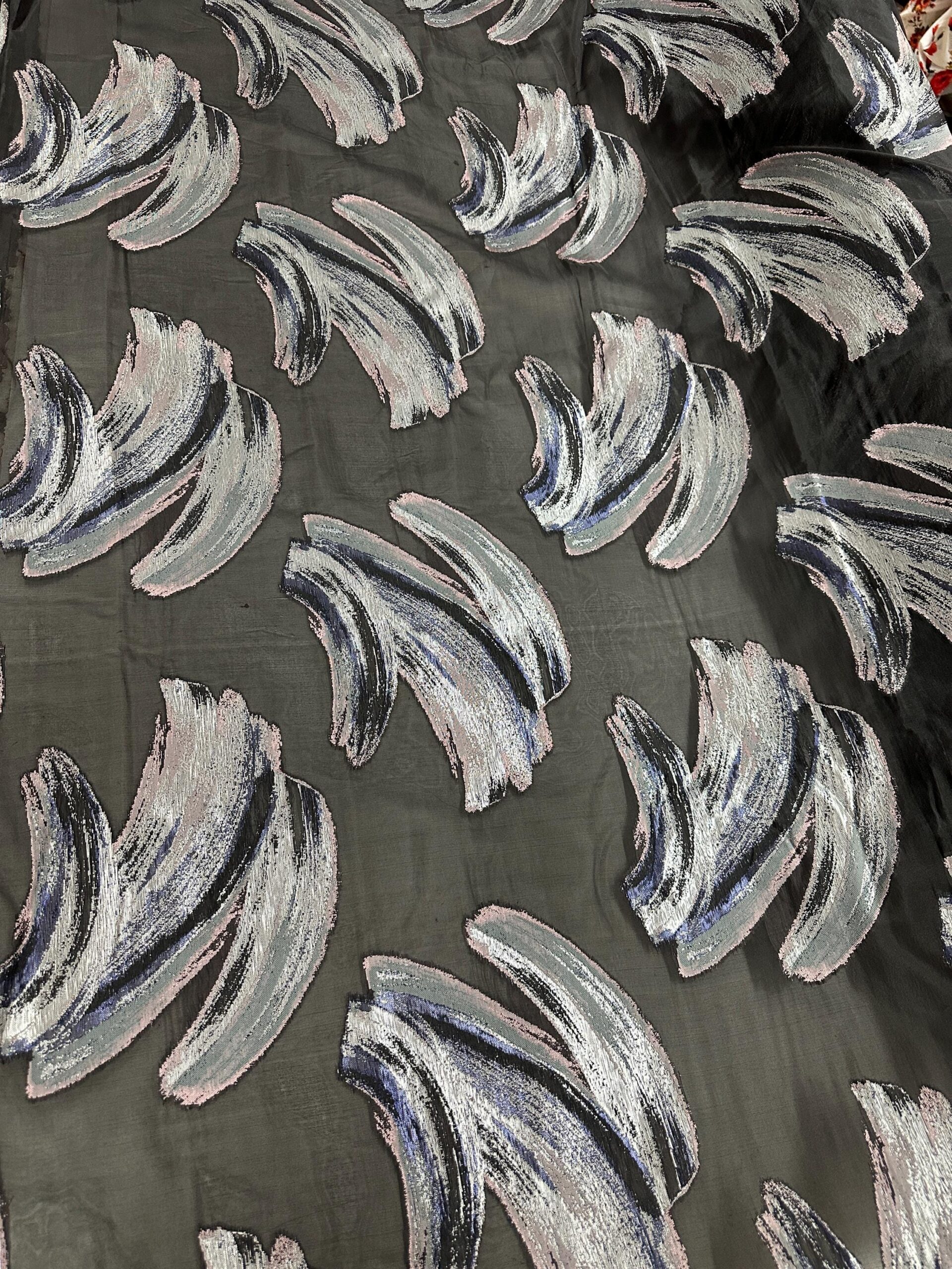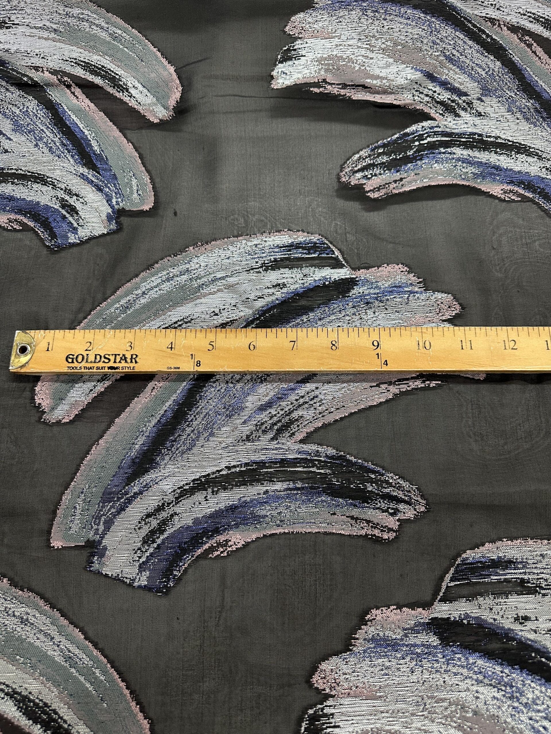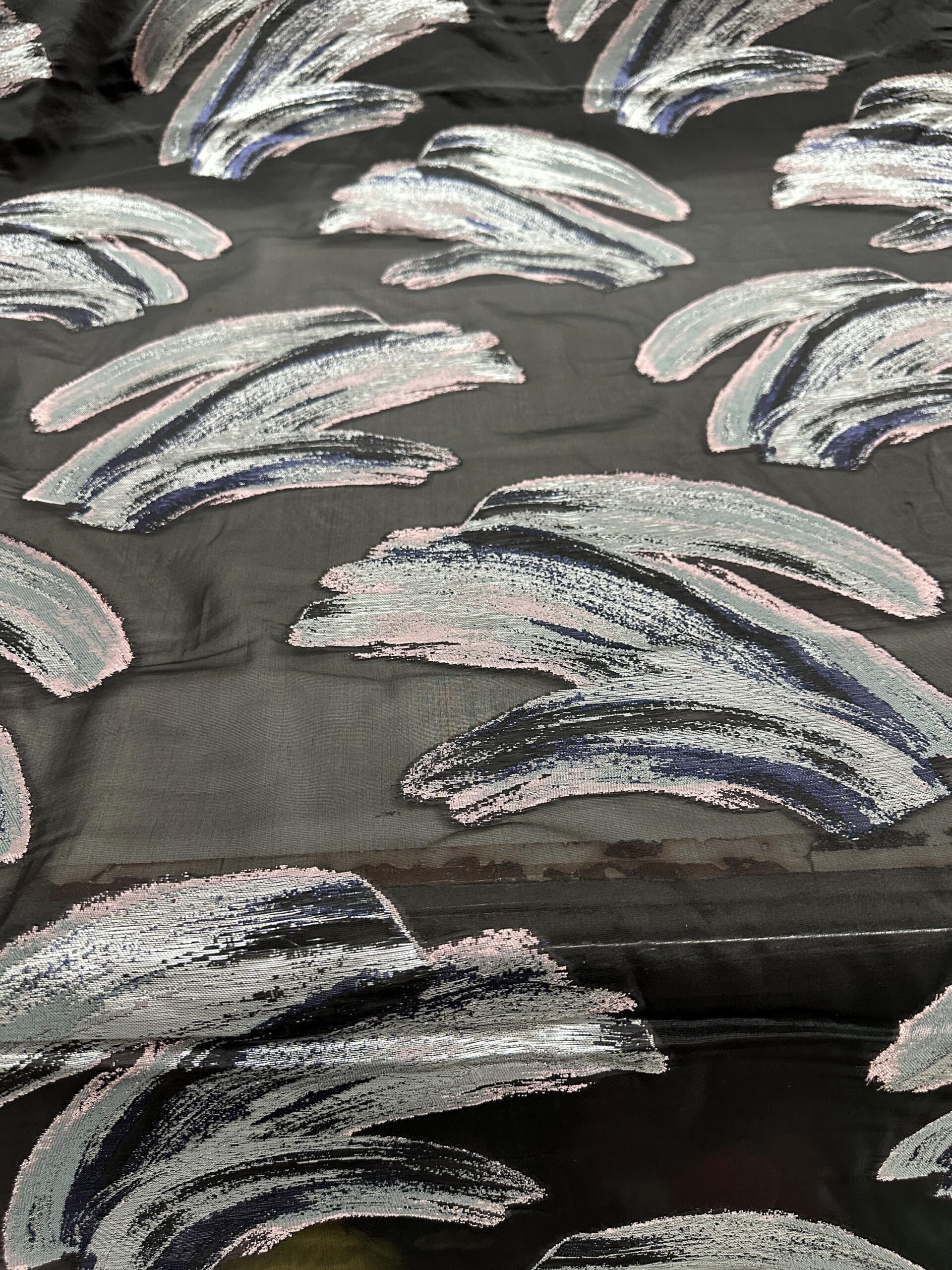 Add sophistication and modern artistry to your designs with this Black Metallic Organza Brocade Fabric. This luxurious material blends the lightweight, sheer elegance of organza with the intricate texture of brocade. The abstract brushstroke pattern shimmers in tones of silver, gray, blue, and soft pink, catching light with a subtle iridescent glow.