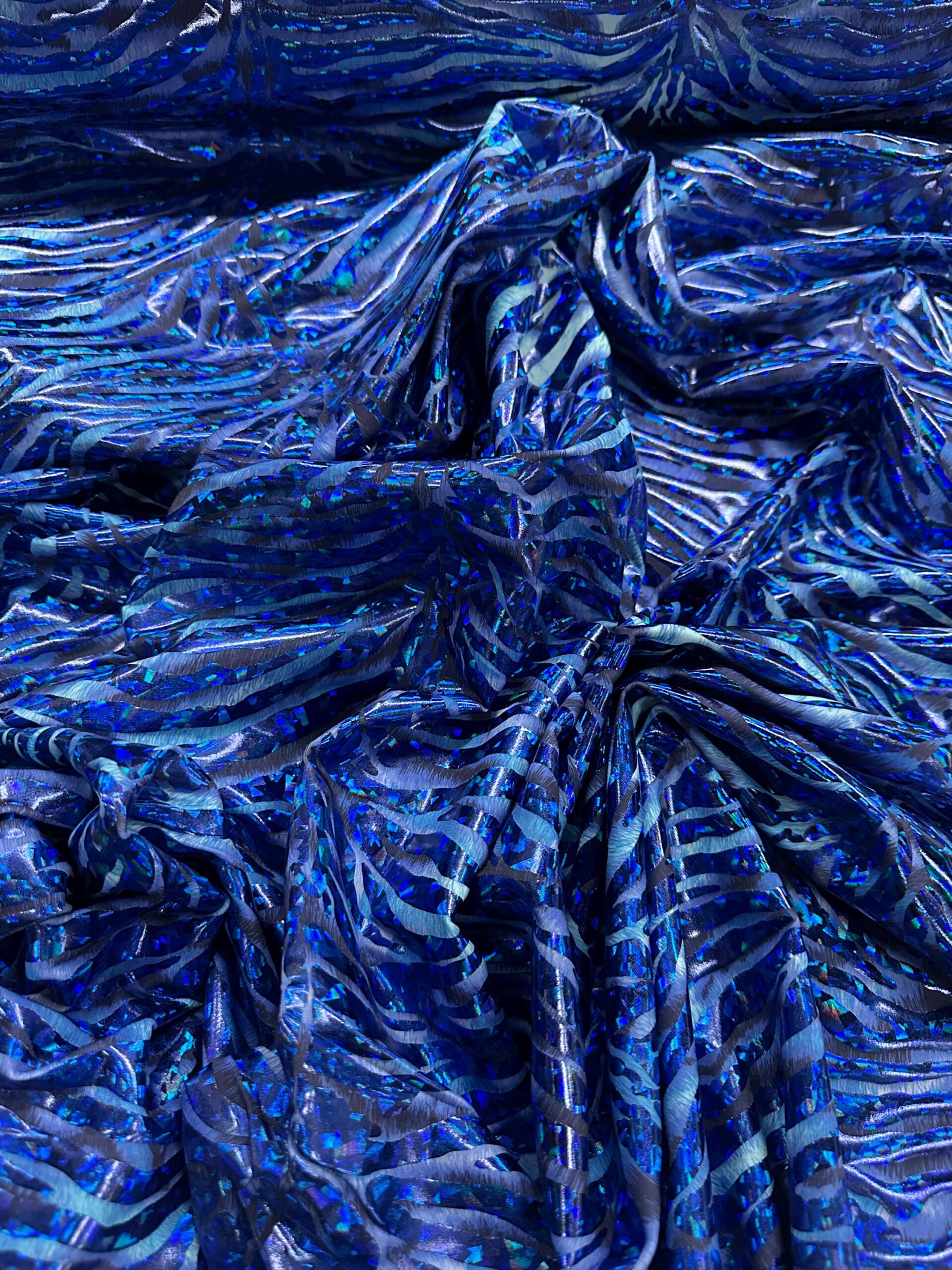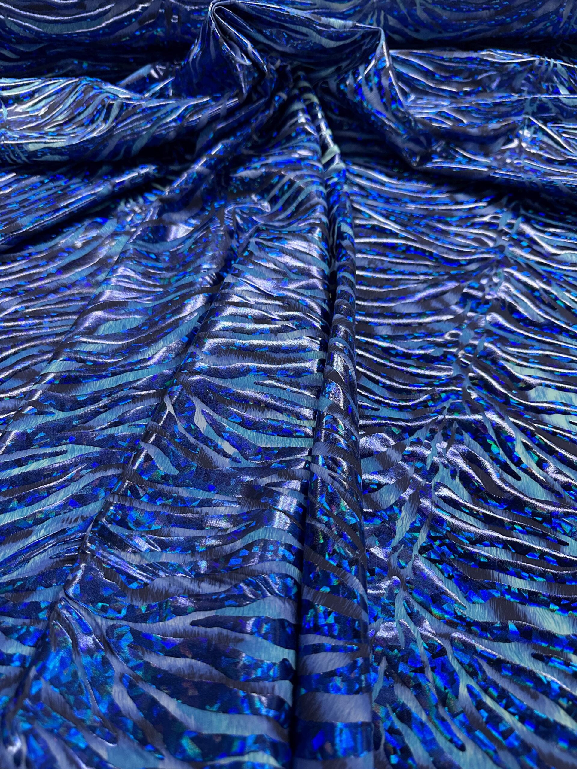 Make your next creation stand out with this Blue Holographic Zebra Print 4-Way Stretch Spandex Fabric. Featuring an electrifying mix of metallic blue tones with a zebra-inspired pattern, this fabric reflects light beautifully and provides excellent stretch in all directions.