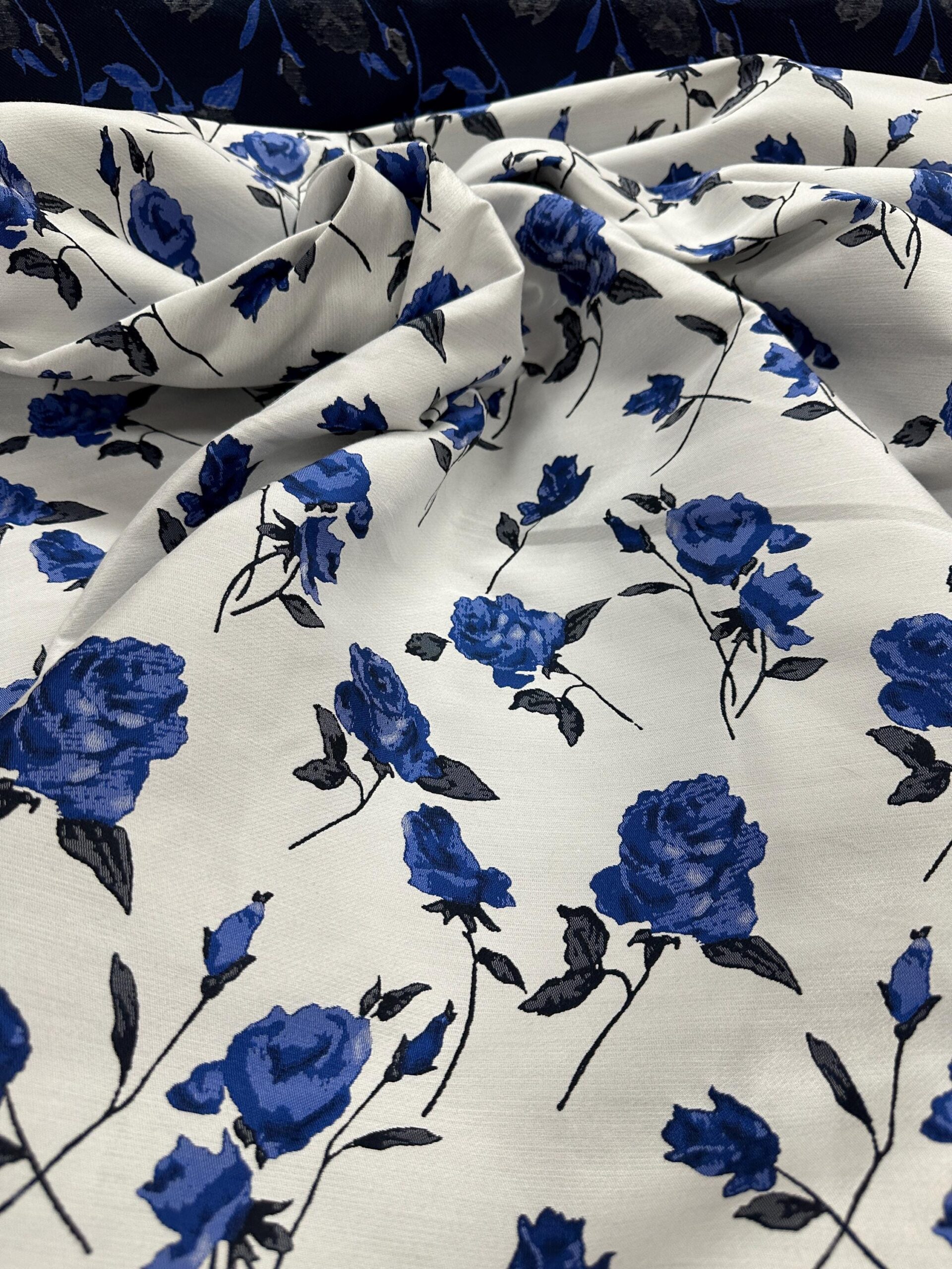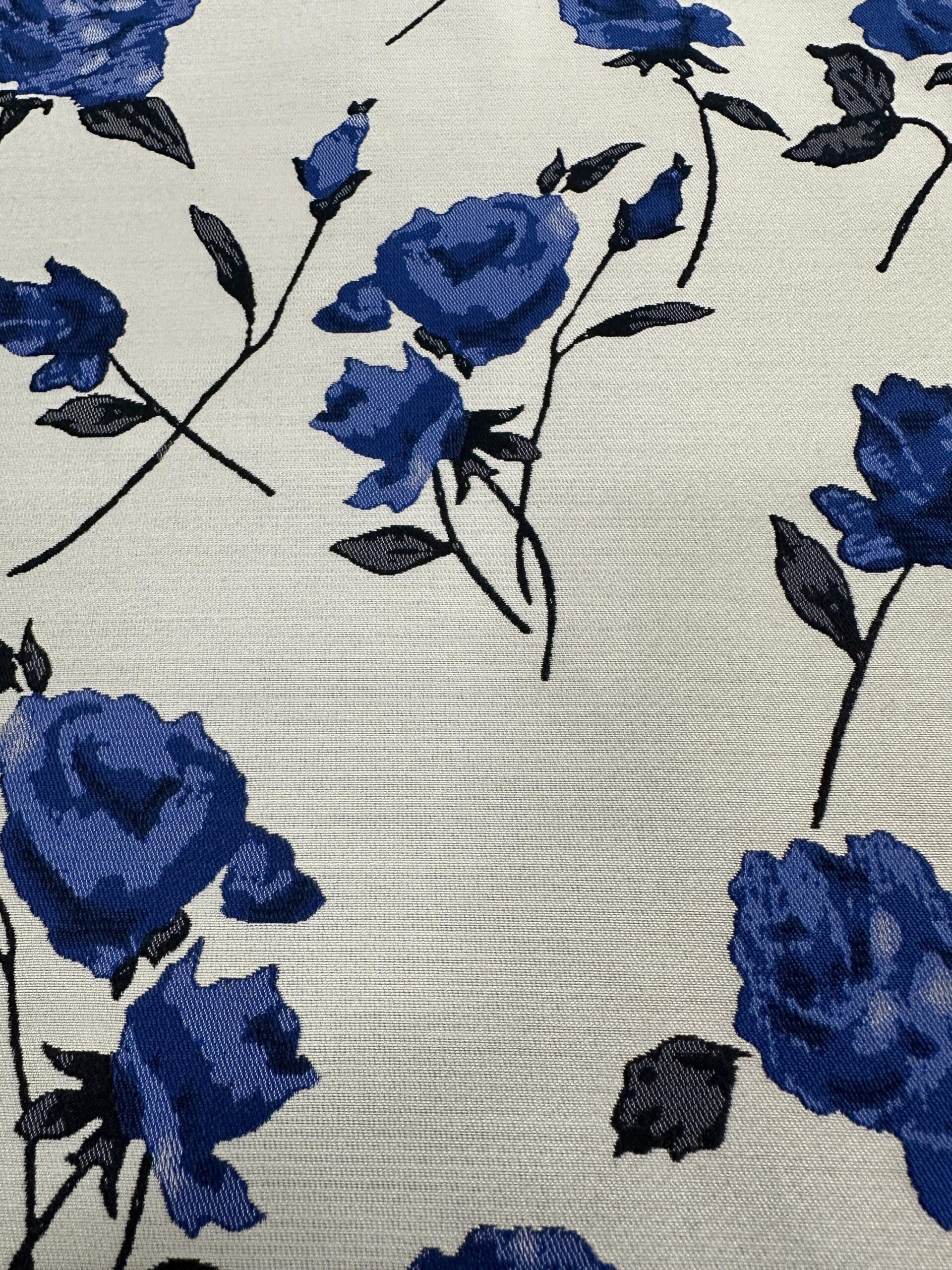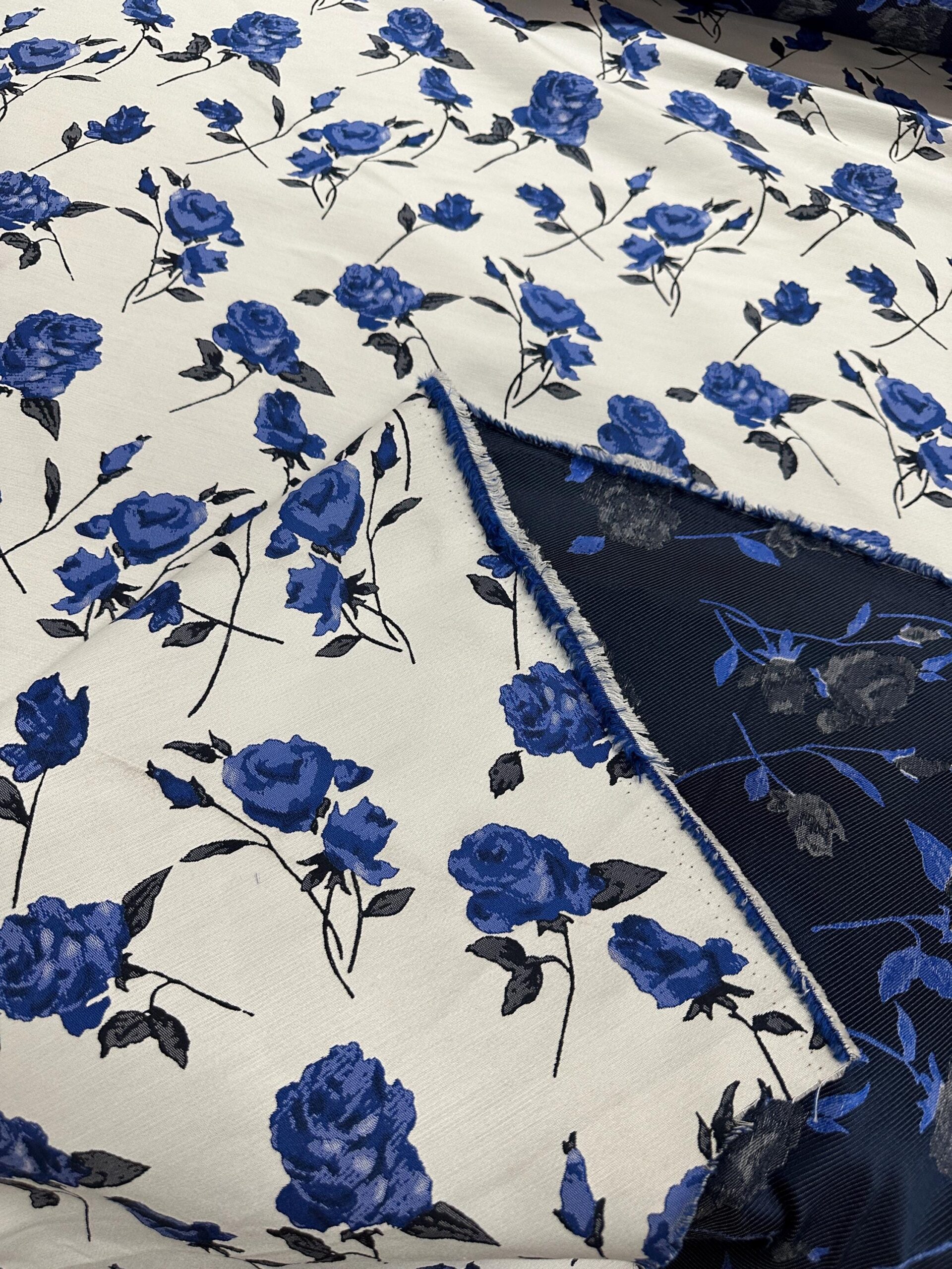 This Blue Floral Brocade Fabric combines timeless beauty with luxurious texture. Woven with a delicate rose pattern in rich blue and black tones on a crisp white base, it offers both sophistication and depth. The jacquard weave creates a subtle sheen and raised floral texture that catches the light beautifully.