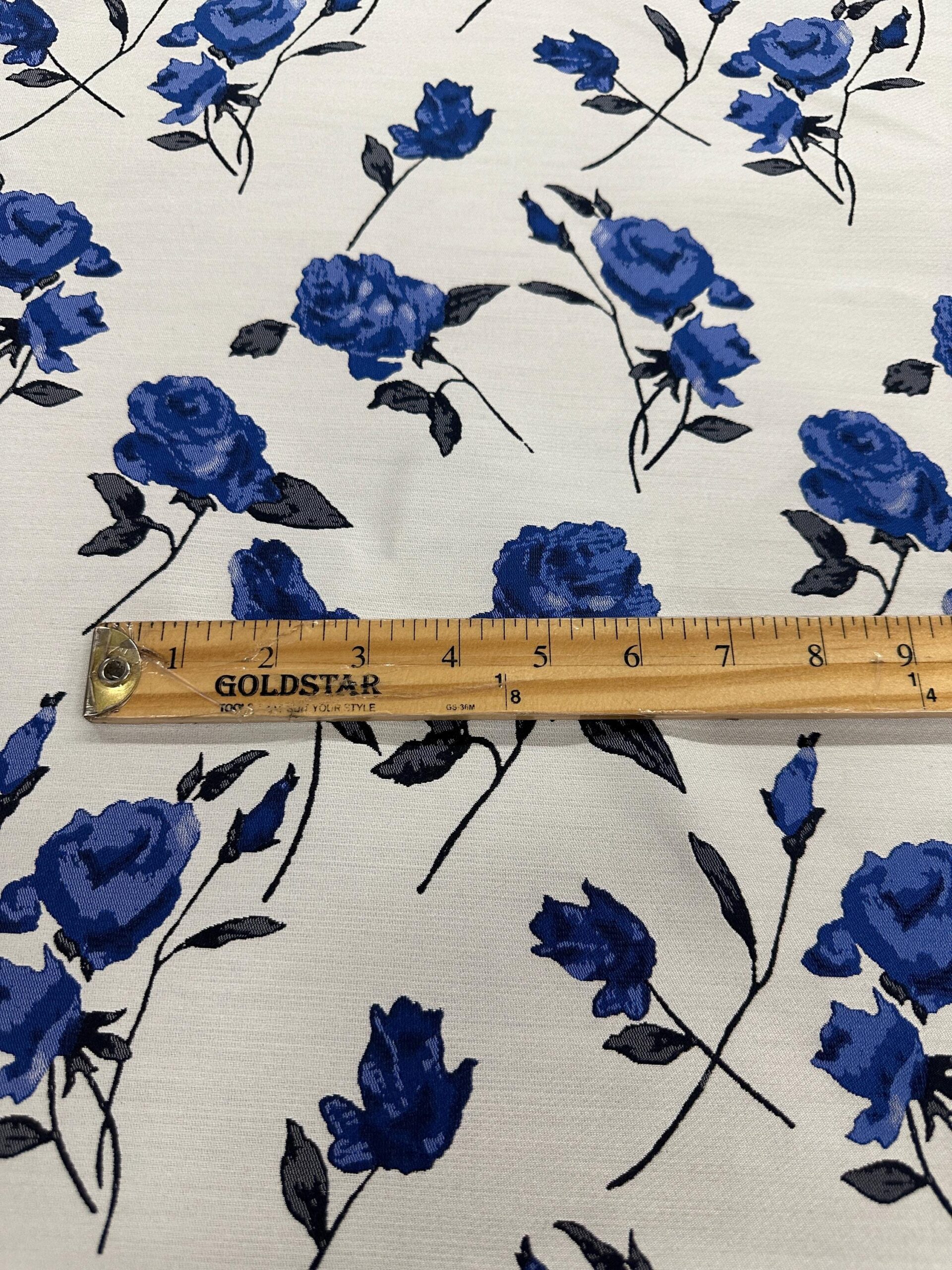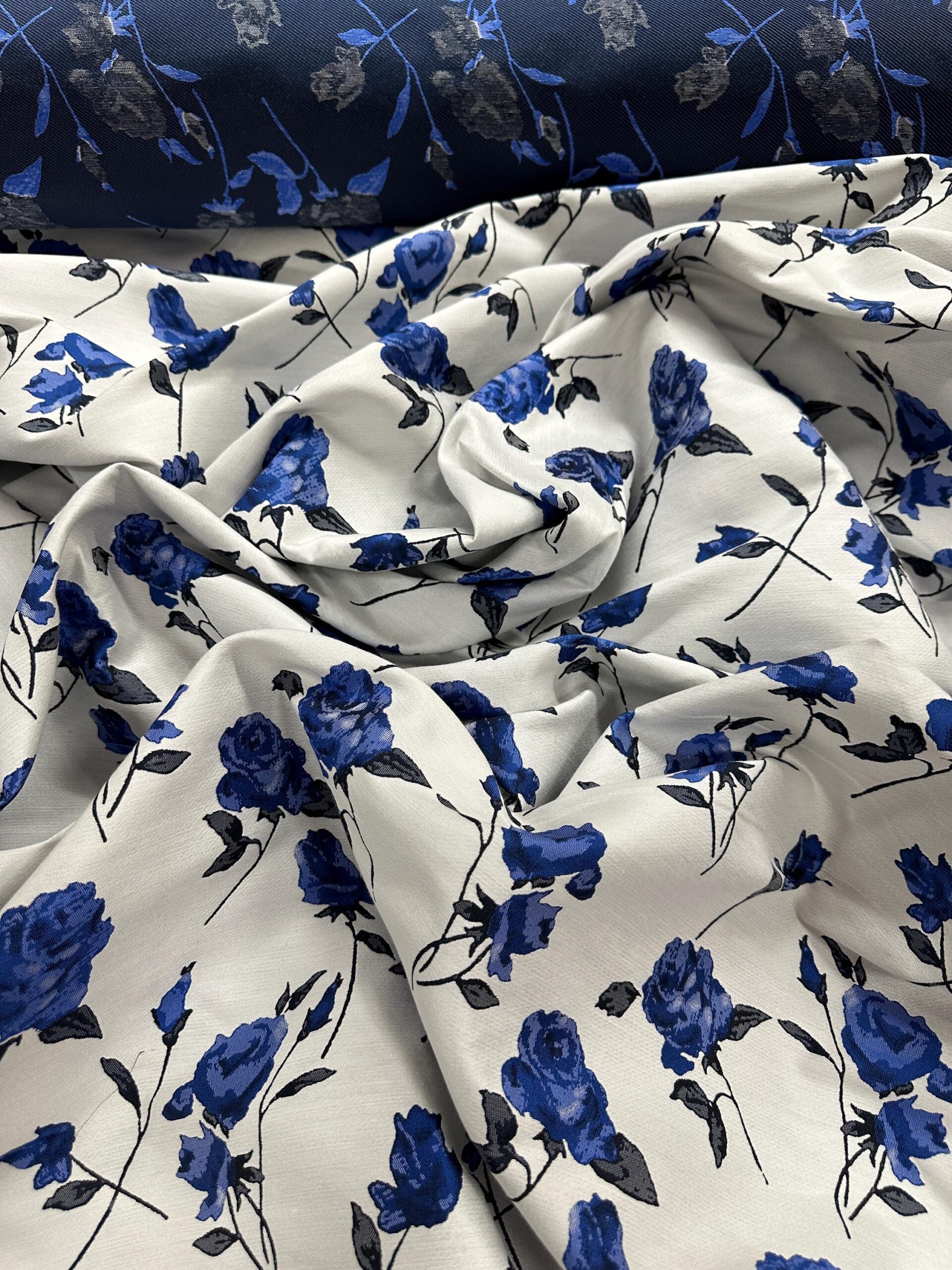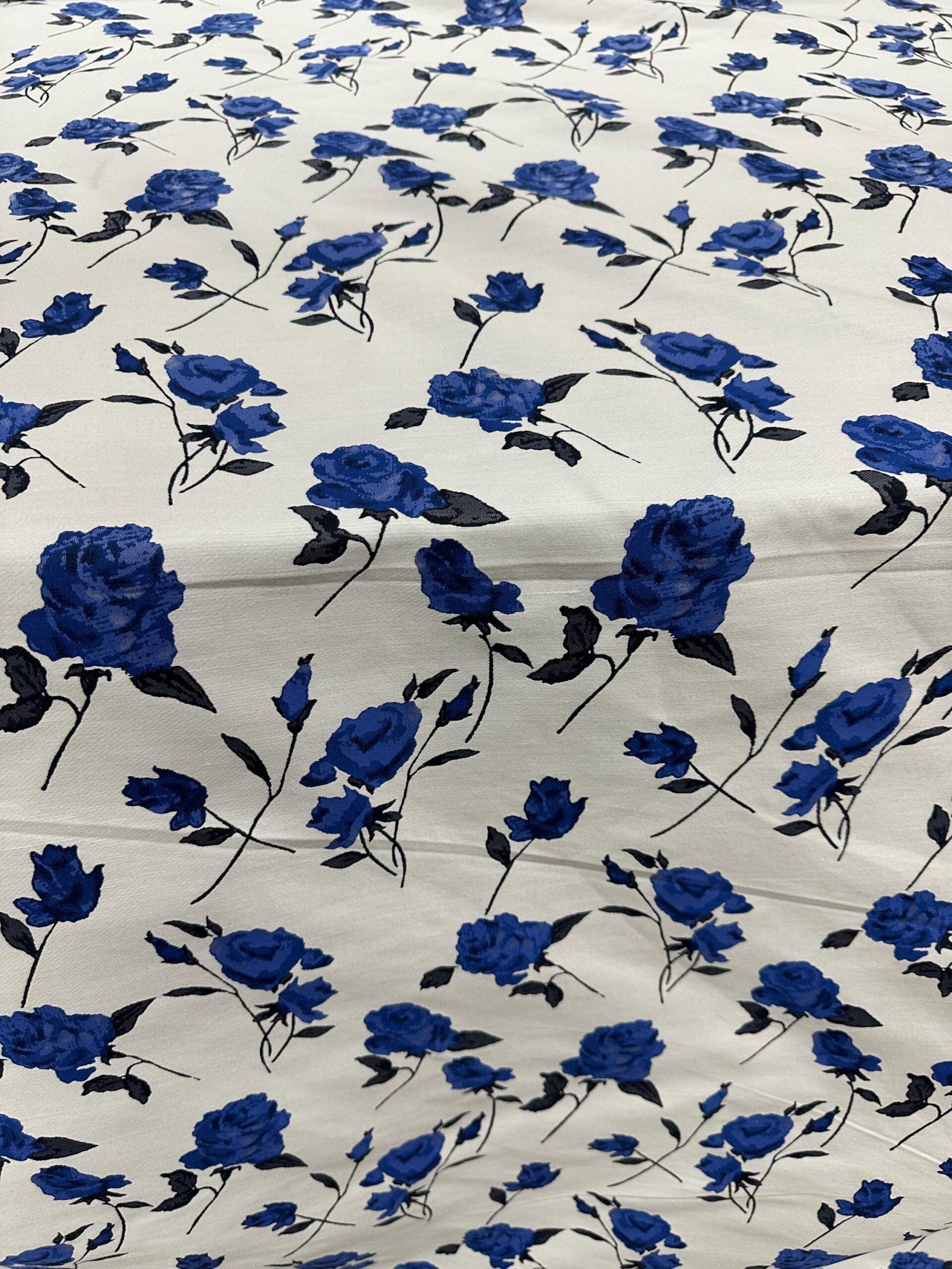 This Blue Floral Brocade Fabric combines timeless beauty with luxurious texture. Woven with a delicate rose pattern in rich blue and black tones on a crisp white base, it offers both sophistication and depth. The jacquard weave creates a subtle sheen and raised floral texture that catches the light beautifully.