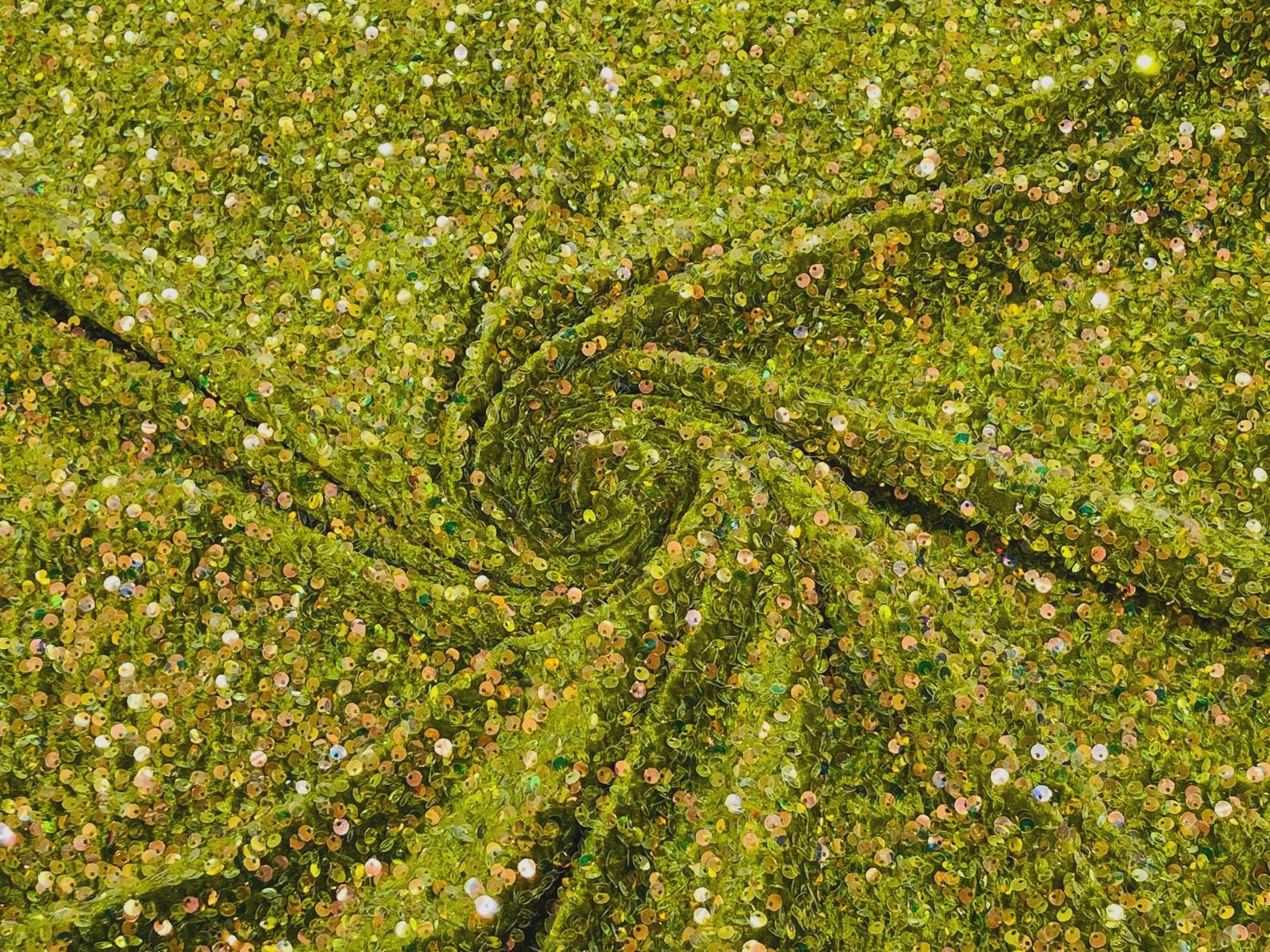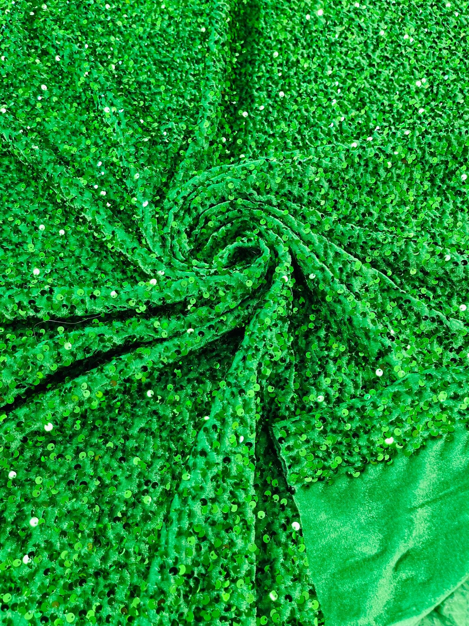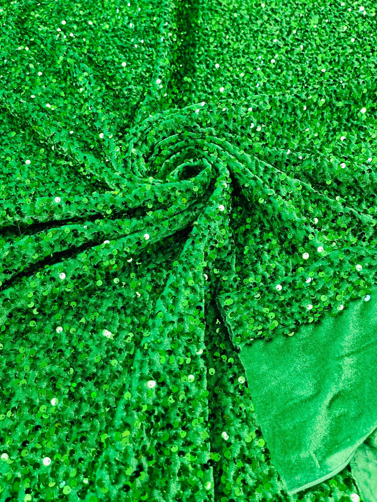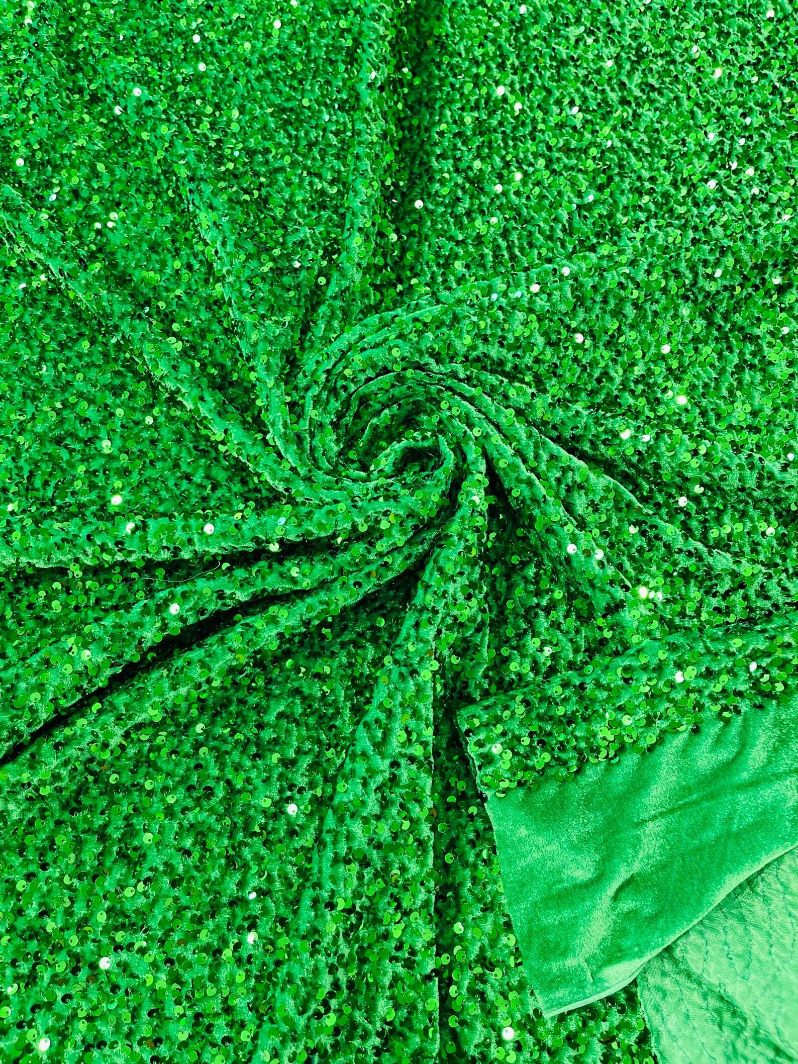 Add striking, vibrant shine to your creations with this Bright Green Sequin Velvet Fabric. This high-quality textile features a vivid green velvet base densely covered with matching reflective sequins, creating an intense sparkle under lights.