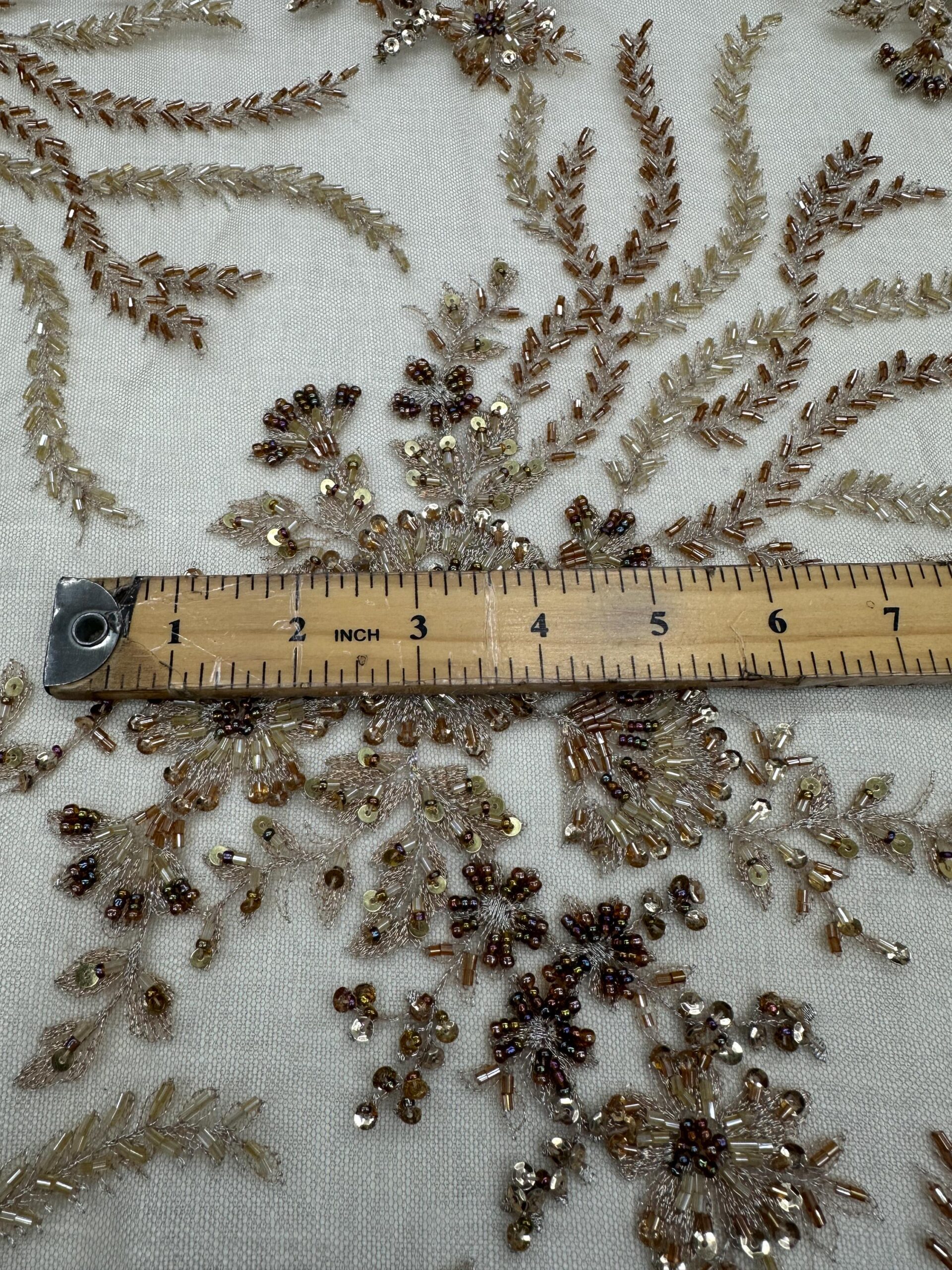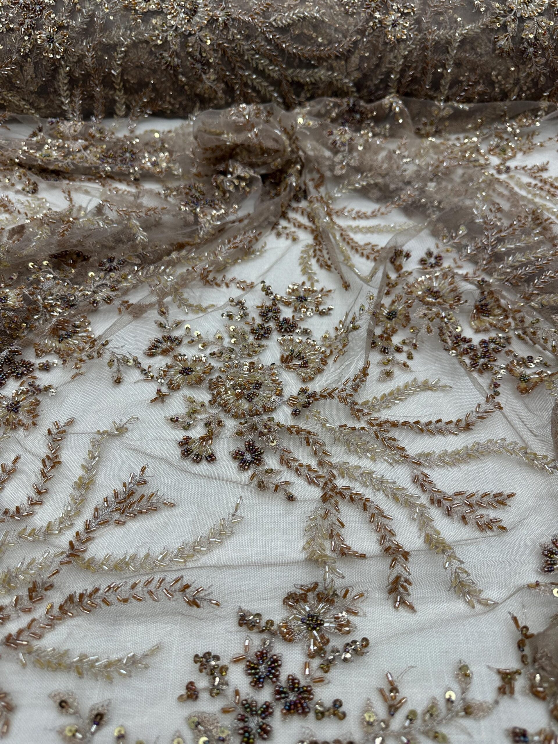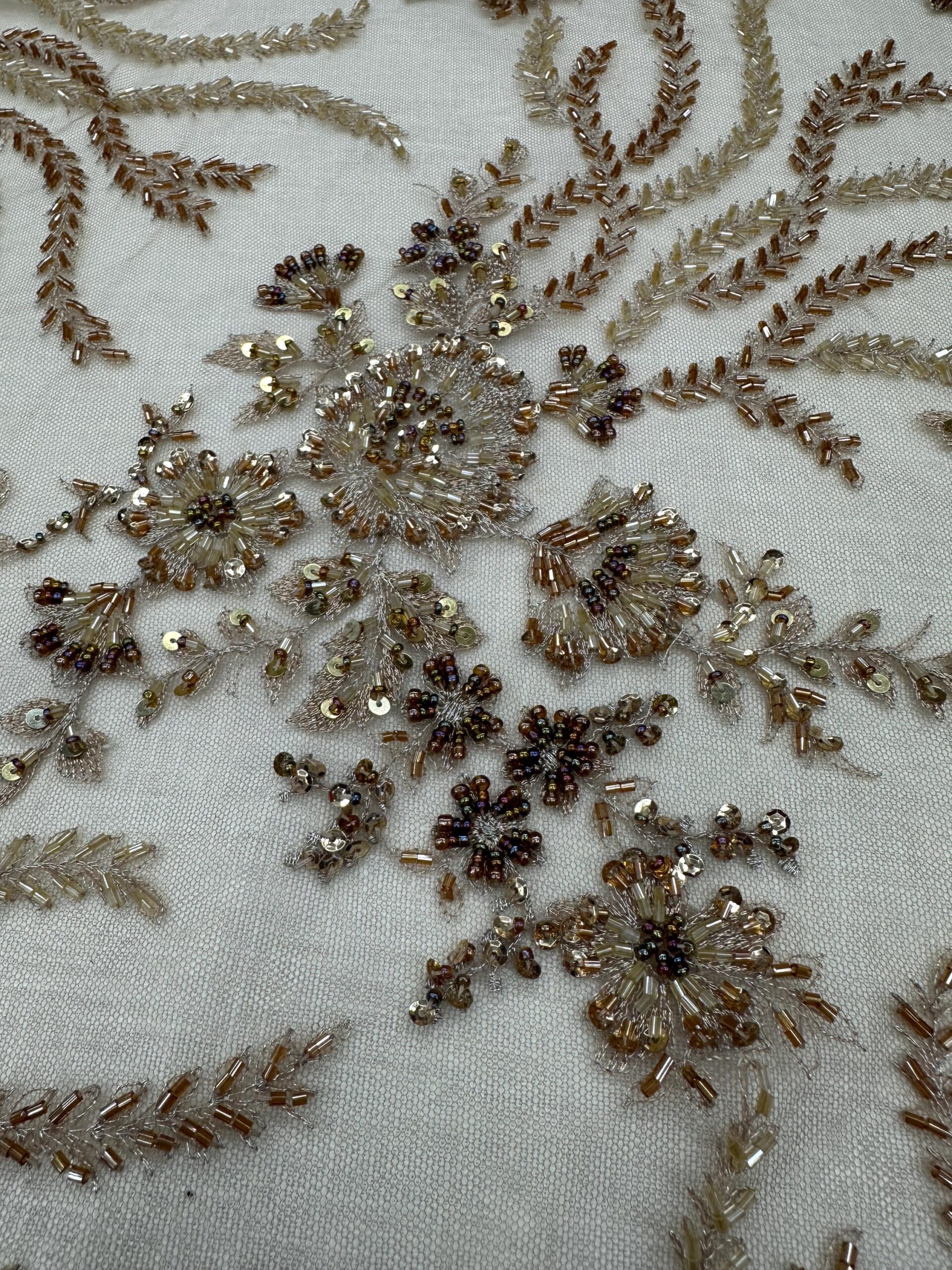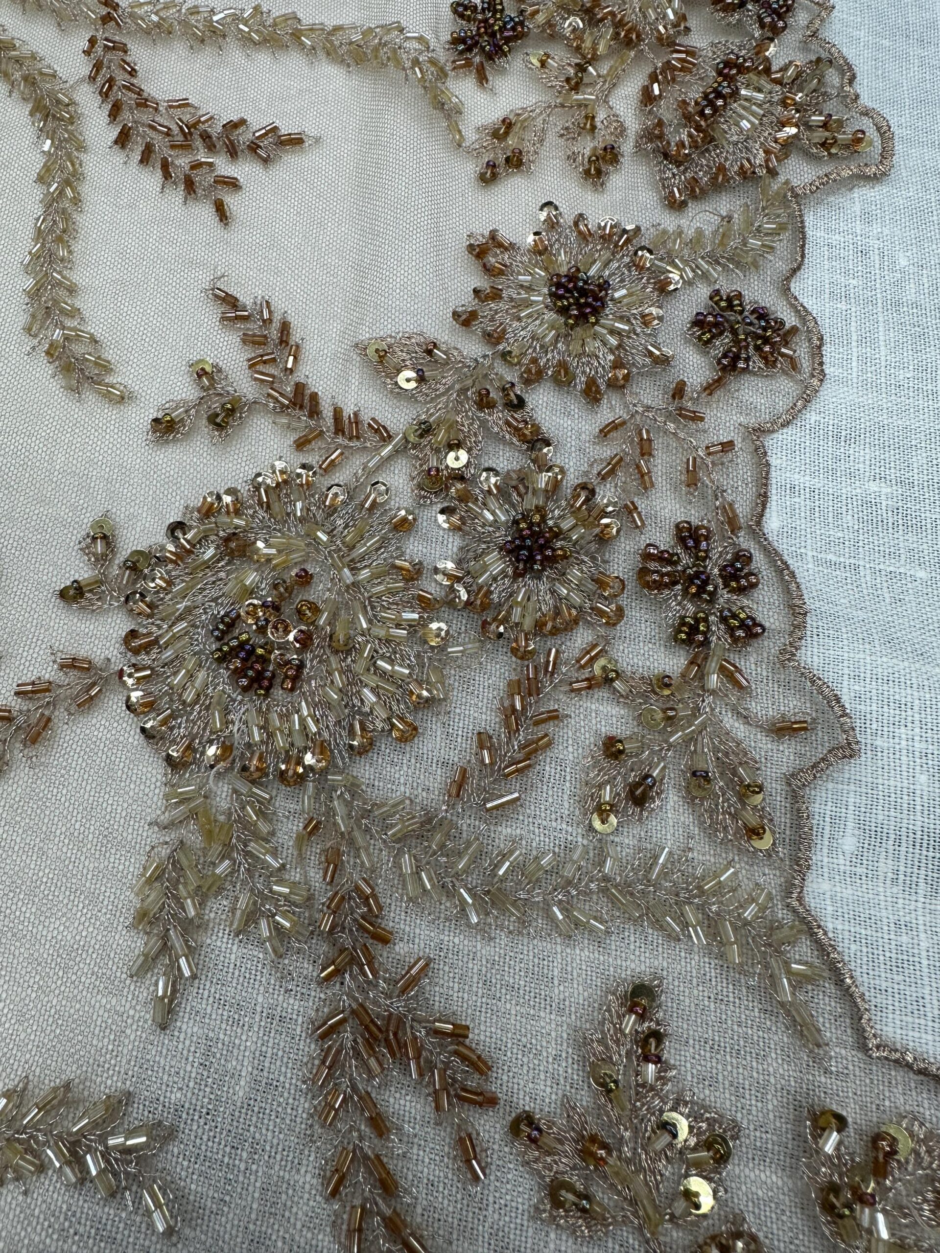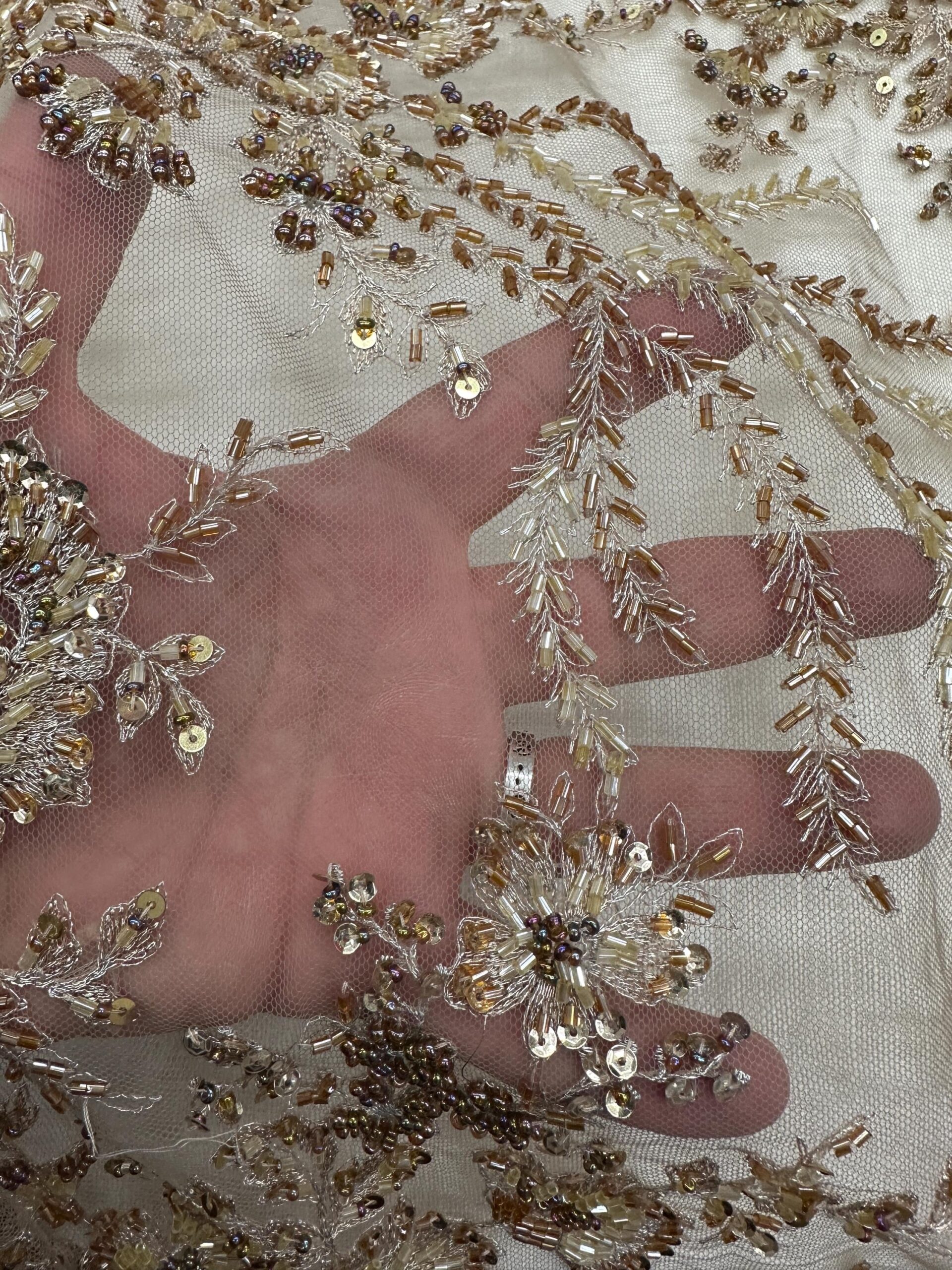 Bronze Gold Beaded Embroidered Lace Fabric on Mesh | 3D Pearls & Sequins | Wedding Lace by the Yard | Evening Gown, Bridal Overlay