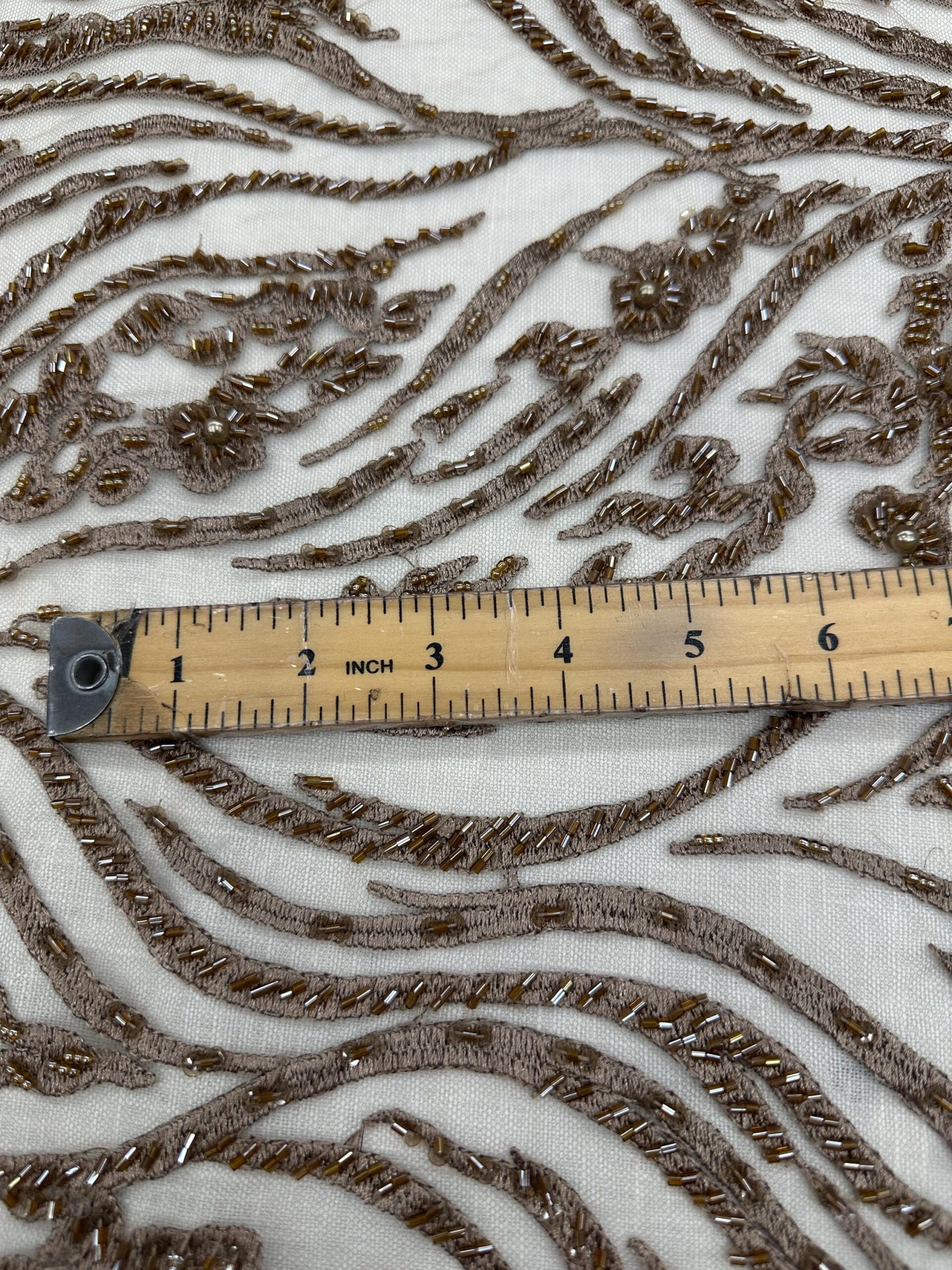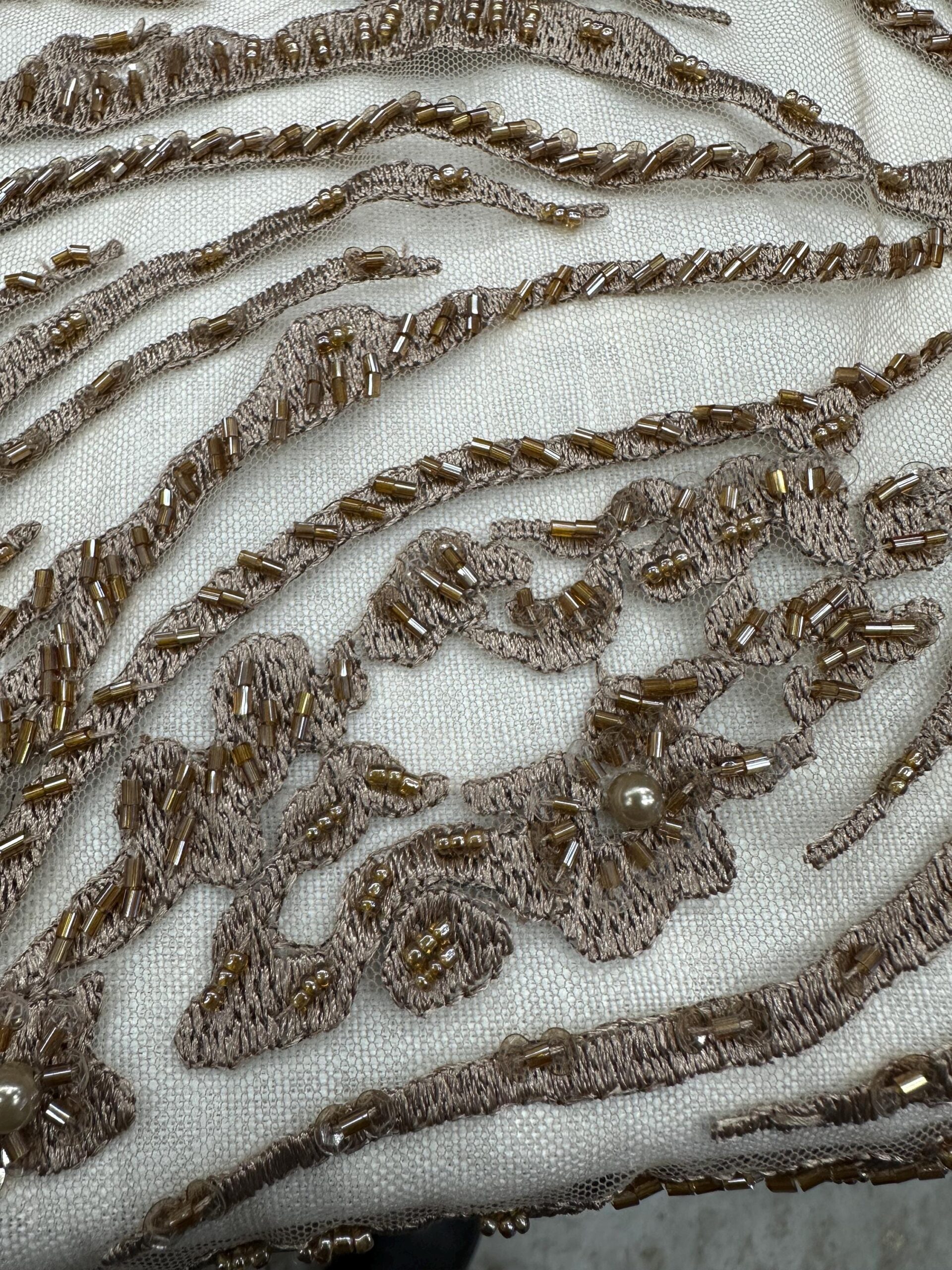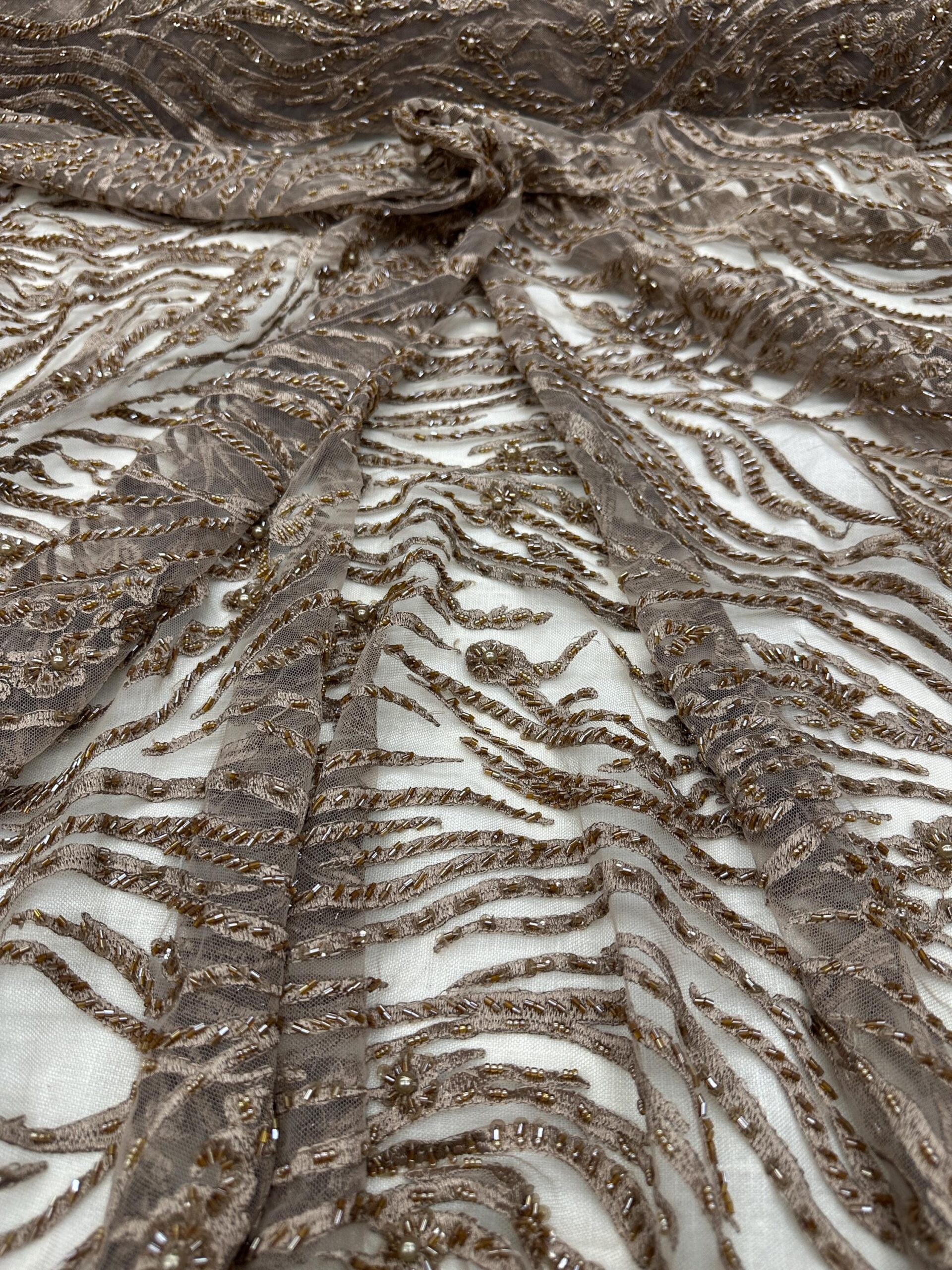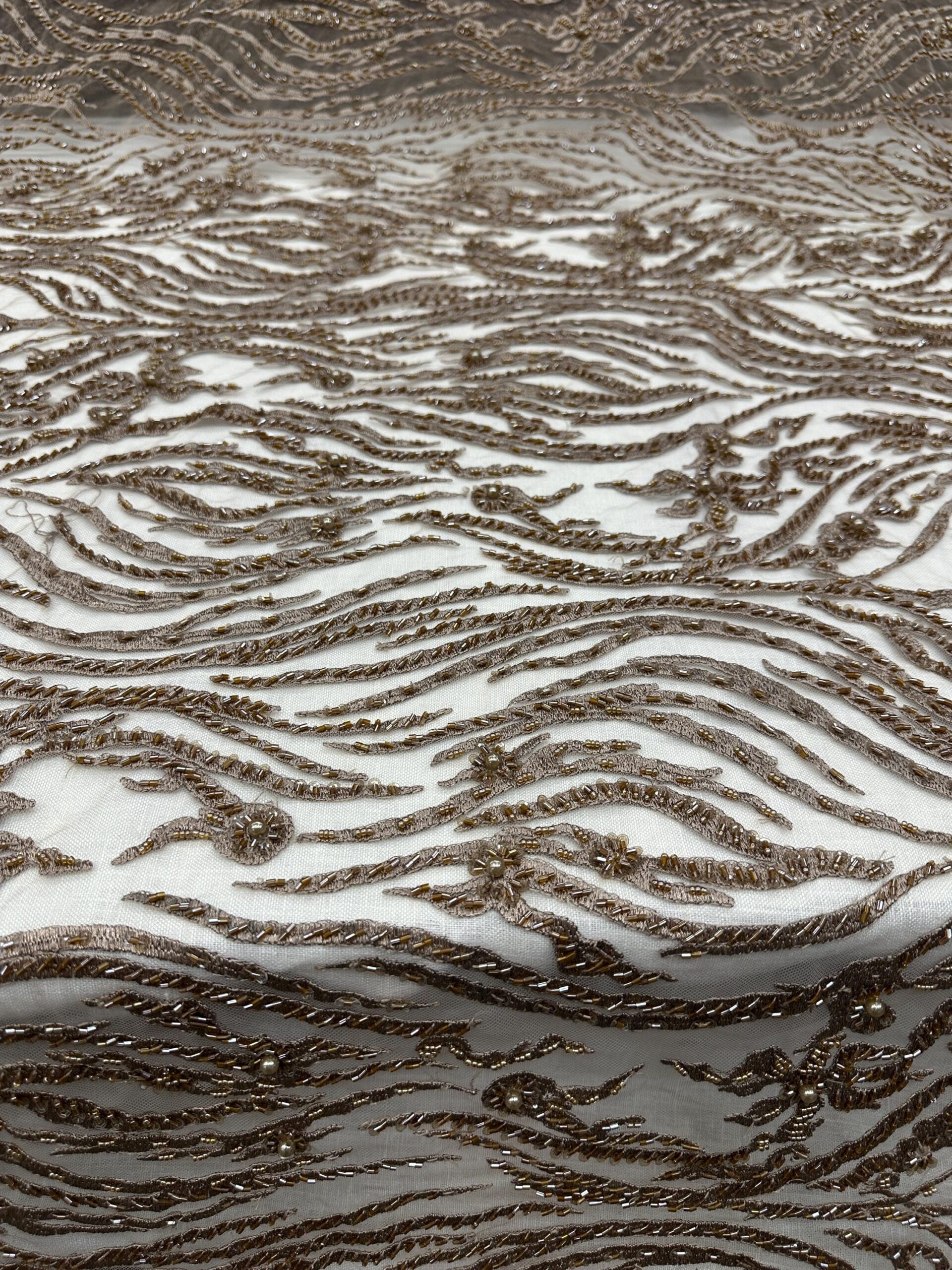 This stunning Bronze Gold Beaded Embroidered Lace Fabric is a true couture piece, featuring shimmering beadwork, sequins, pearls, and delicate floral accents. The embroidery flows in elegant wave-like patterns over a soft mesh base, giving the fabric rich dimension and movement.