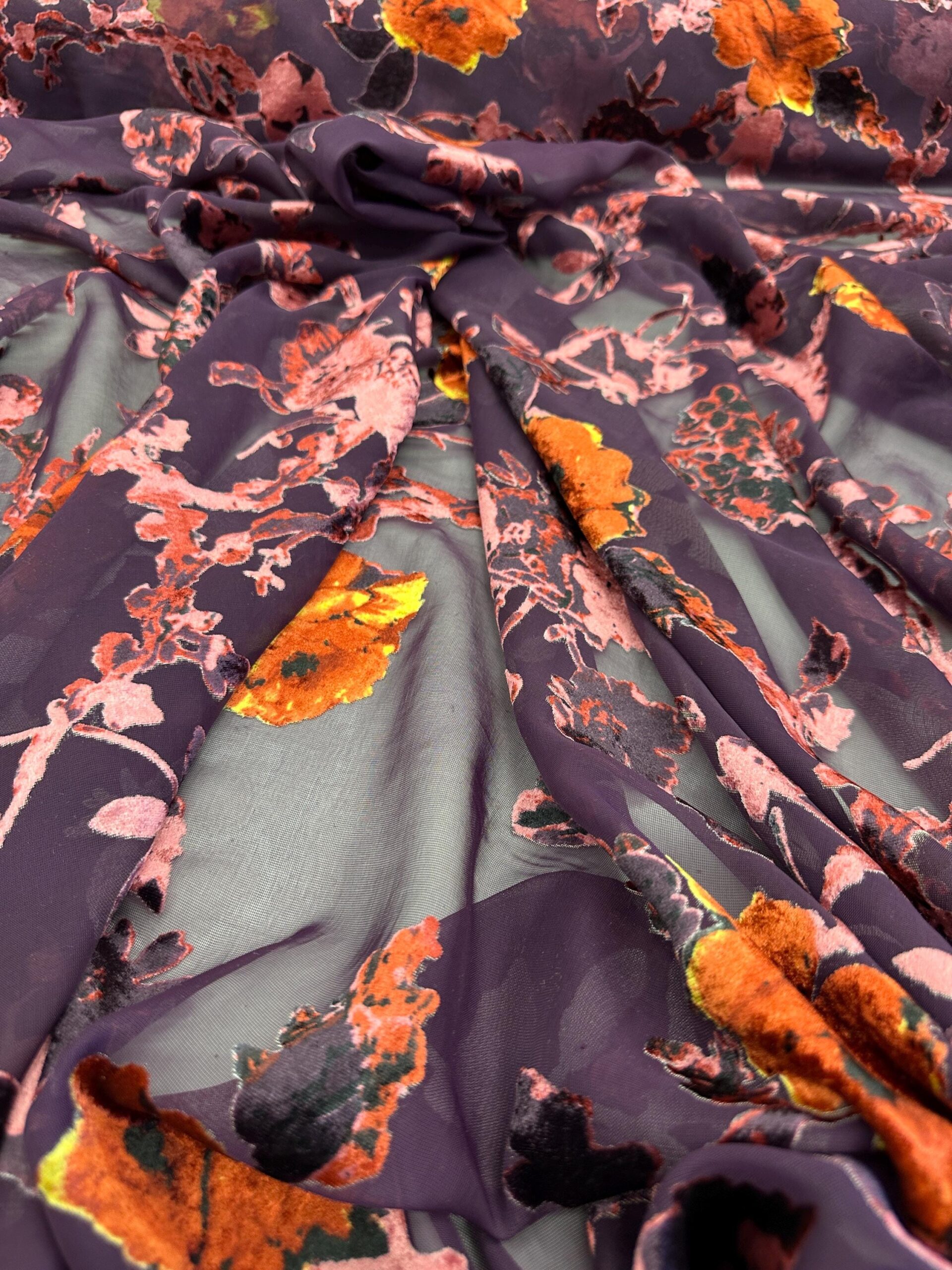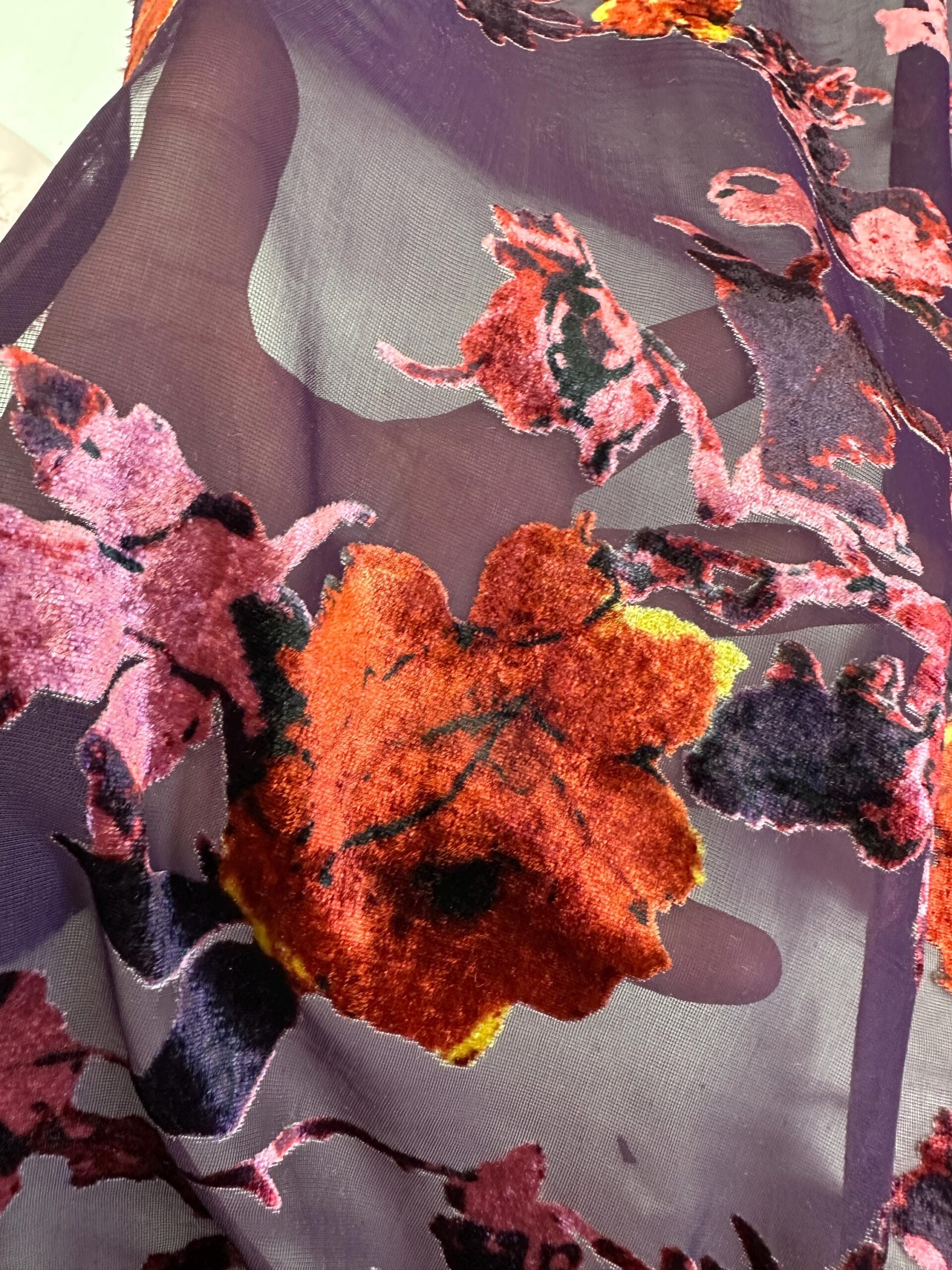 chiffon bernard jacard eggplant basic color with the flower multy color 60″width