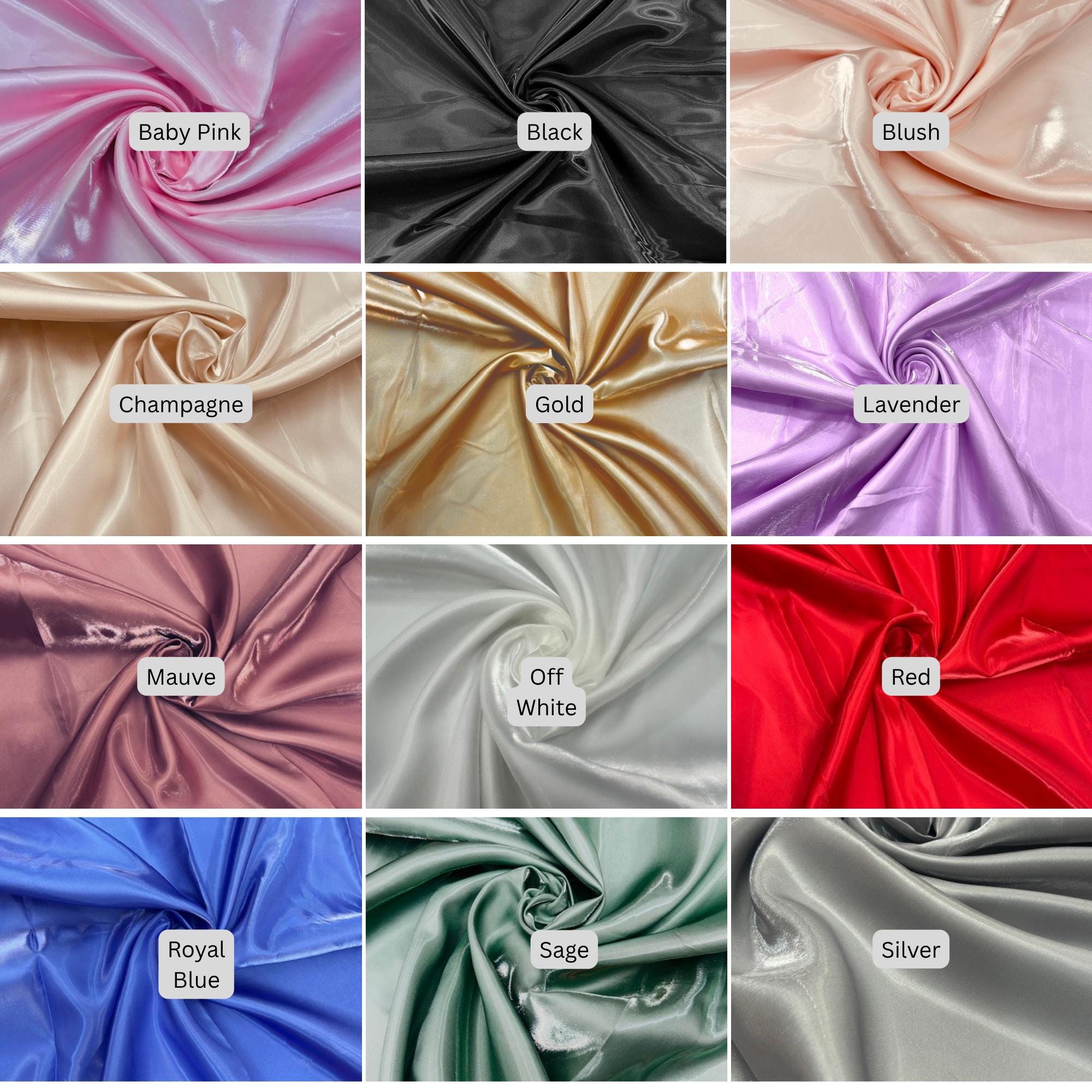 Baby Pink, Black, Blush, Champagne, Gold, Lavender, Mauve, Off White, Red, Royal Blue, Sage, Silver, White