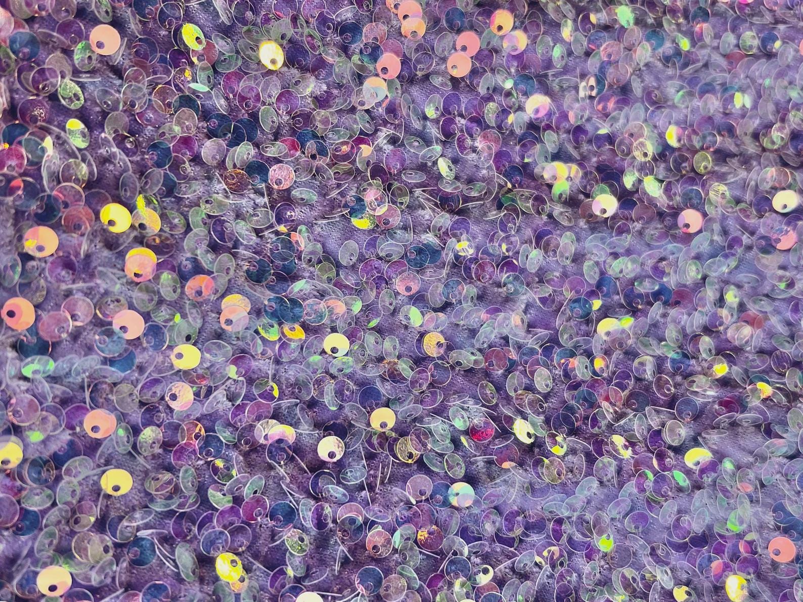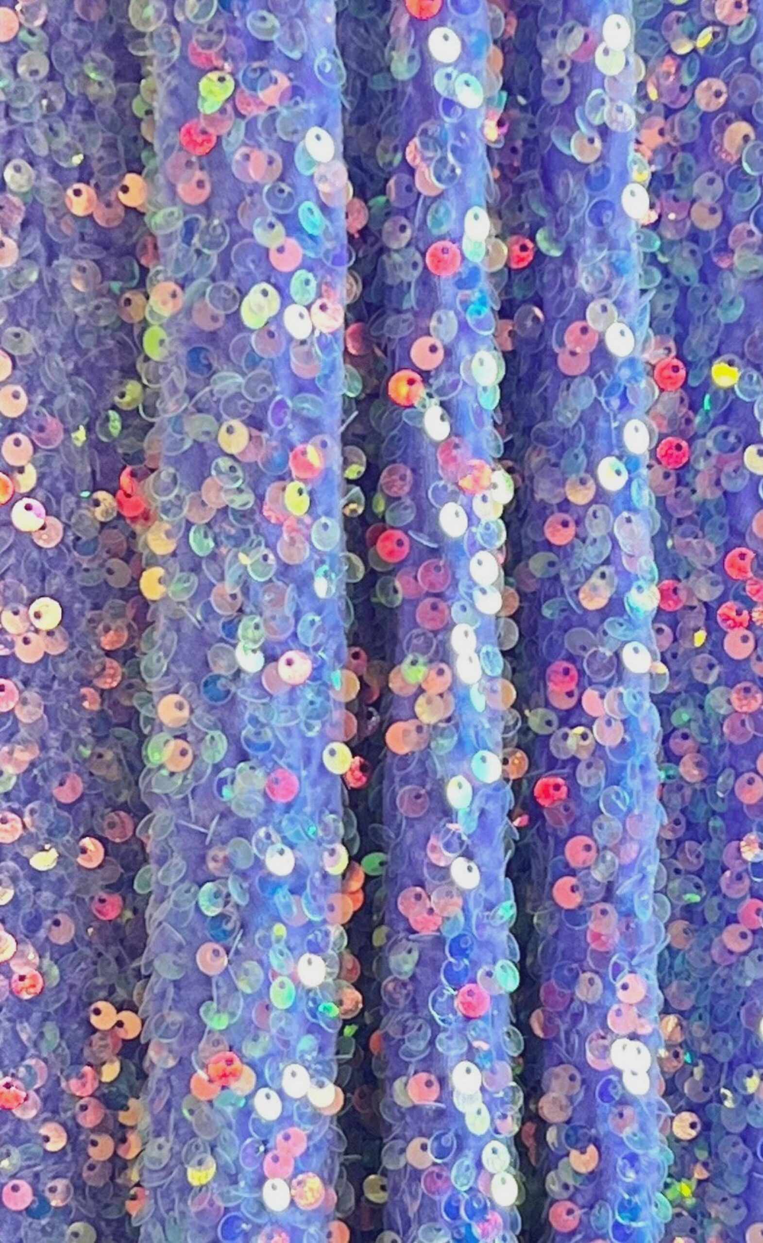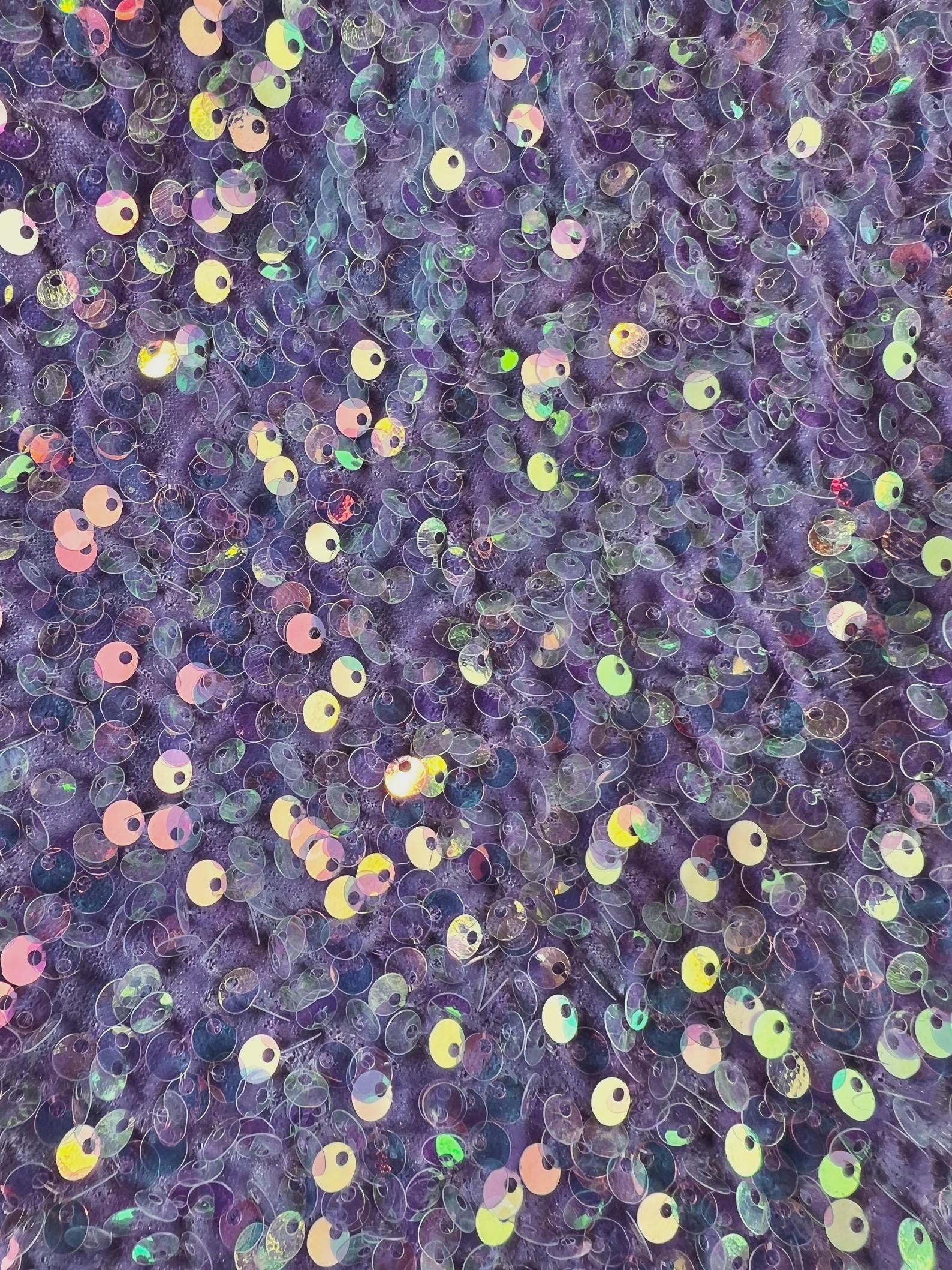 This Clear Iridescent Sequin on Lavender Stretch Velvet Fabric radiates luxury and movement. The base features soft lavender velvet, providing a plush, comfortable feel, while the 5mm iridescent sequins shimmer beautifully in rainbow hues as they catch the light.