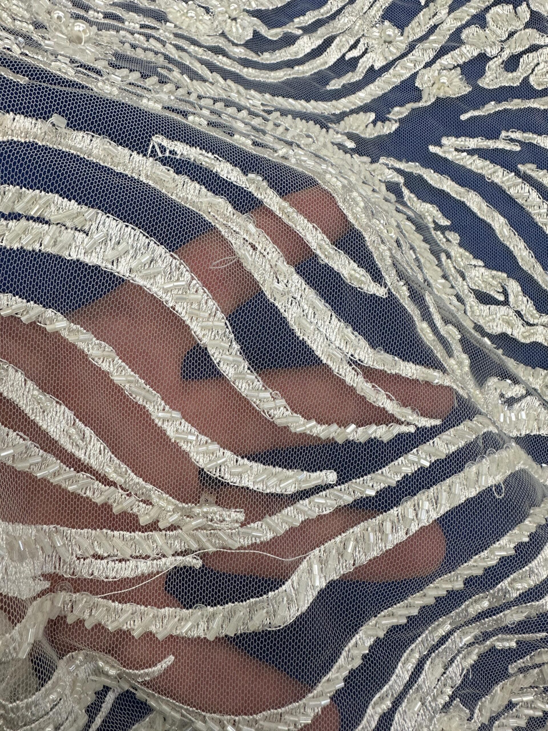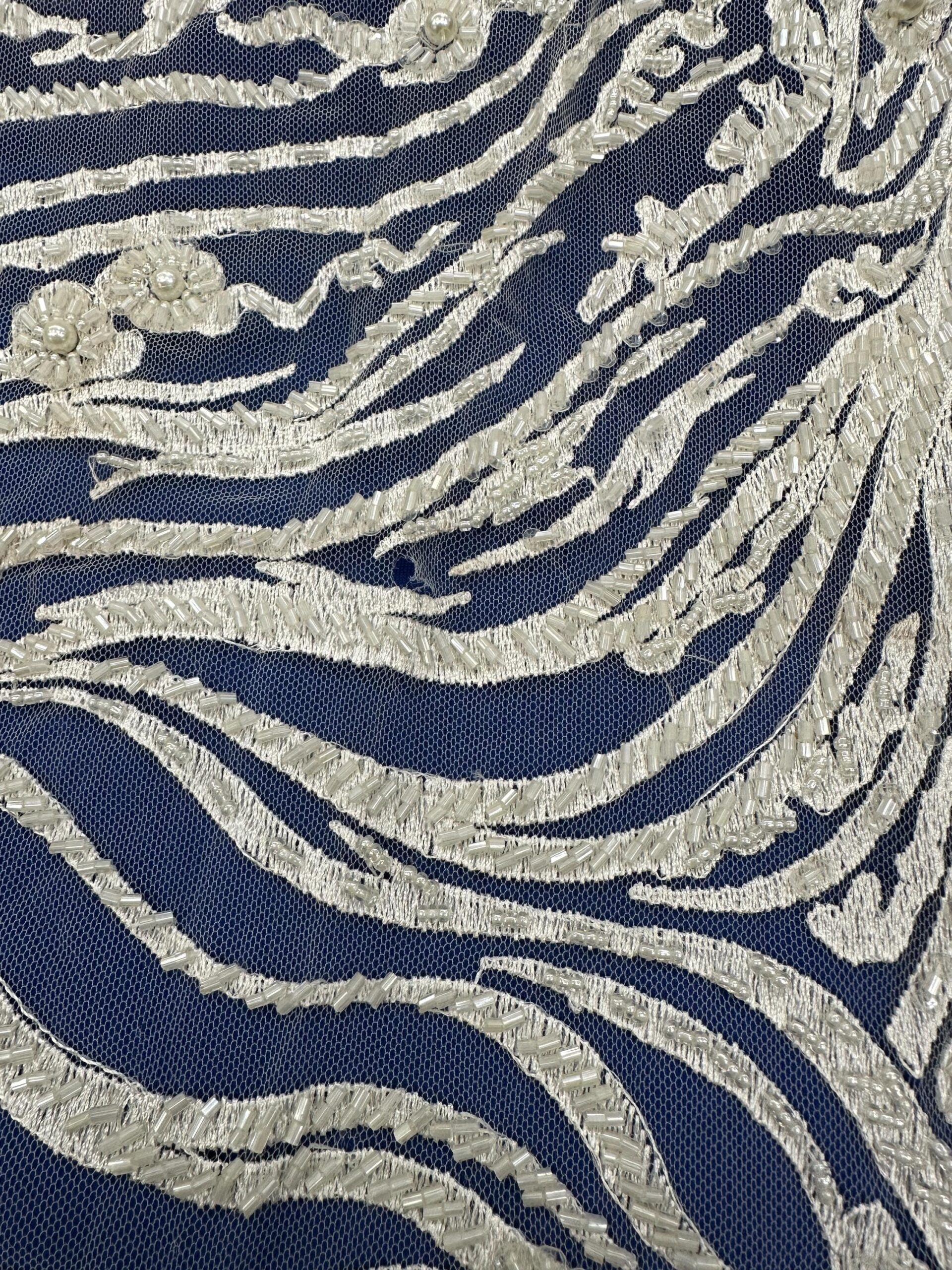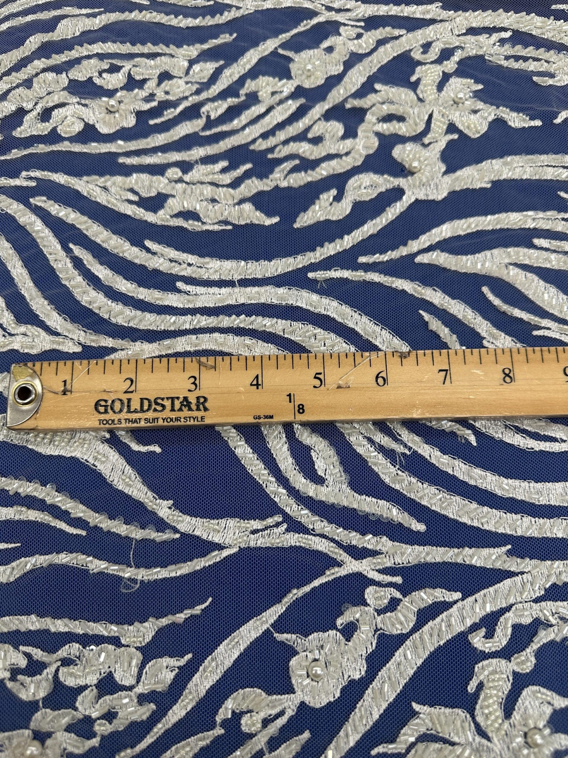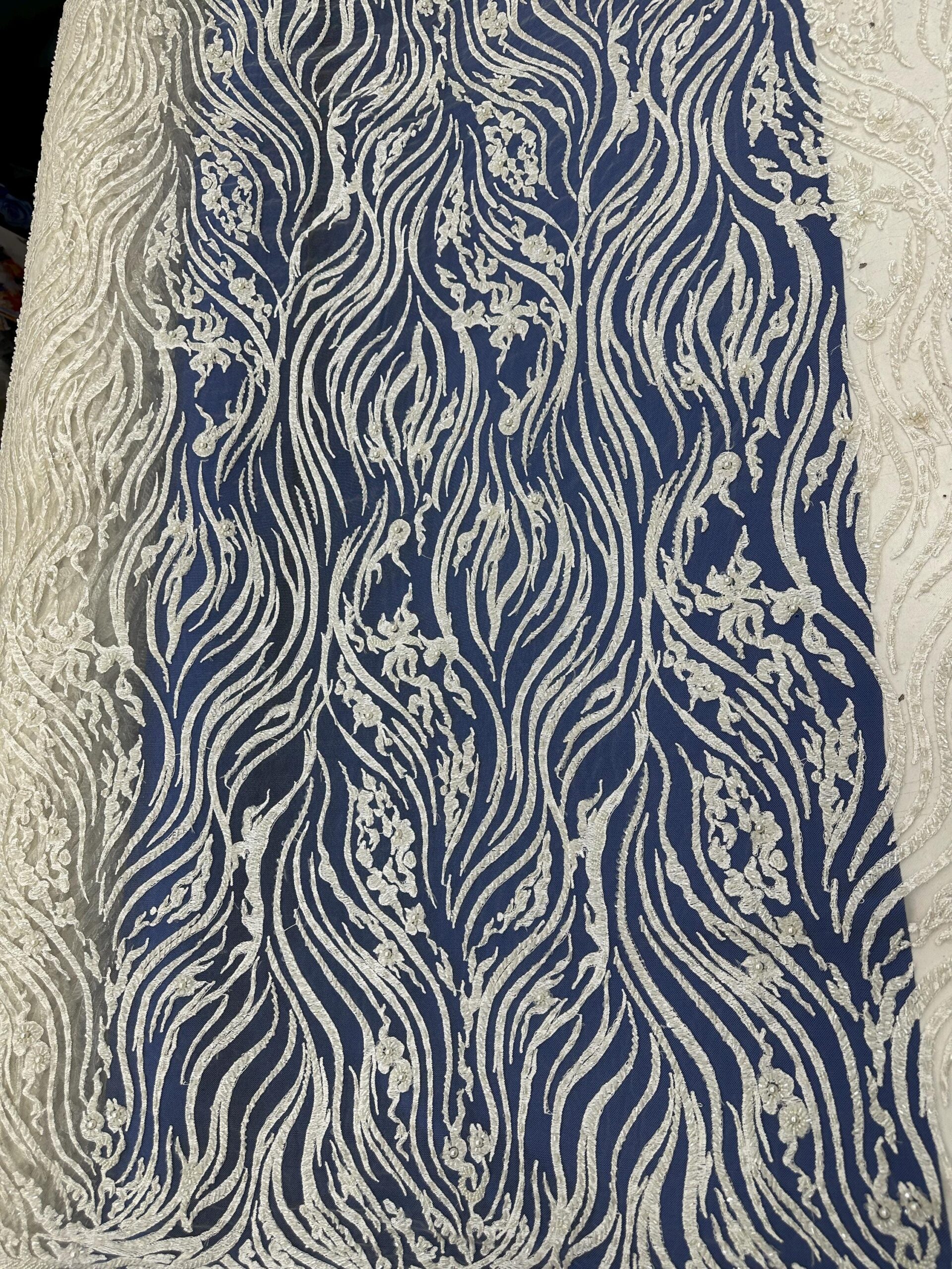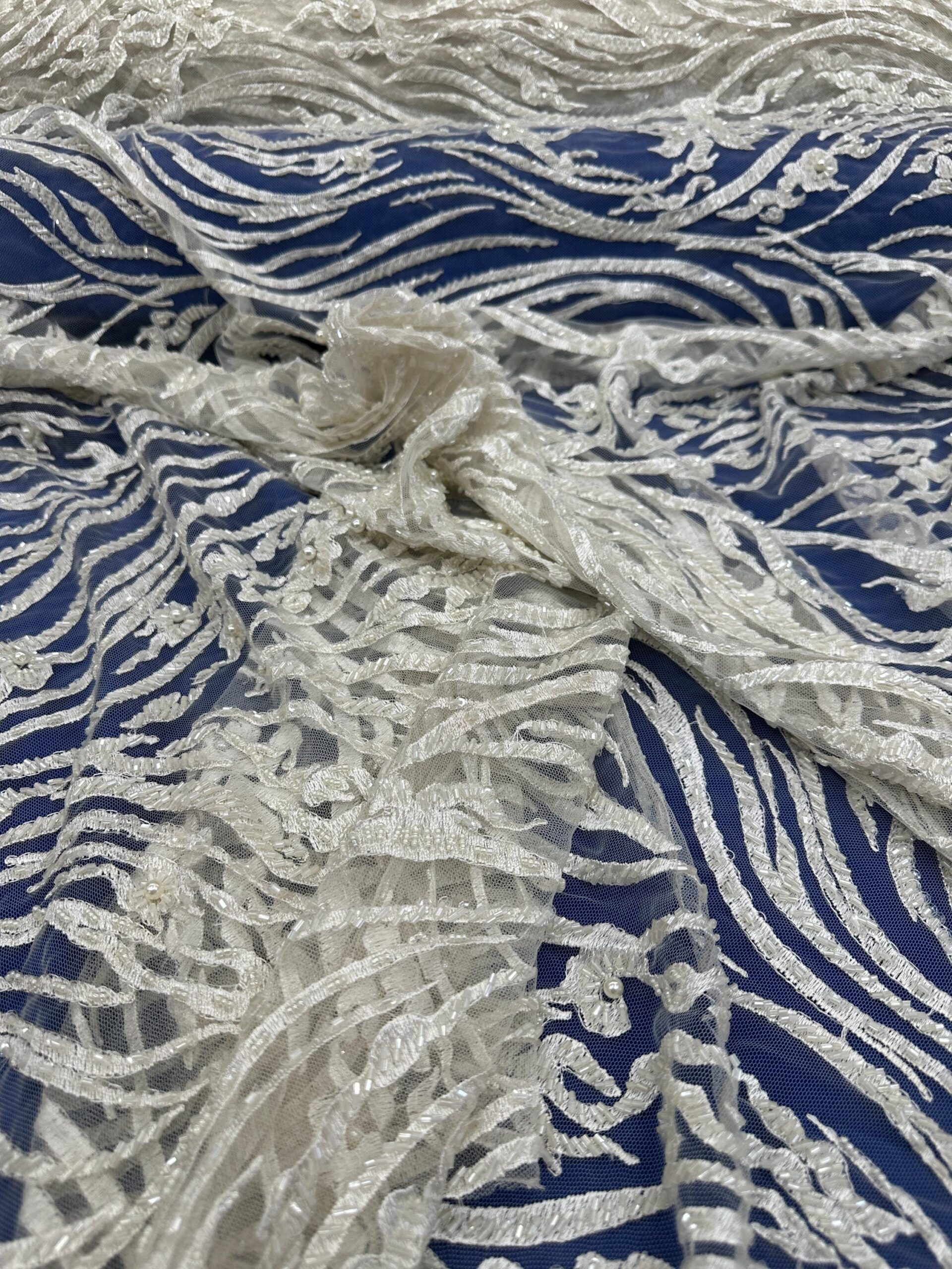 Elevate your designs with this stunning Ivory Beaded Embroidered Lace Fabric, featuring elegant wave-style embroidery, delicate floral motifs, and hand-sewn beads, sequins, and pearls. The intricate details create a shimmering, luxurious texture that stands out beautifully against the soft mesh base.