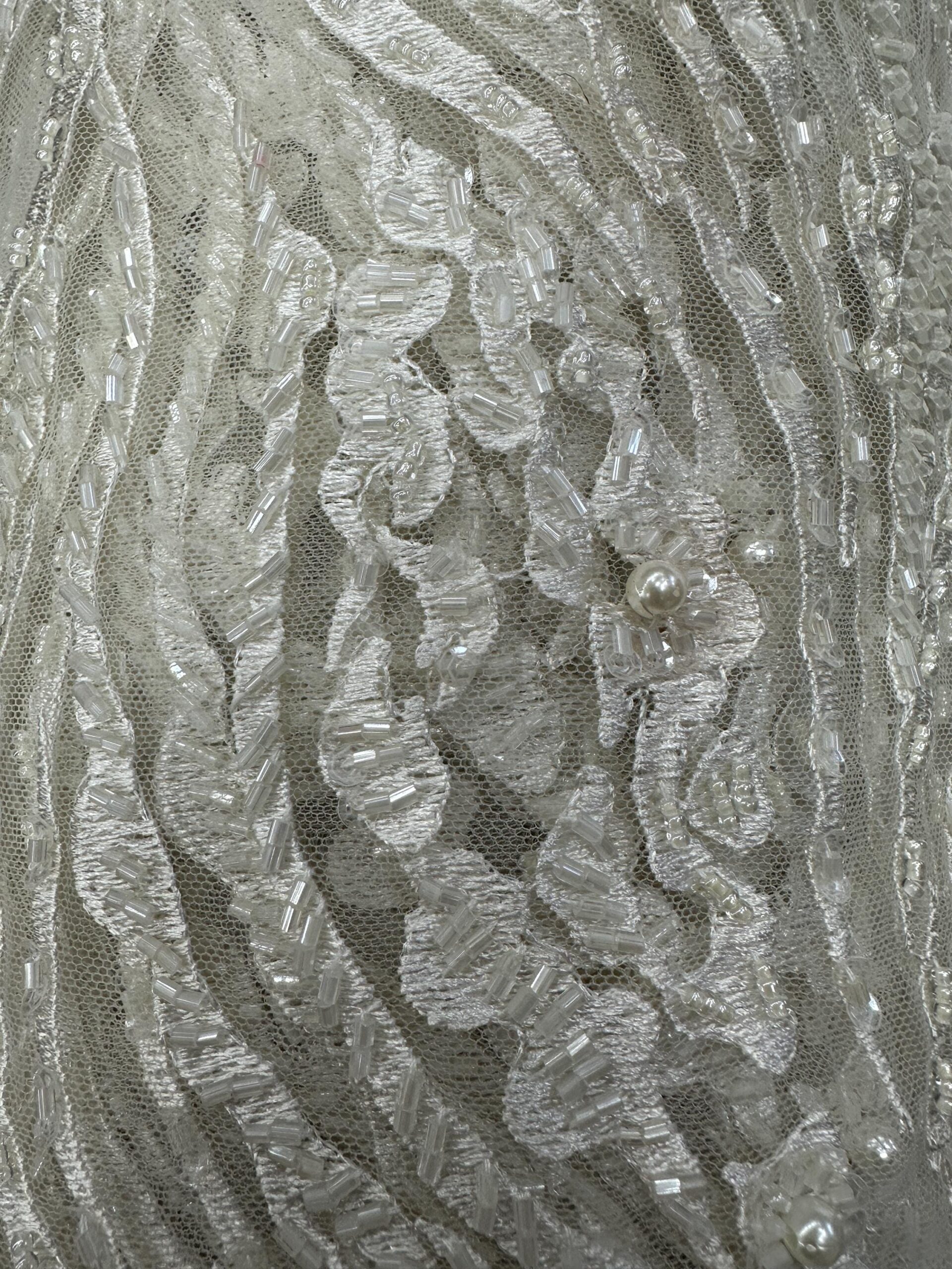 This lace is perfect for bridal gowns, wedding veils, evening dresses, prom attire, photoshoot outfits, and any couture project that requires a sophisticated, high-end finish. The mesh drapes gracefully, while the embellishments add dimension and sparkle.