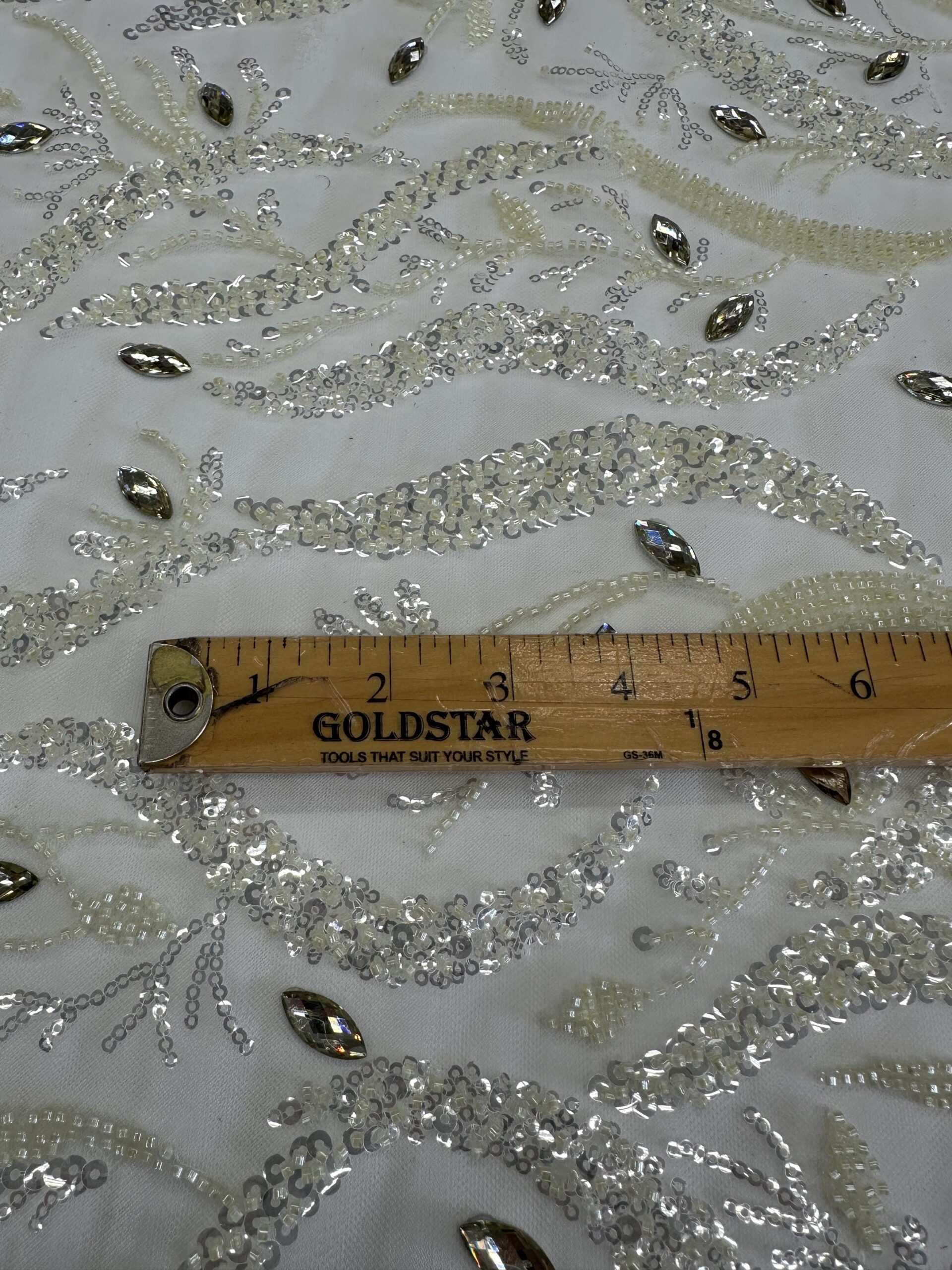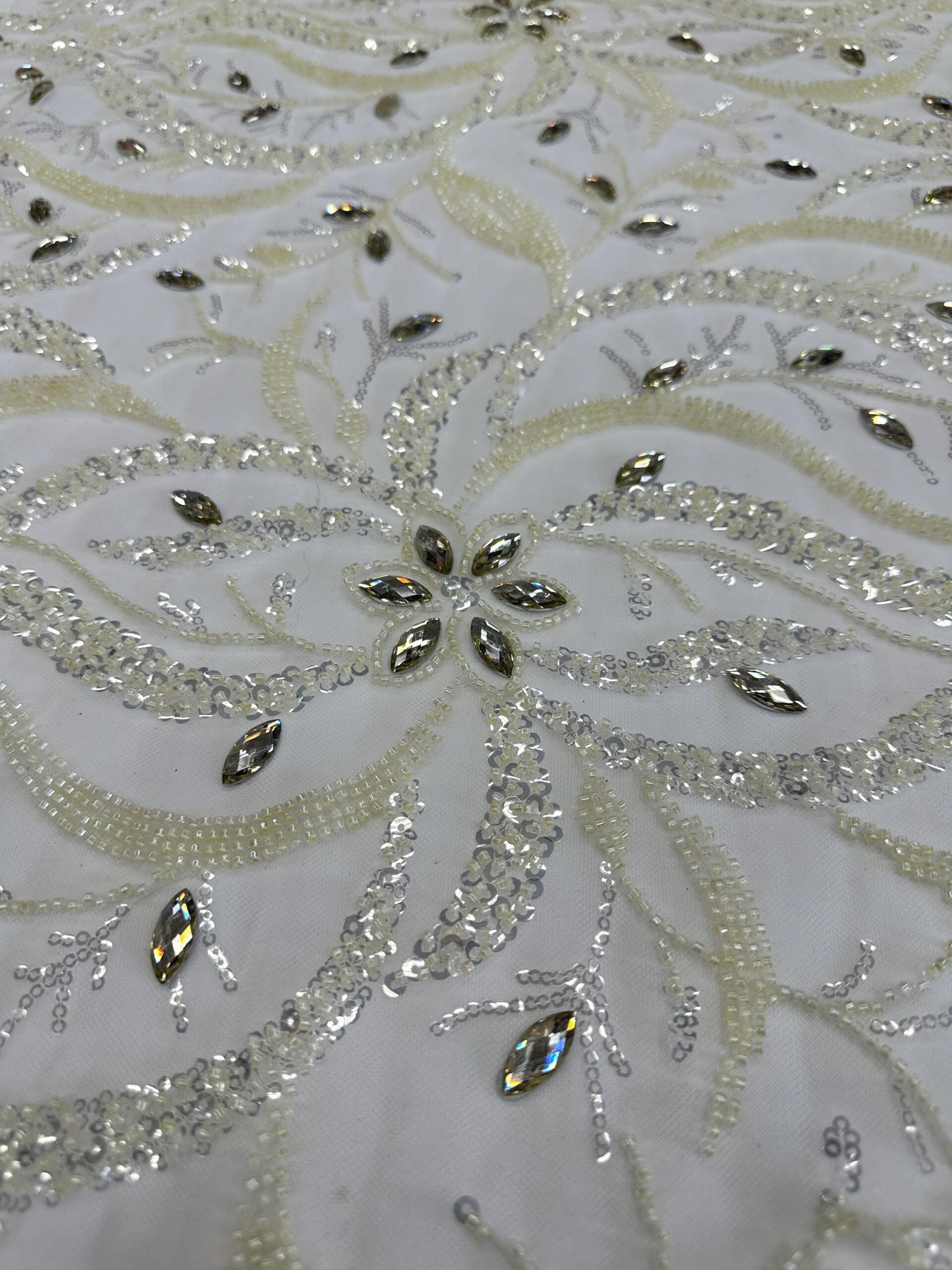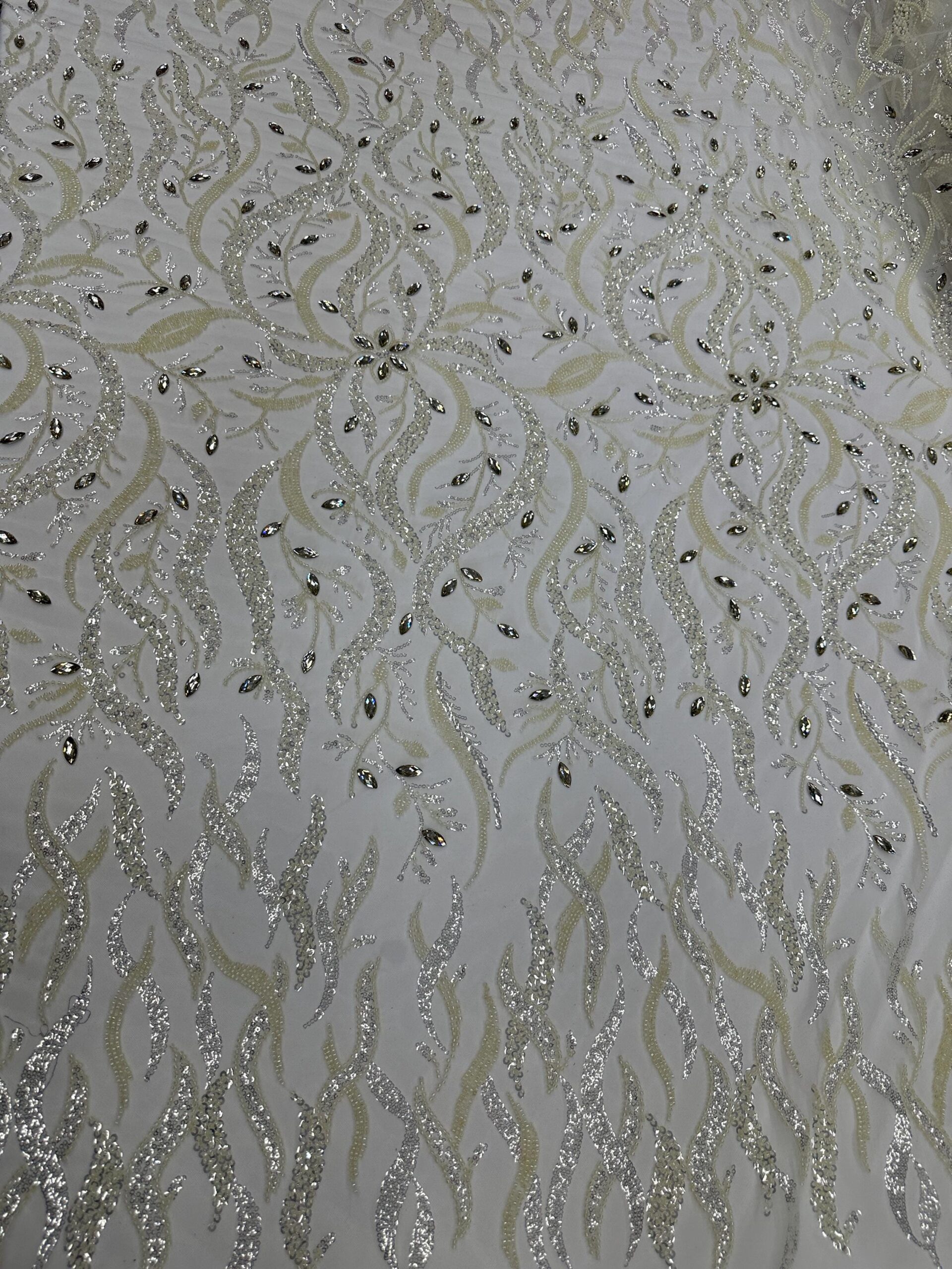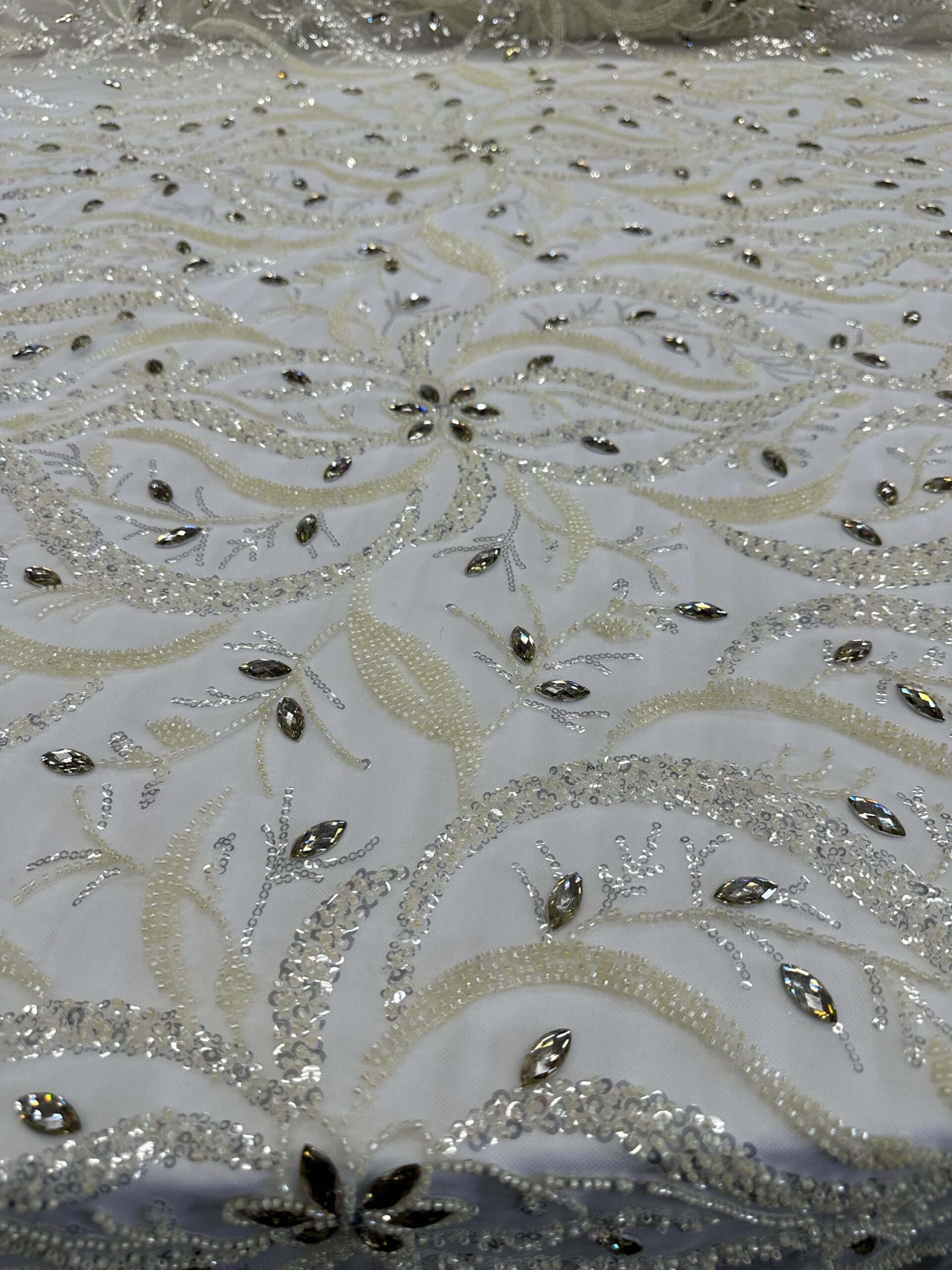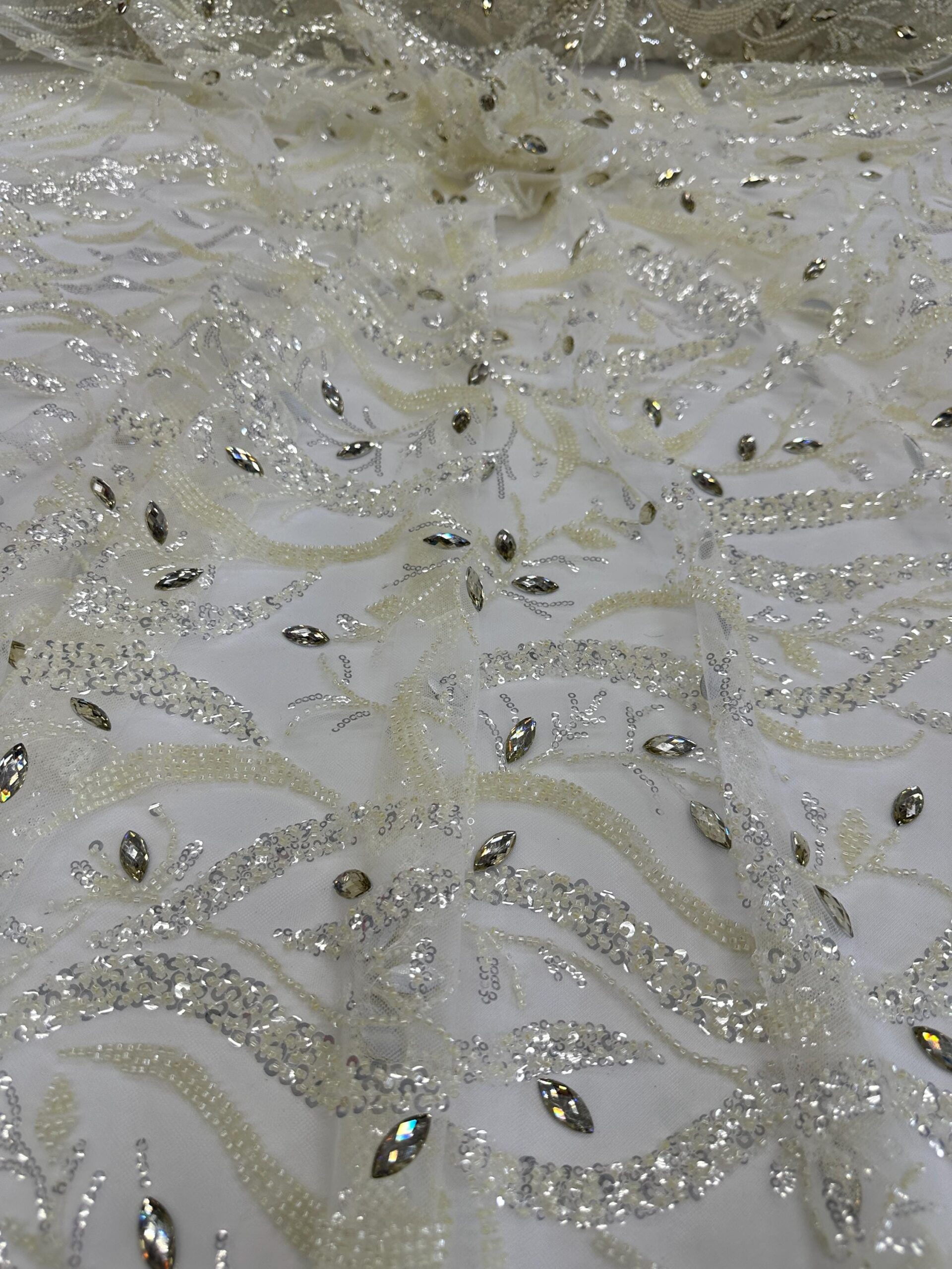 This stunning ivory beaded & rhinestone lace fabric is designed for premium bridal and couture fashion. Featuring a flowing leaf-inspired pattern, the lace is richly embellished with micro beads, shimmering sequins, and sparkling crystal rhinestones. The intricate details add depth, shine, and elegance, making this a perfect choice for upscale wedding gowns and formal pieces.