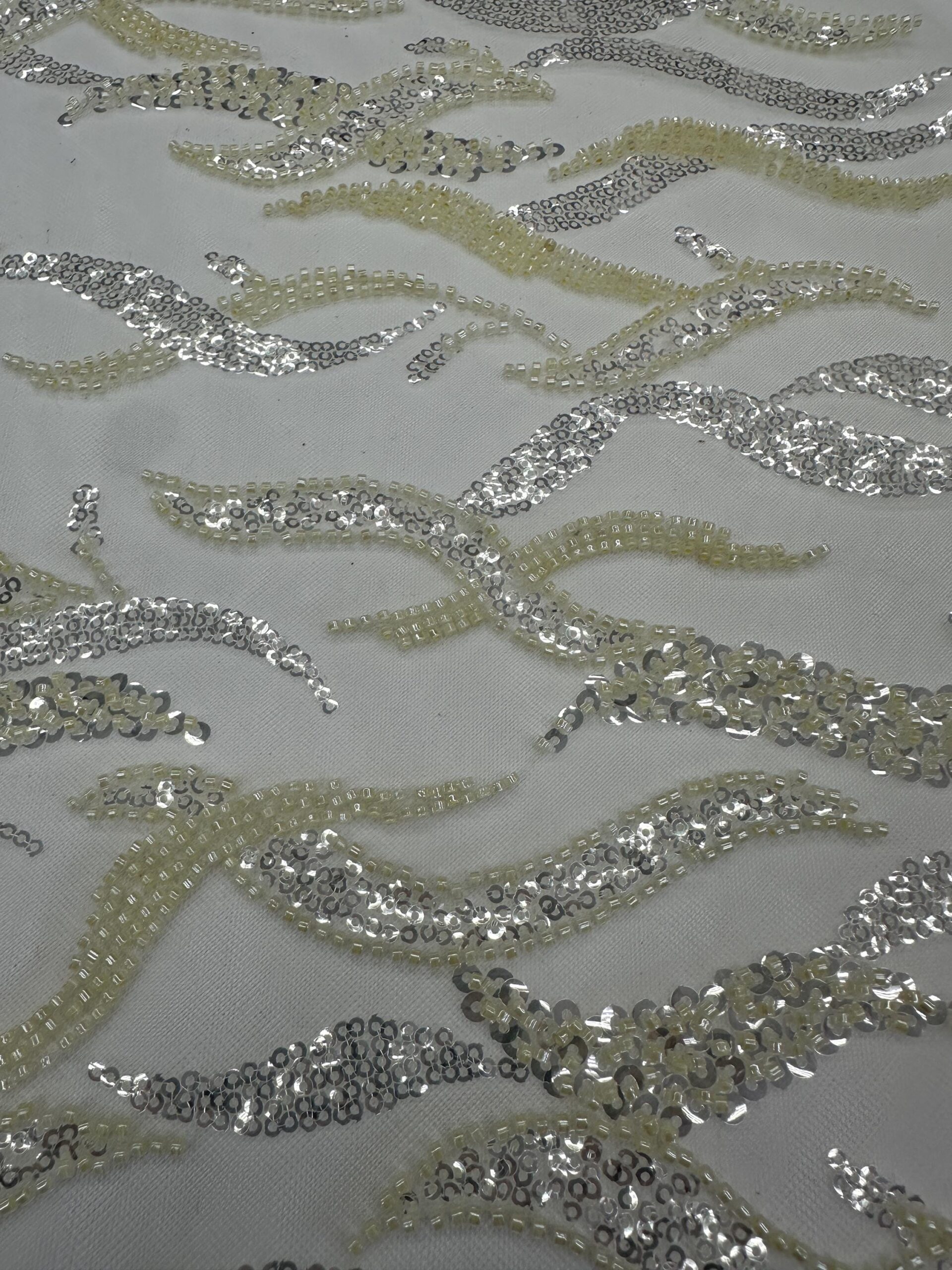 The soft sheer mesh base drapes beautifully, ideal for bridal dresses, overlays, skirts, bodices, veils, trains, evening gowns, and custom couture projects. Every section of the fabric shines gracefully under lighting, giving your finished garment a luxurious high-end look