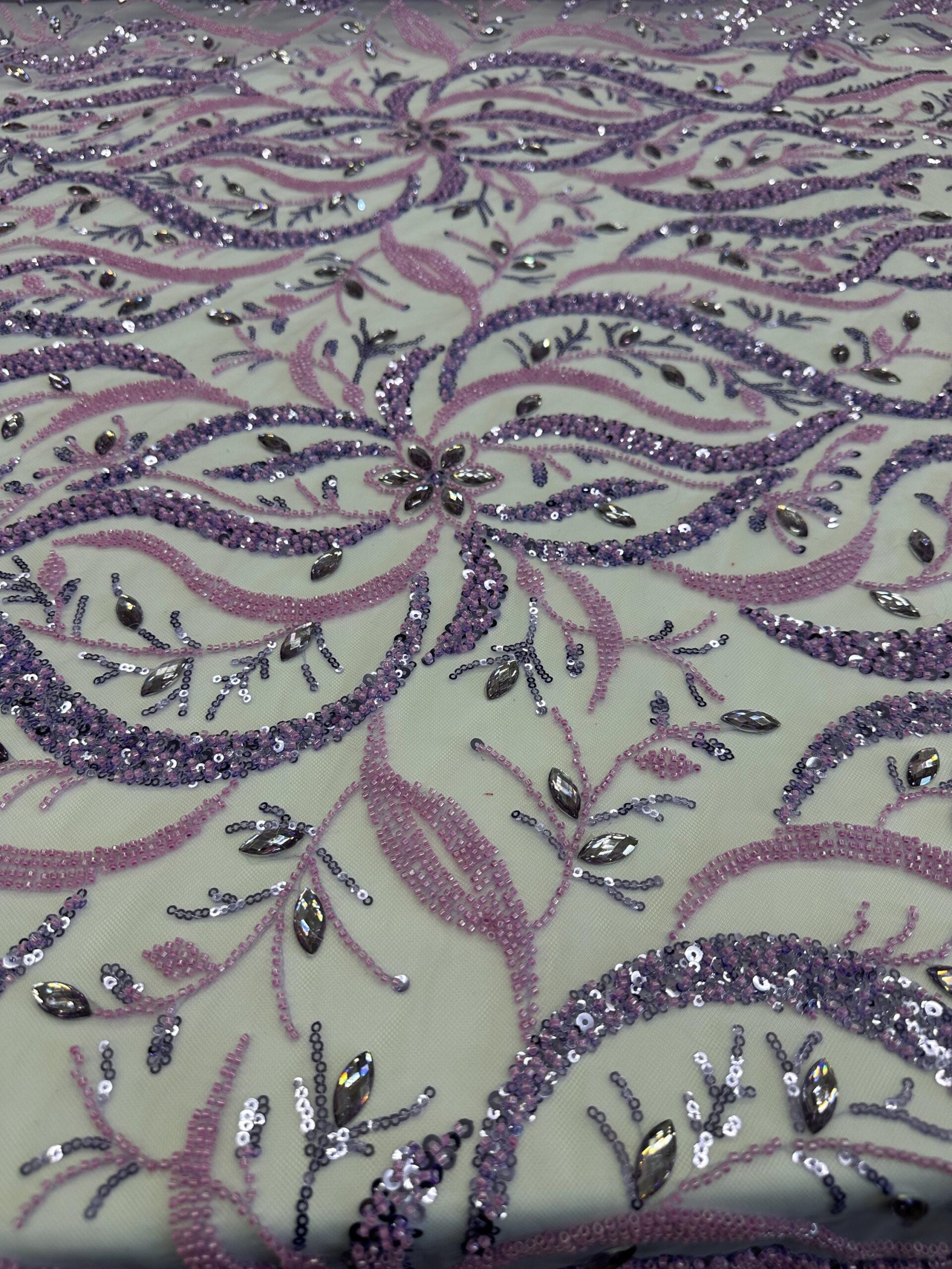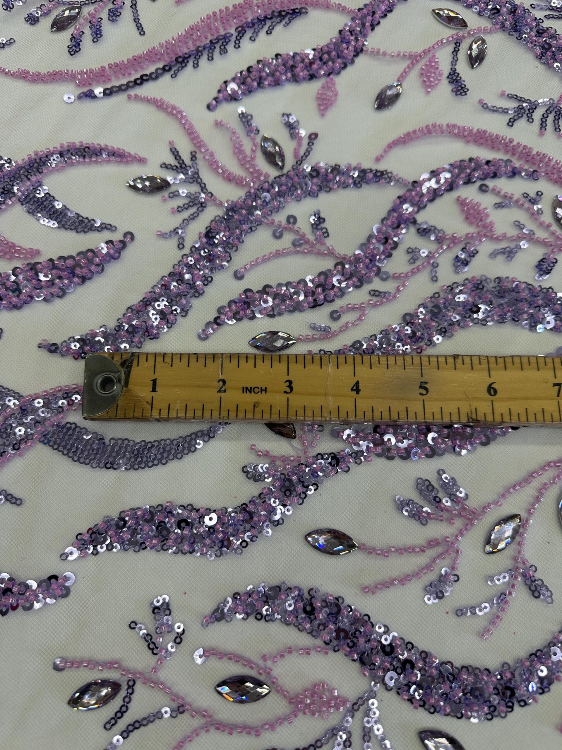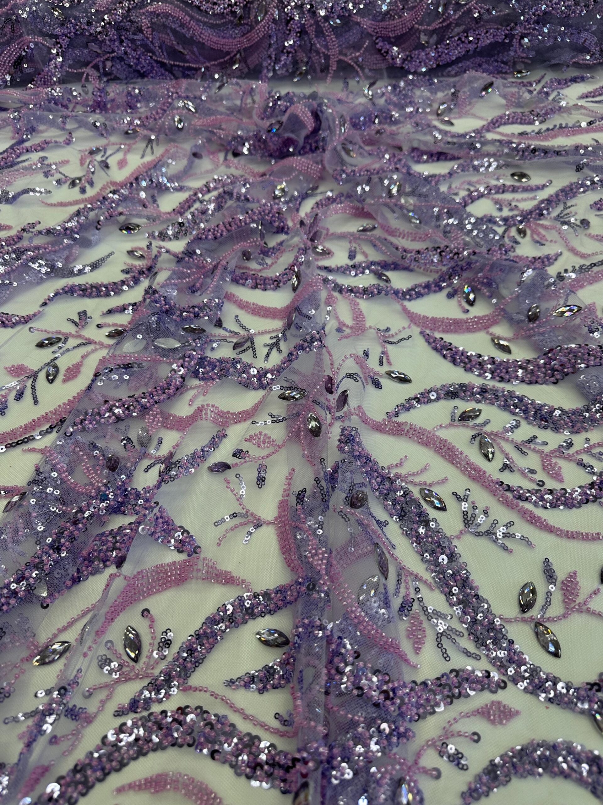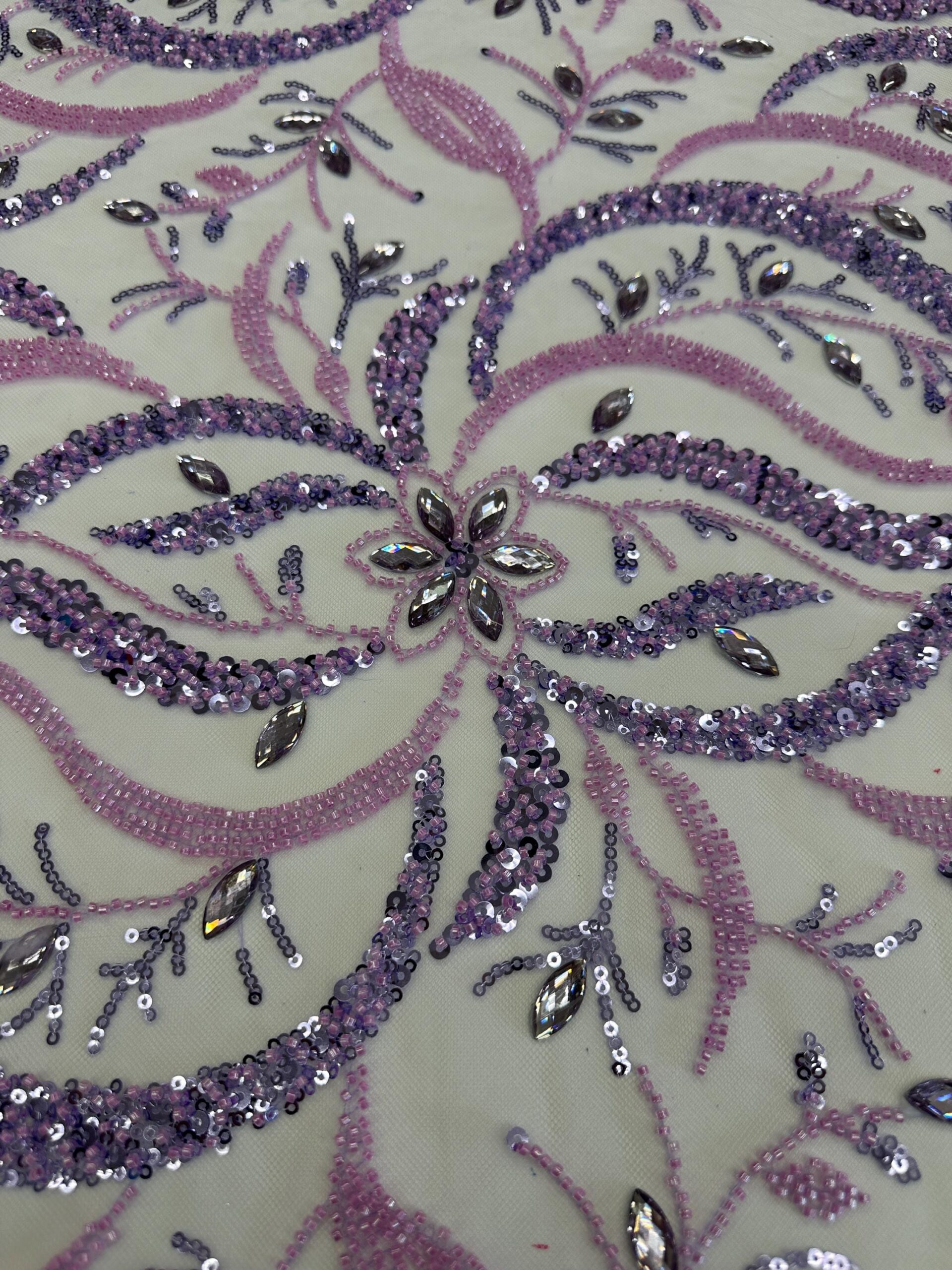 This exquisite lavender beaded & sequin lace fabric features a dreamy light purple tone with shimmering seed beads, sequins, and reflective crystal stones. The embroidery forms elegant floral and leaf patterns, adding soft sophistication and sparkle from every angle.