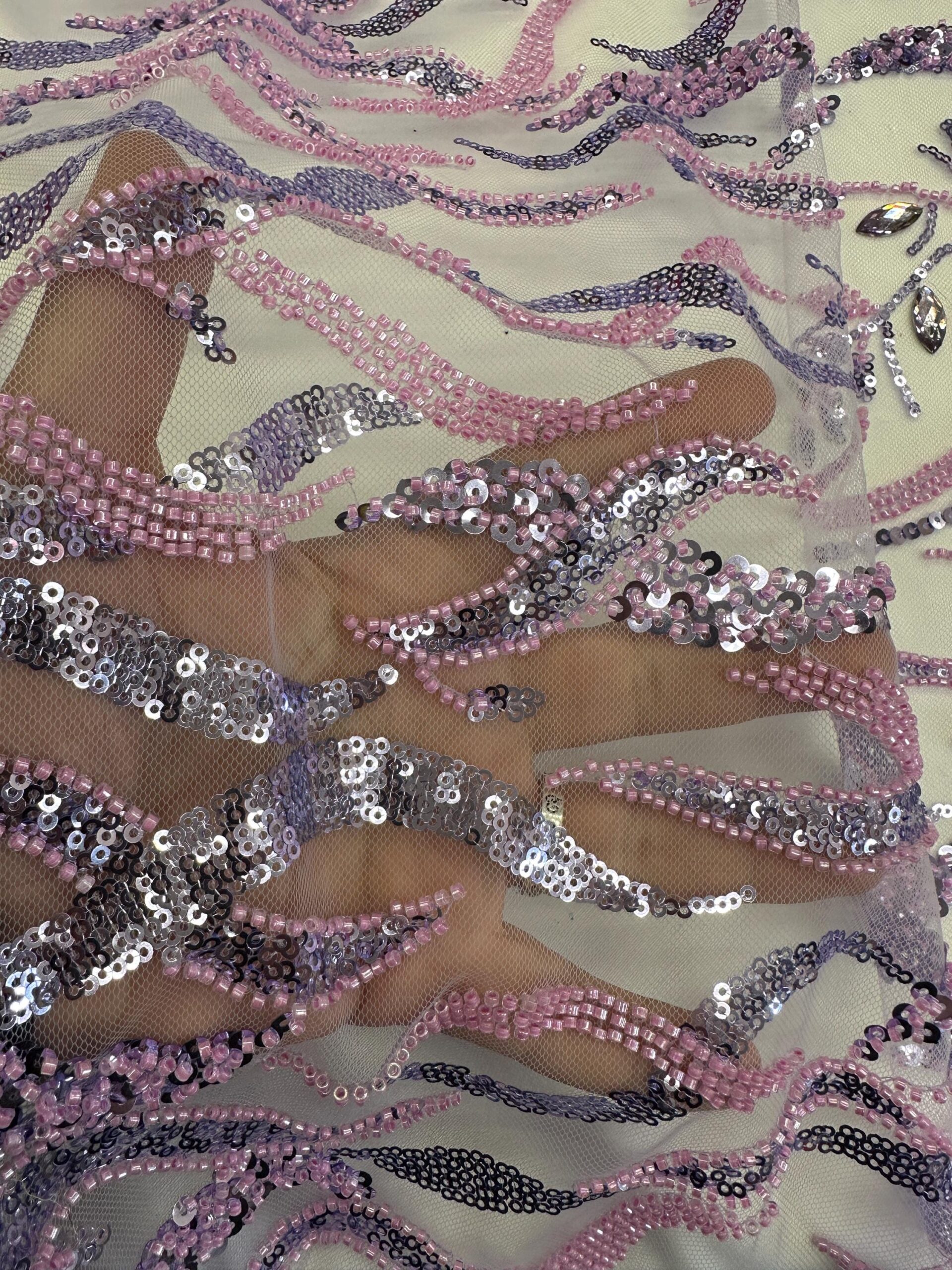 Lavender Beaded / Sequin Lace Fabric | Light Purple Embroidered Mesh with Crystals | Evening Gown, Prom Dress /Couture Lace, 52/54” Wide