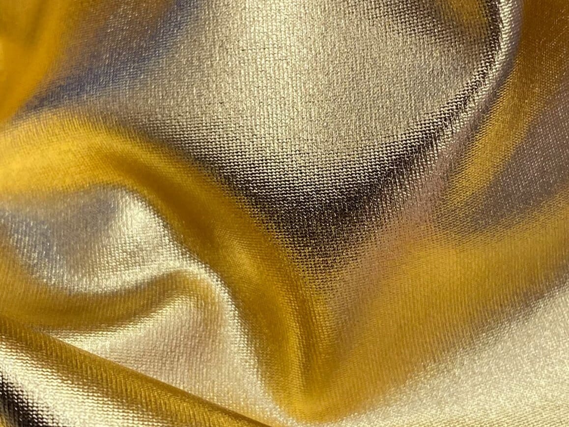 Bring bold shine and high stretch to your creations with this Gold Metallic Foil 4-Way Stretch Fabric. This fabric features a brilliant gold foil finish on a smooth, stretchy spandex/lycra base, giving it a luxurious look and flexible performance. The surface reflects light beautifully, making it perfect for statement pieces and professional-quality designs.