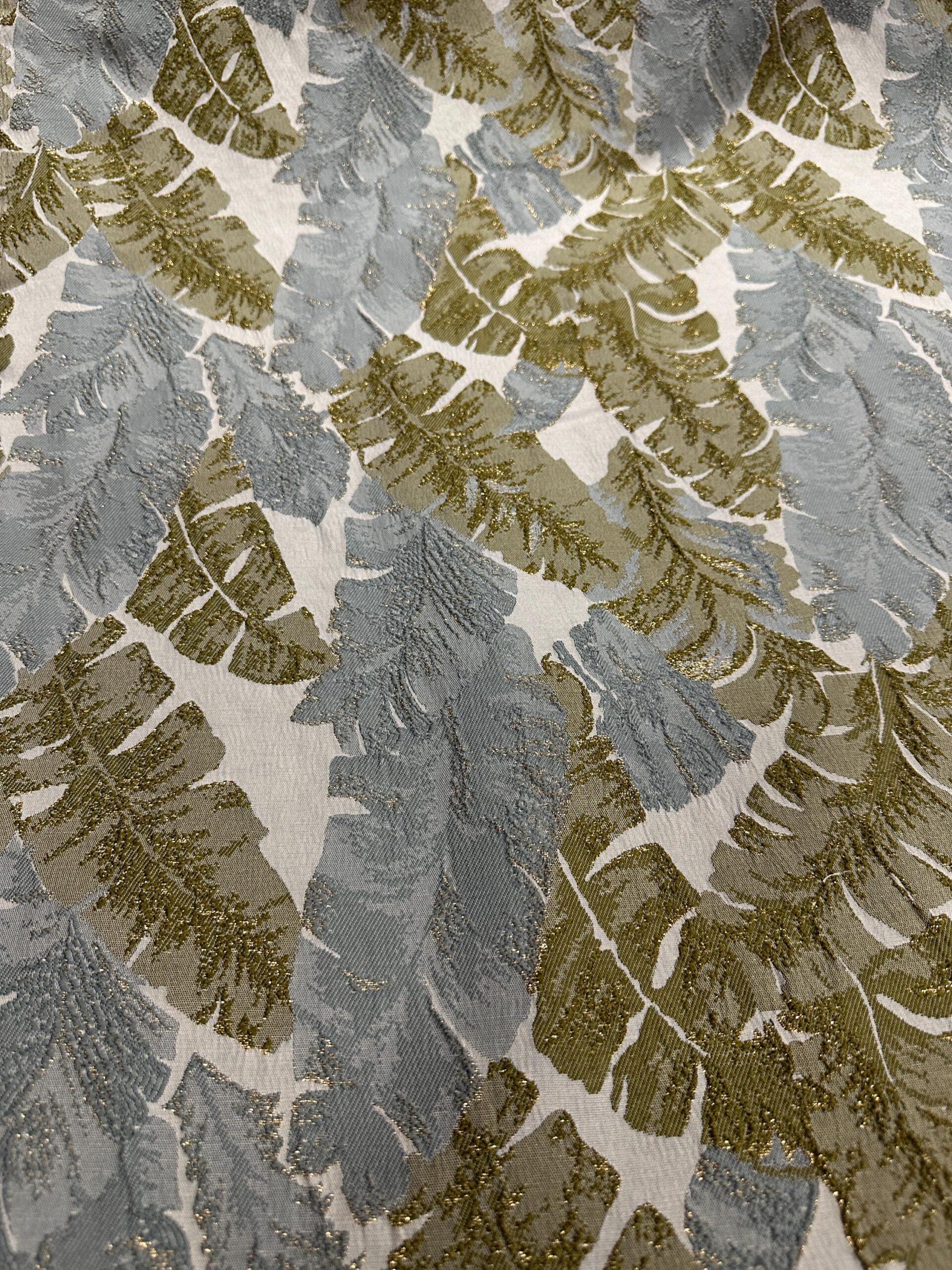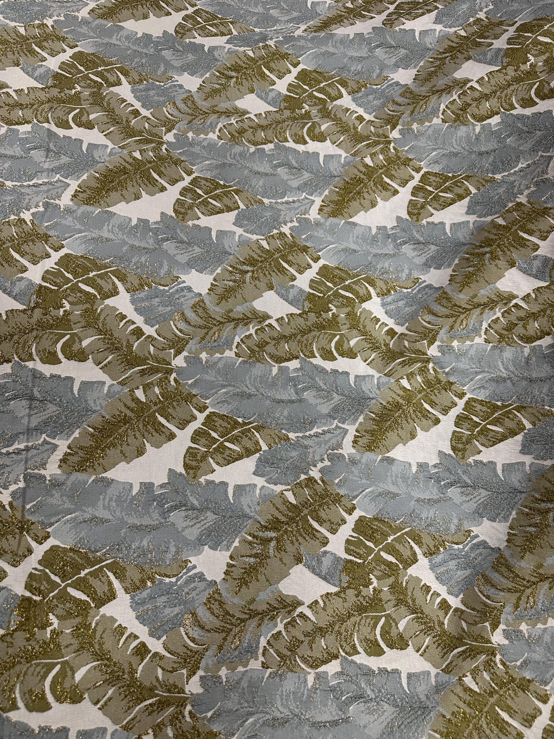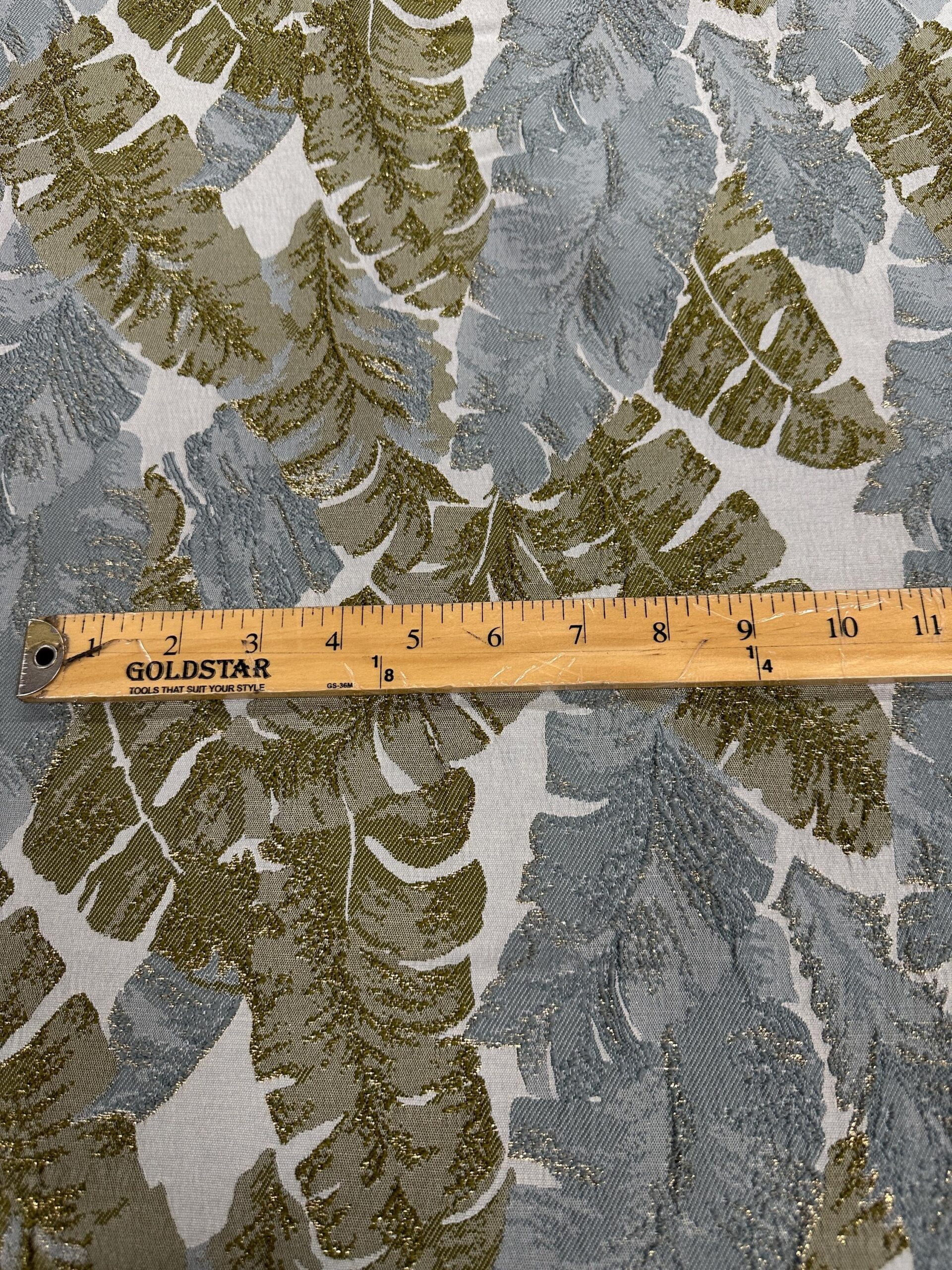 Metallic Leaf Brocade Fabric, Green Gold Gray Jacquard 58″ Wide