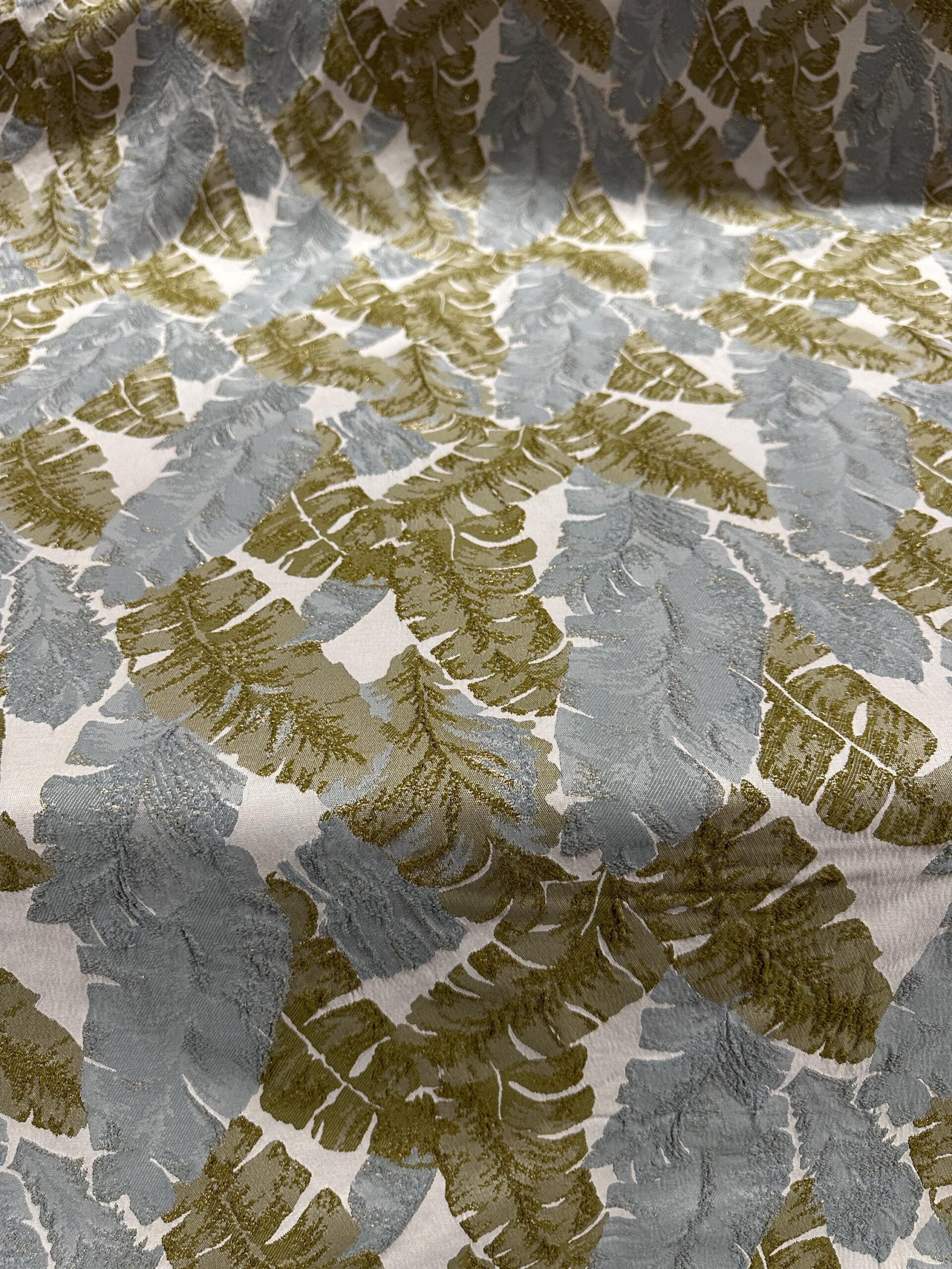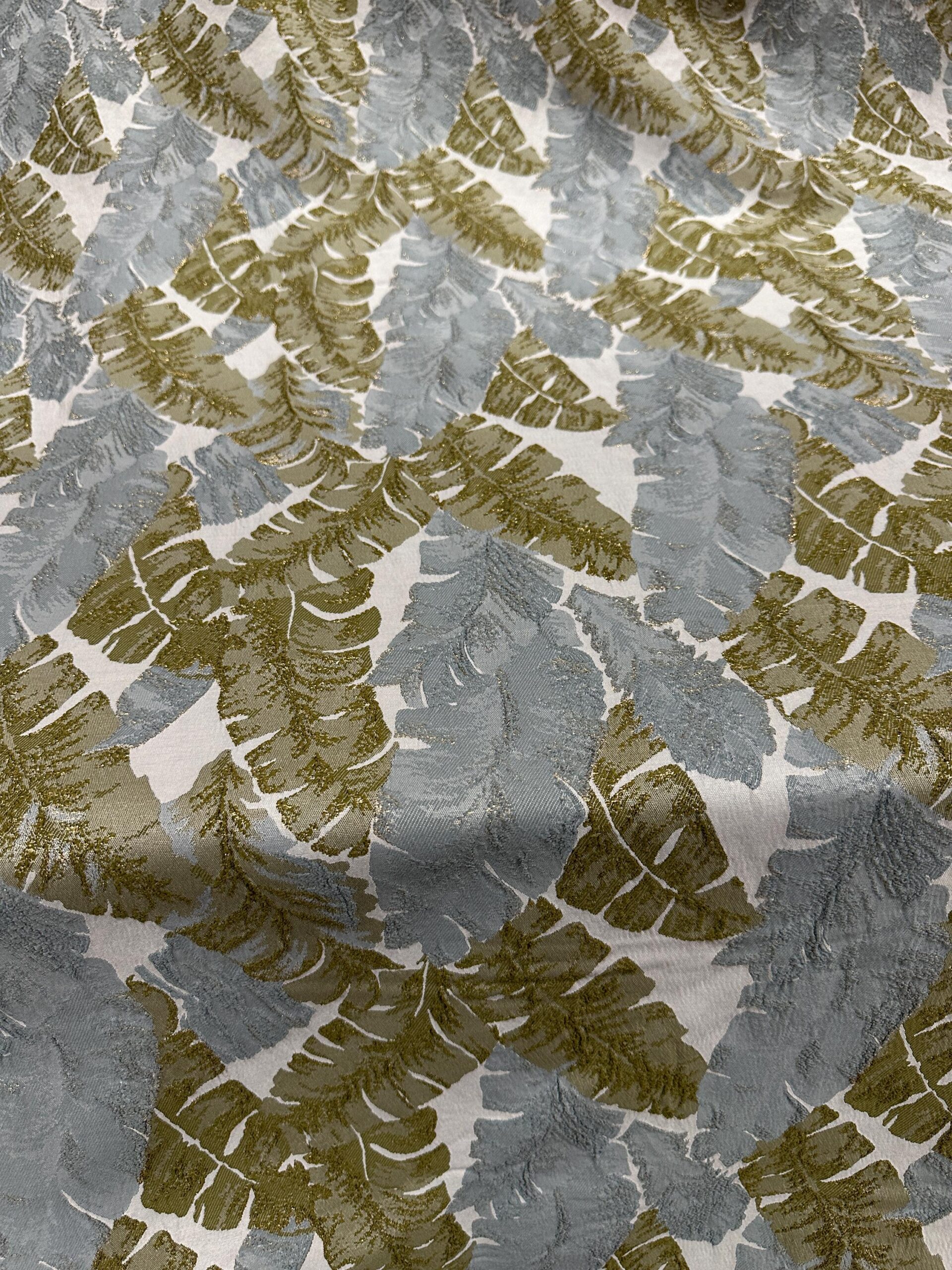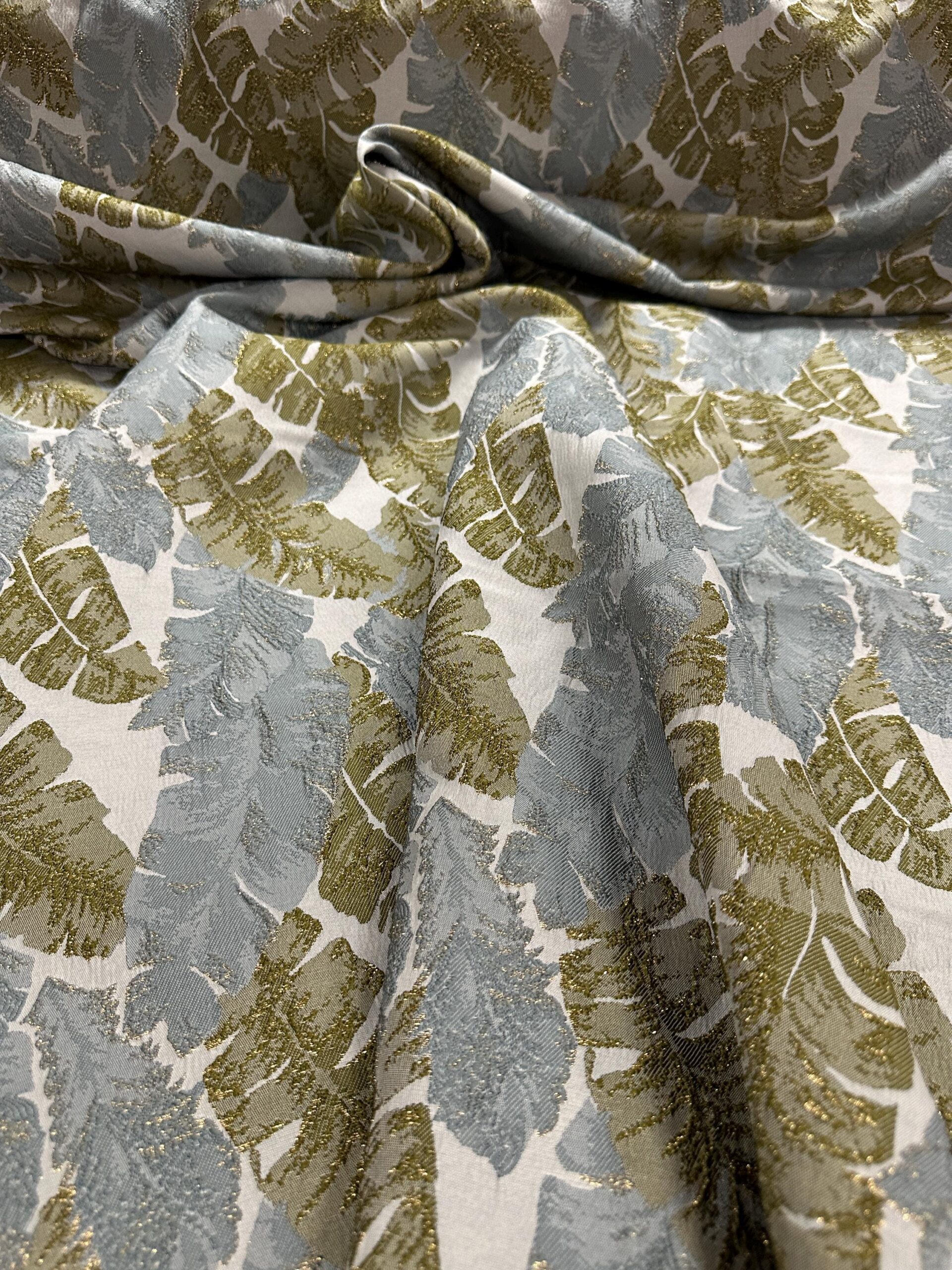 Metallic Leaf Brocade Fabric, Green Gold Gray Jacquard 58″ Wide