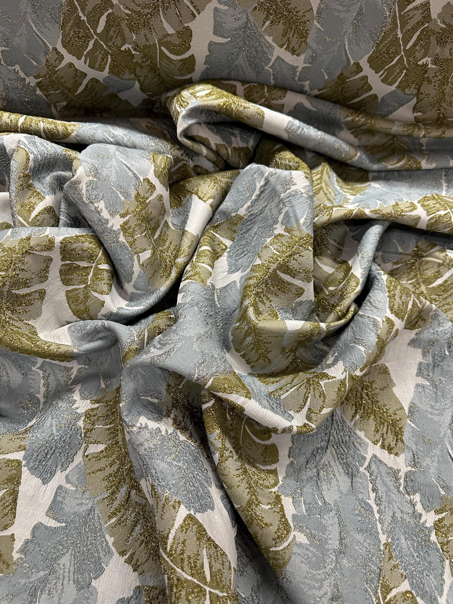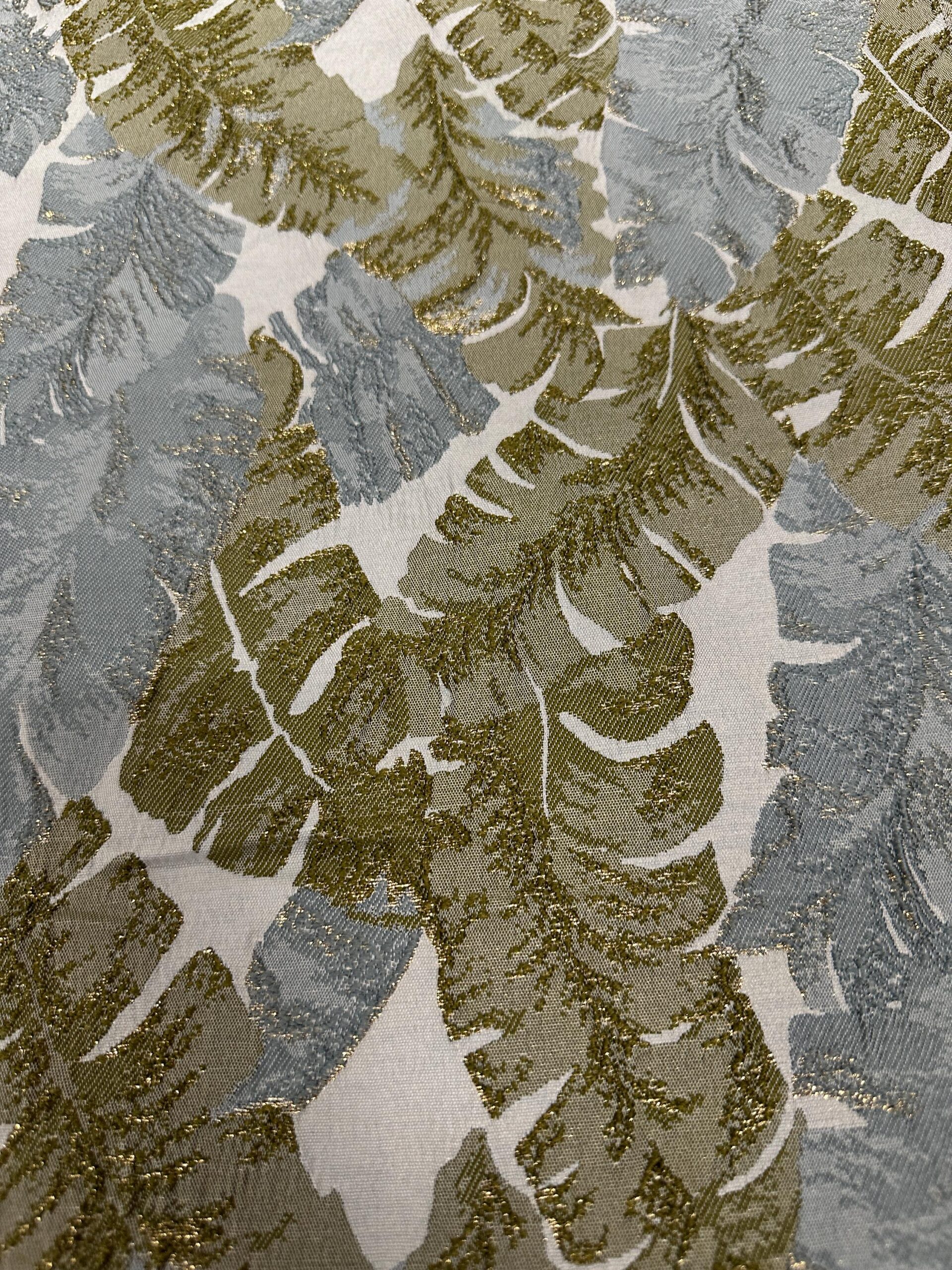 Add a touch of elegance and sophistication to your projects with this Green, Gold, and Gray Metallic Leaf Brocade Fabric. The intricate jacquard weave showcases shimmering metallic leaf motifs in soft sage gray and olive green with golden highlights. Its textured finish and reflective surface create a dynamic, luxurious appearance perfect for both fashion and décor.