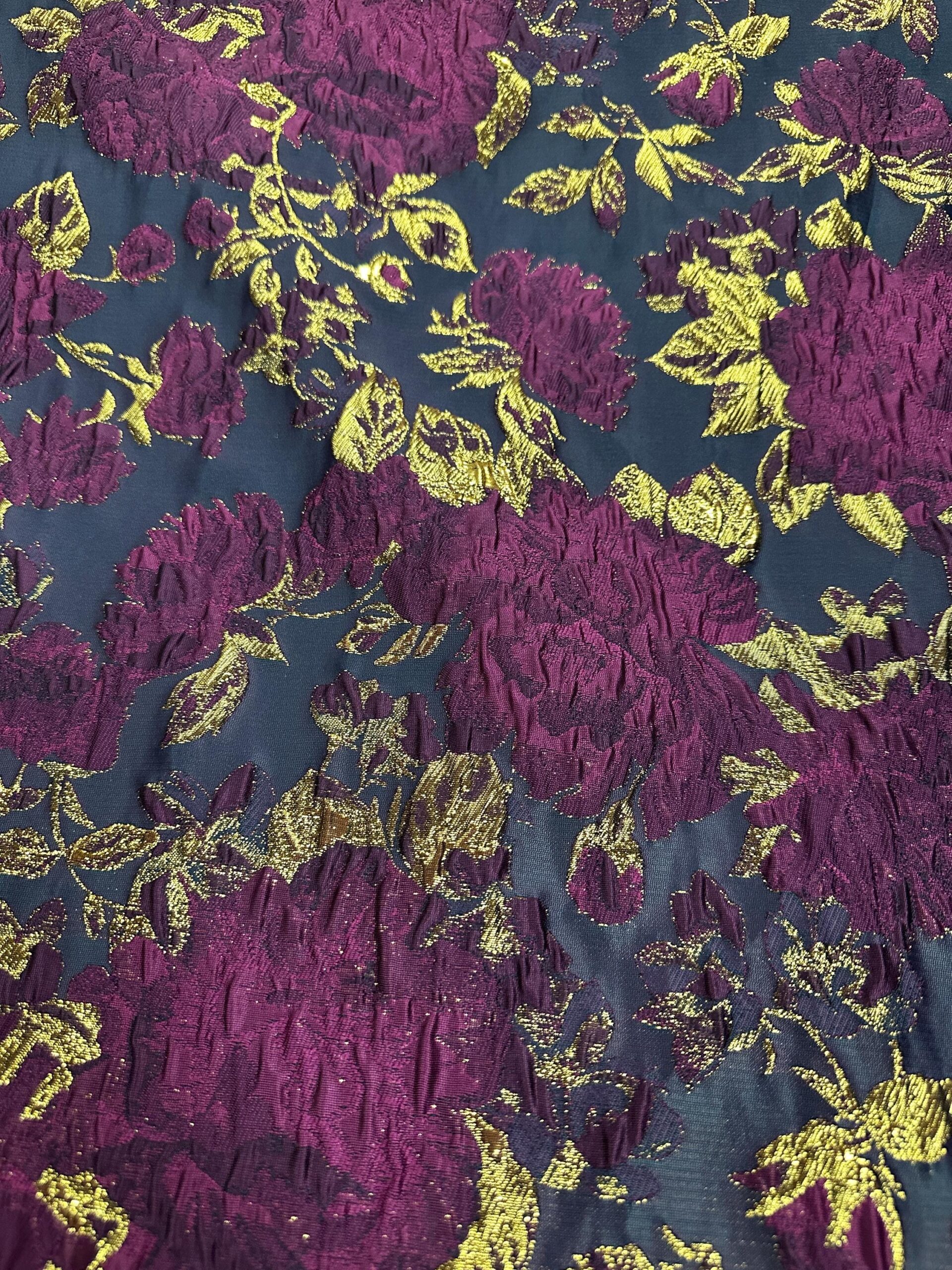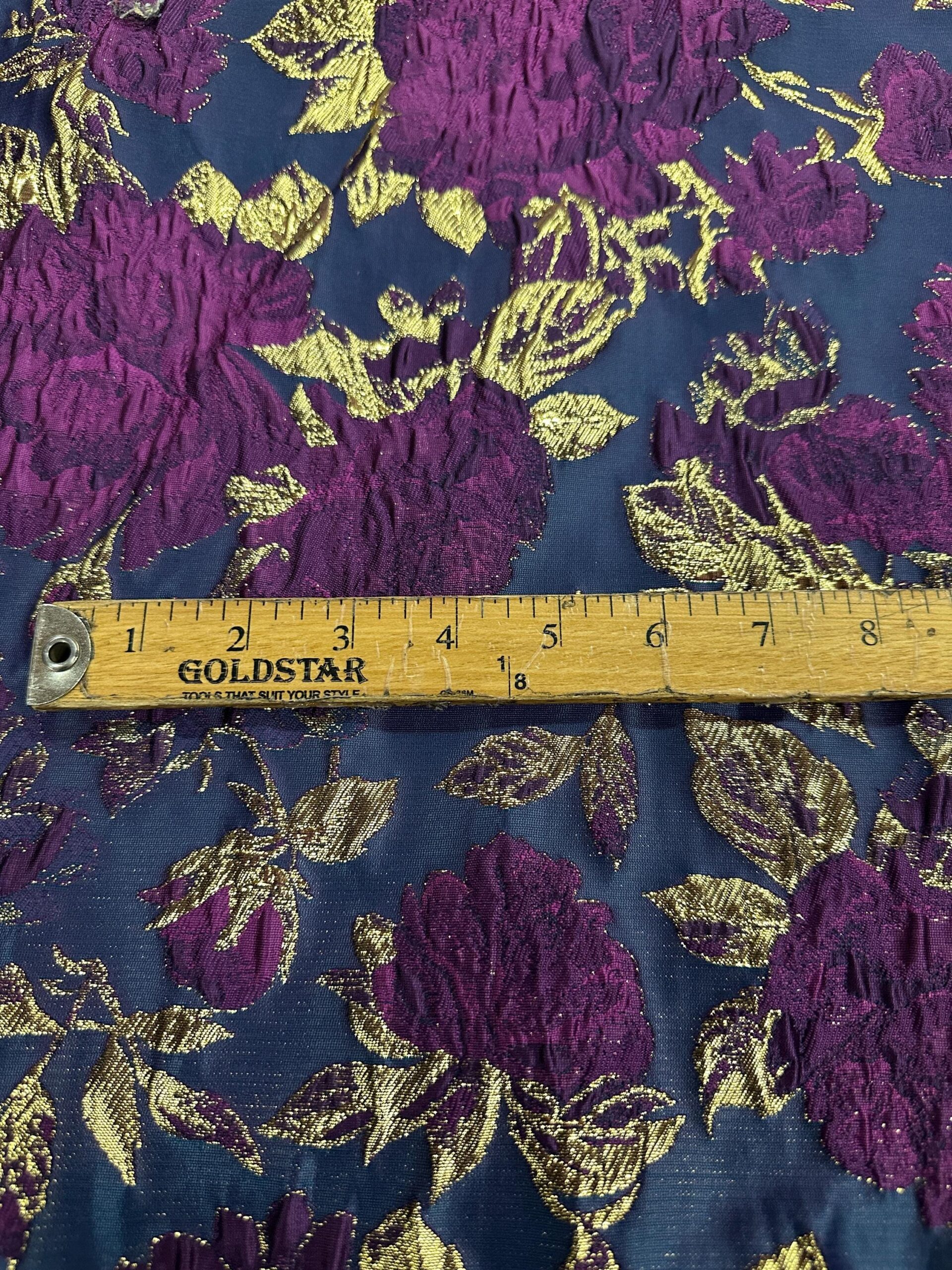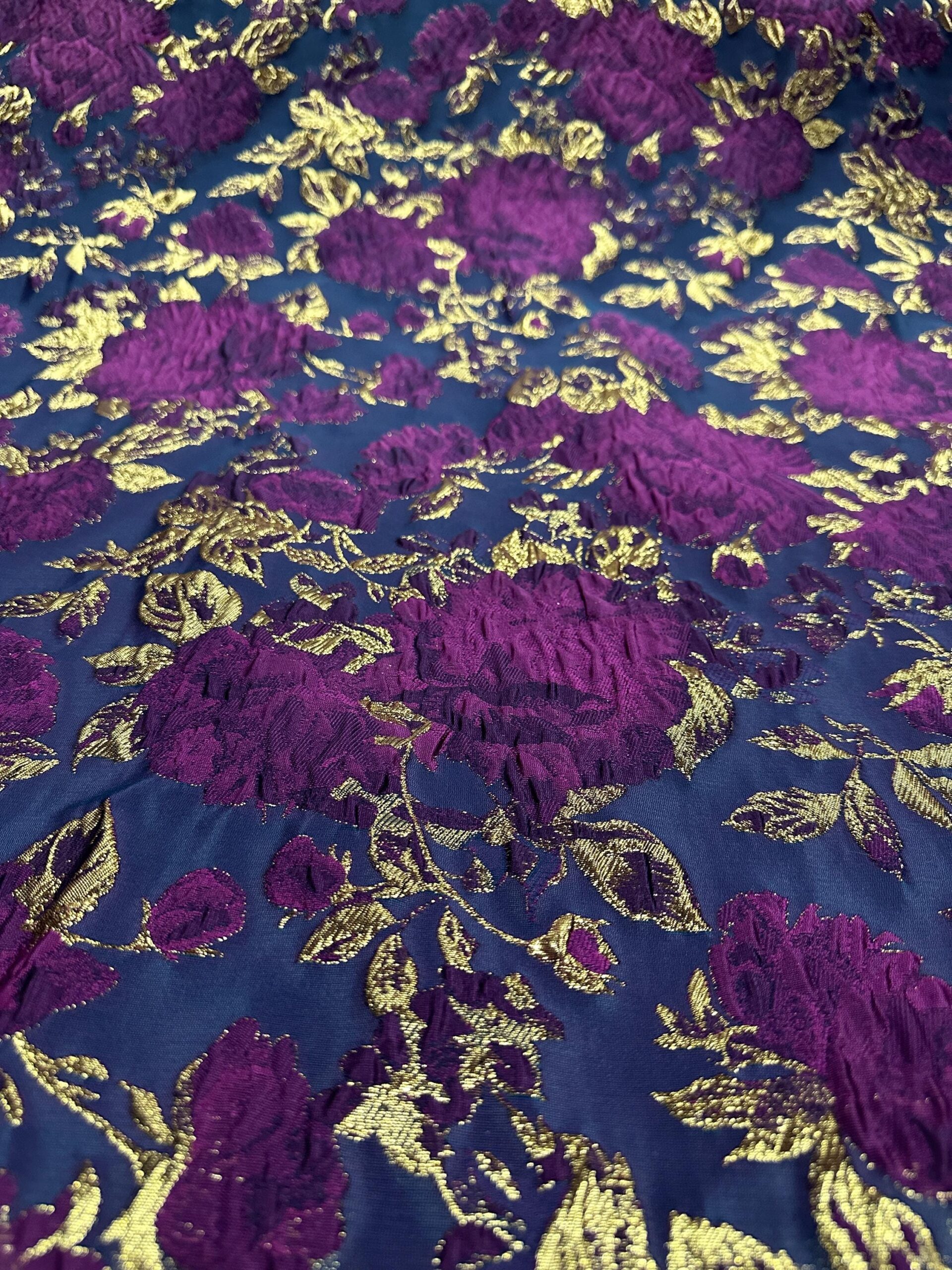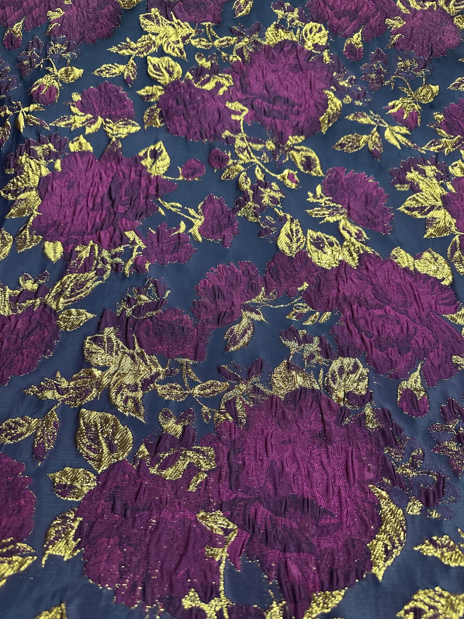This exquisite plum and gold floral brocade on a navy blue organza base radiates timeless elegance. The large rose motifs are intricately woven with shimmering metallic gold threads, creating a striking contrast against the dark background.