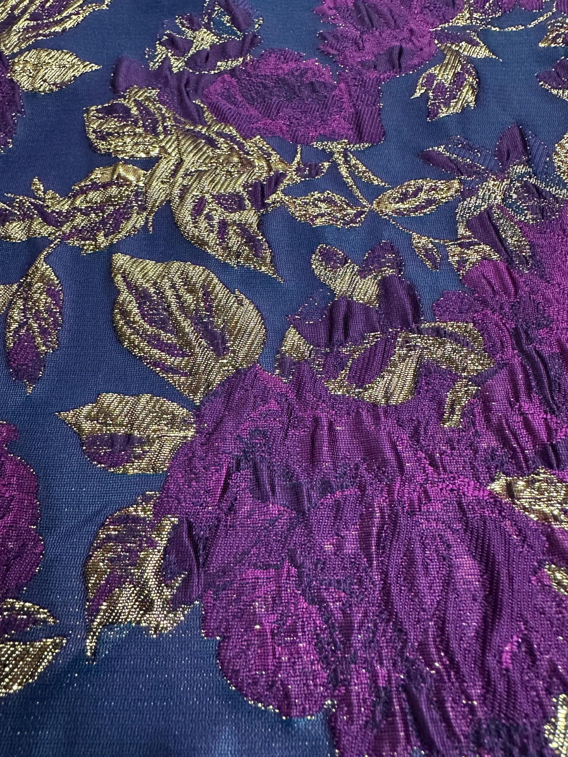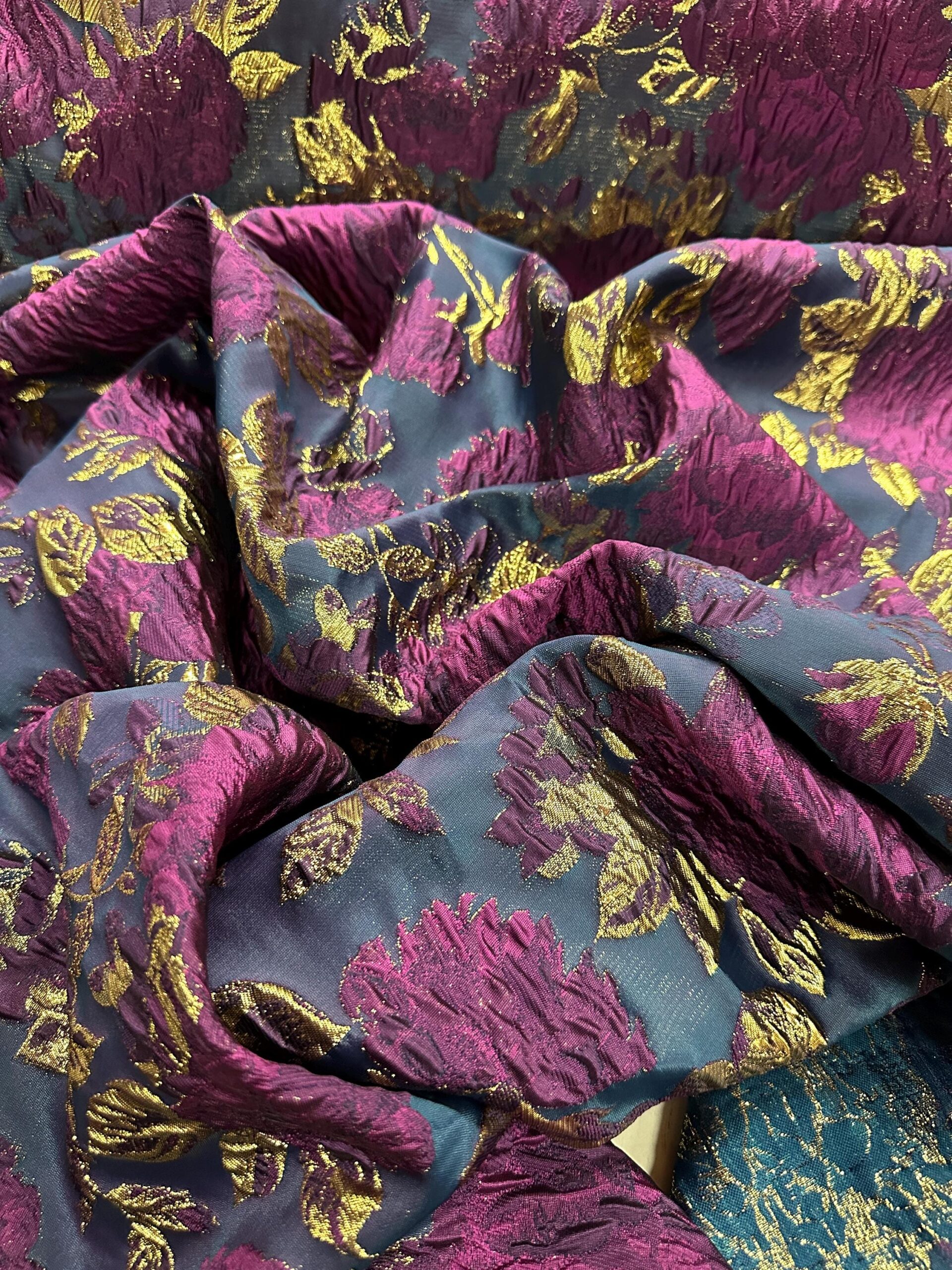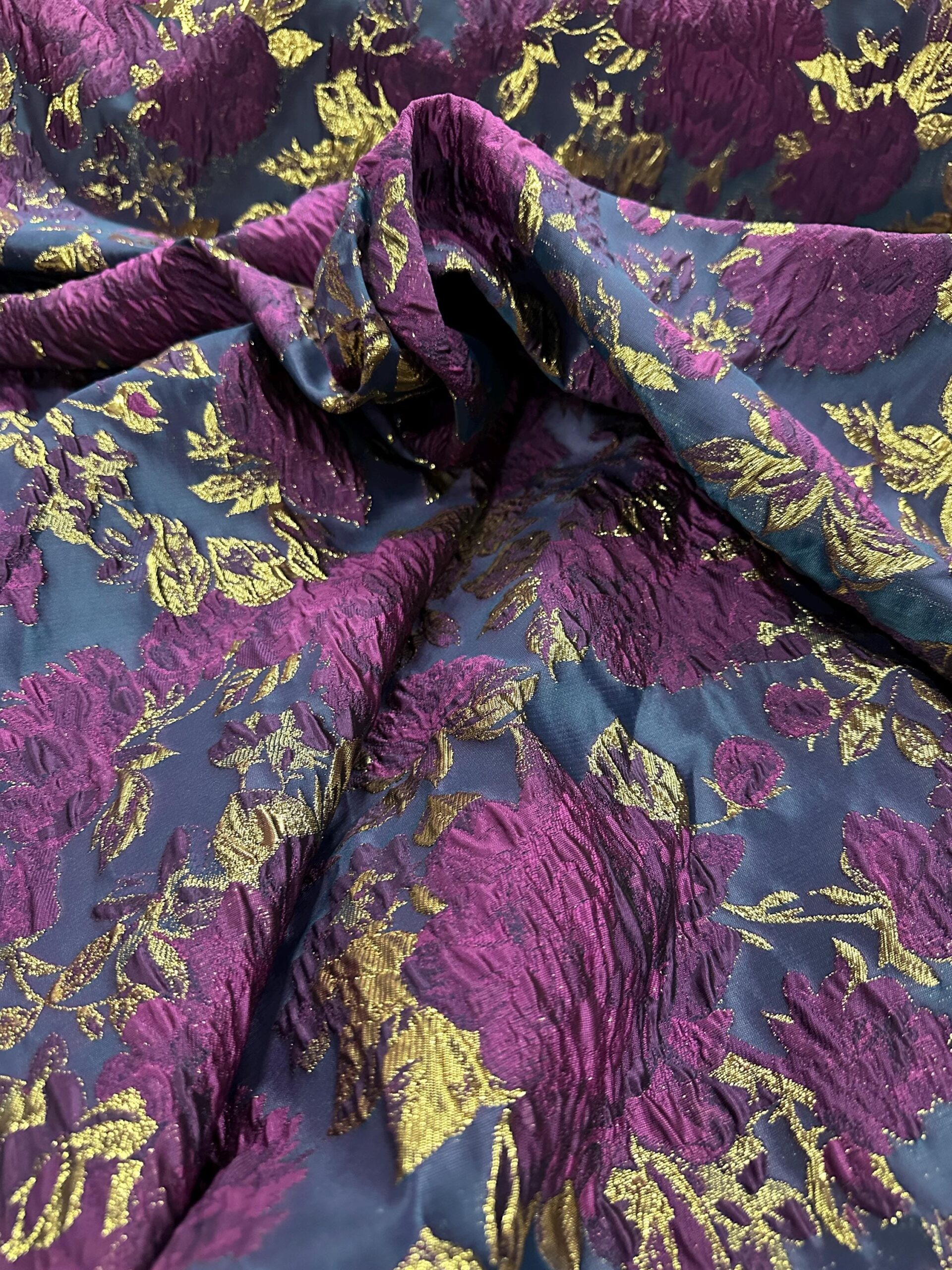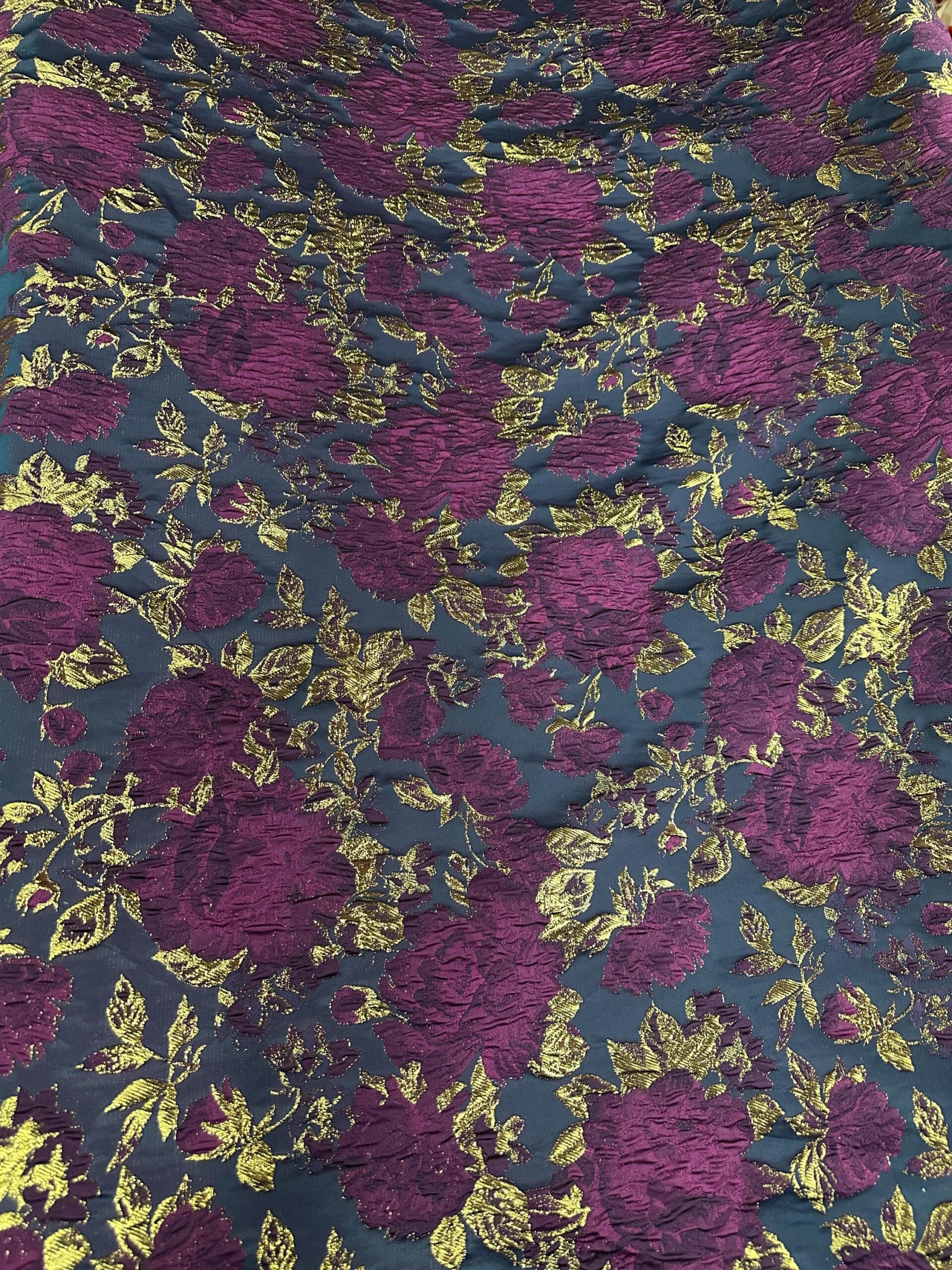 This exquisite plum and gold floral brocade on a navy blue organza base radiates timeless elegance. The large rose motifs are intricately woven with shimmering metallic gold threads, creating a striking contrast against the dark background.
