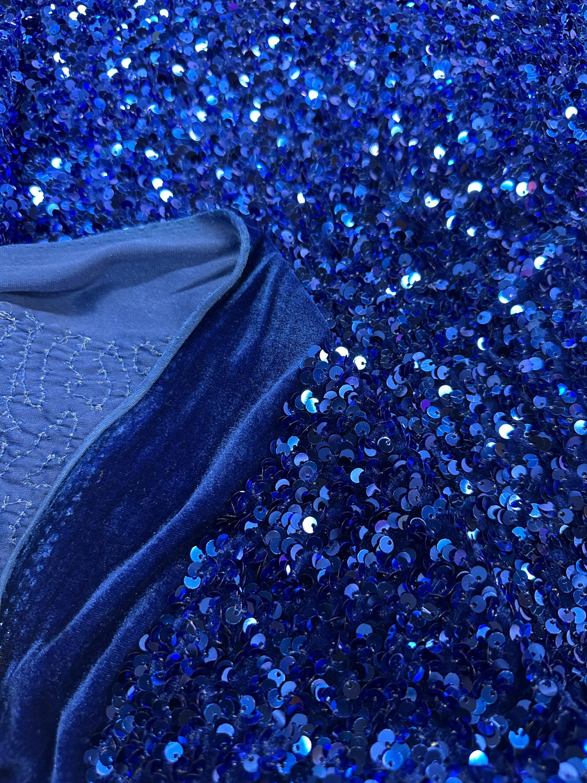 Add luxury and glamour to your designs with this stunning royal blue velvet sequin fabric. The plush stretch velvet base is covered in shimmering sequins that catch and reflect light beautifully, creating a rich, multidimensional look.