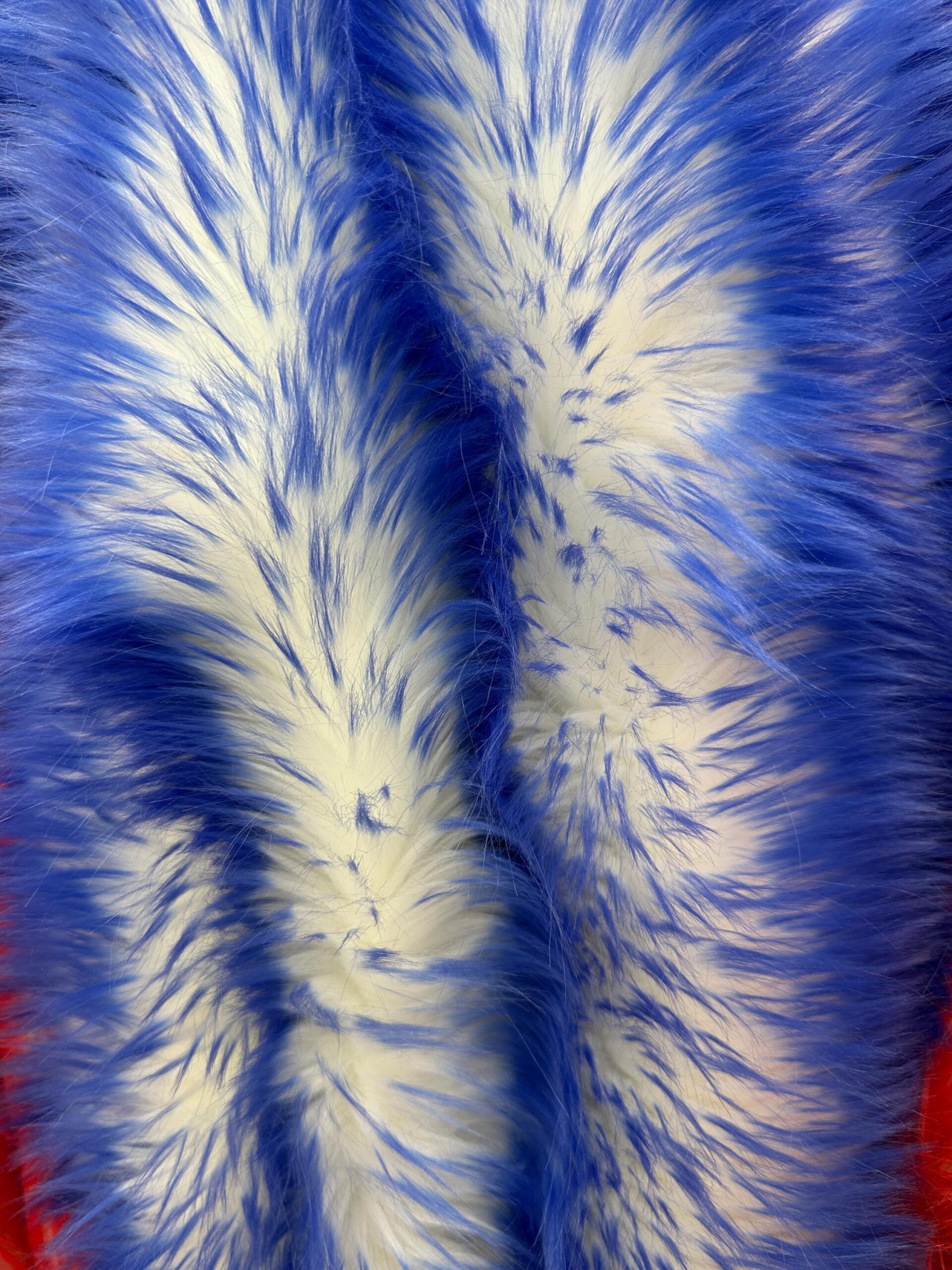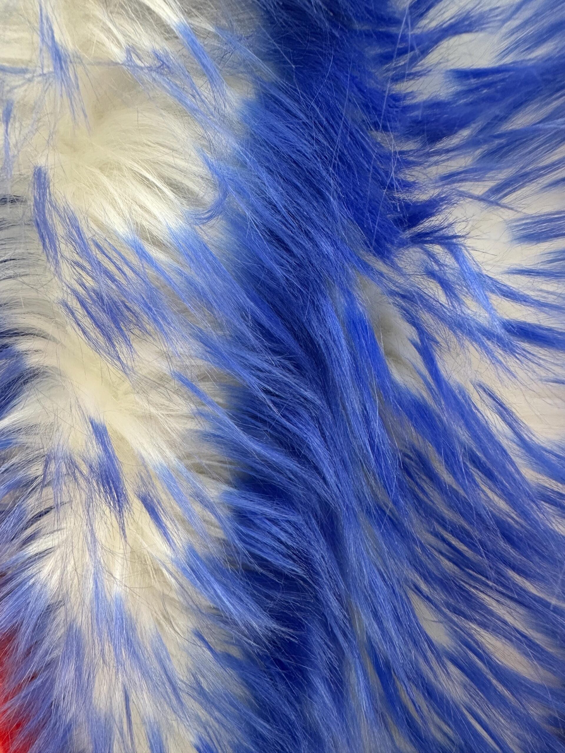 Make a bold and vibrant statement with this Royal Blue & White Candy Shaggy Faux Fur Fabric. The long, silky fibers blend deep royal blue with crisp white, creating a striking, energetic pattern perfect for standout designs. This faux fur is extremely soft, fluffy, and luxurious — ideal for projects that require both color and texture.