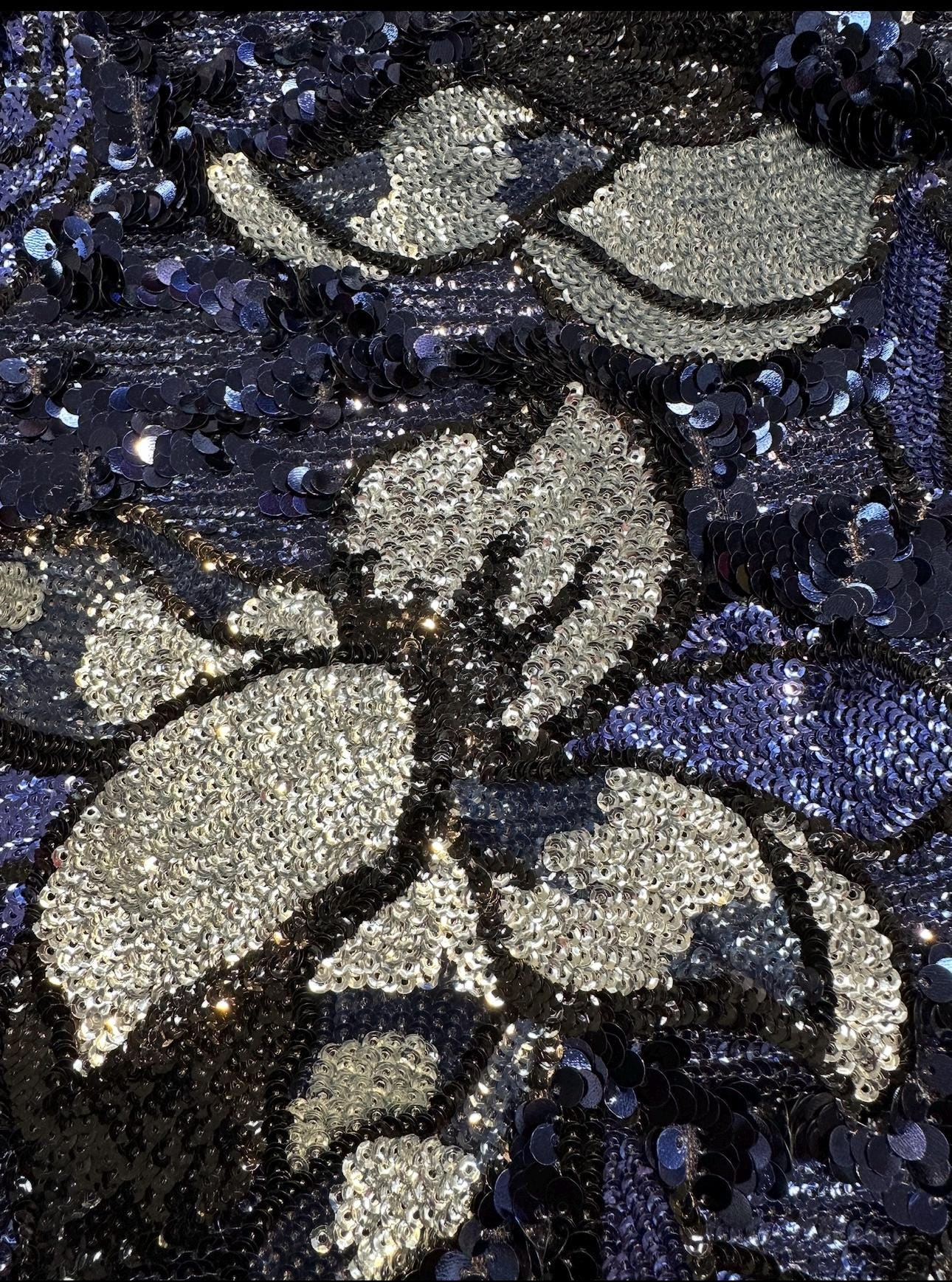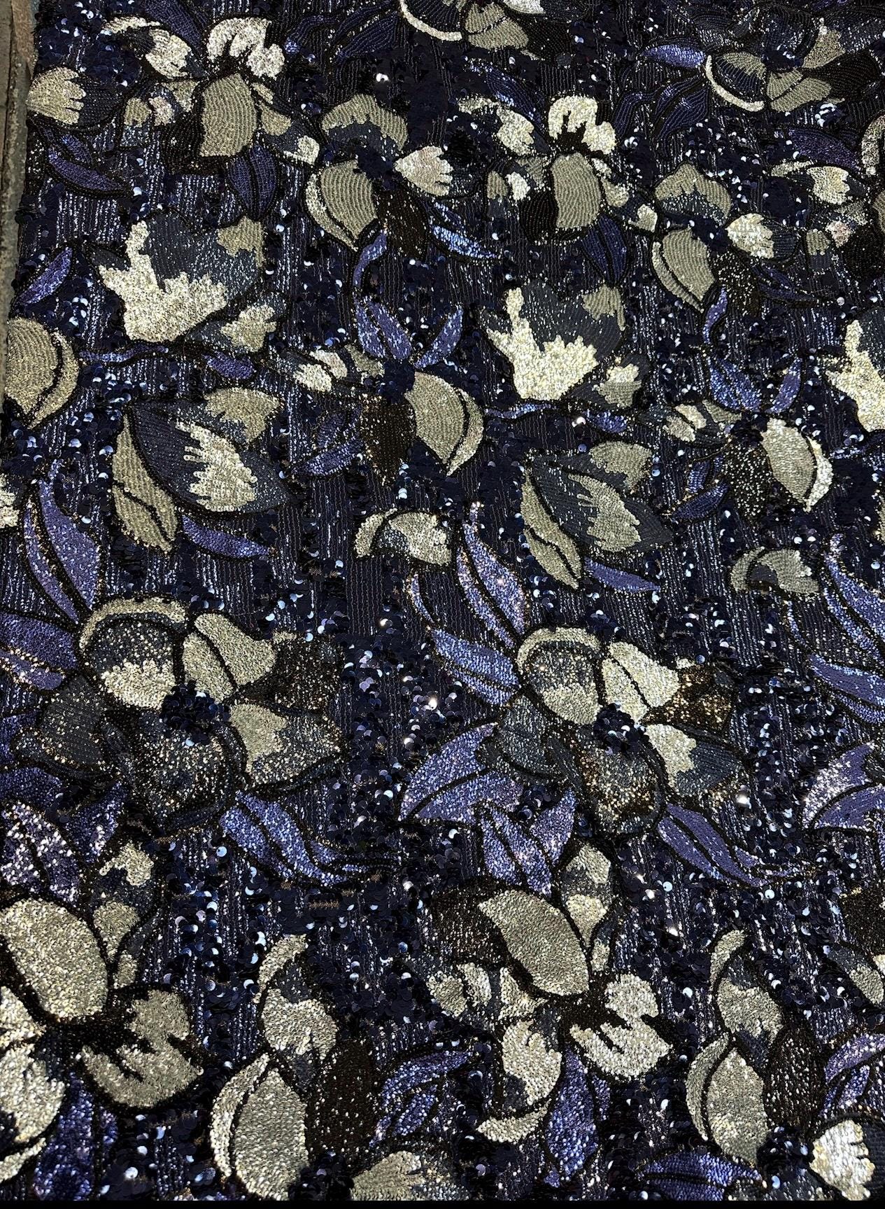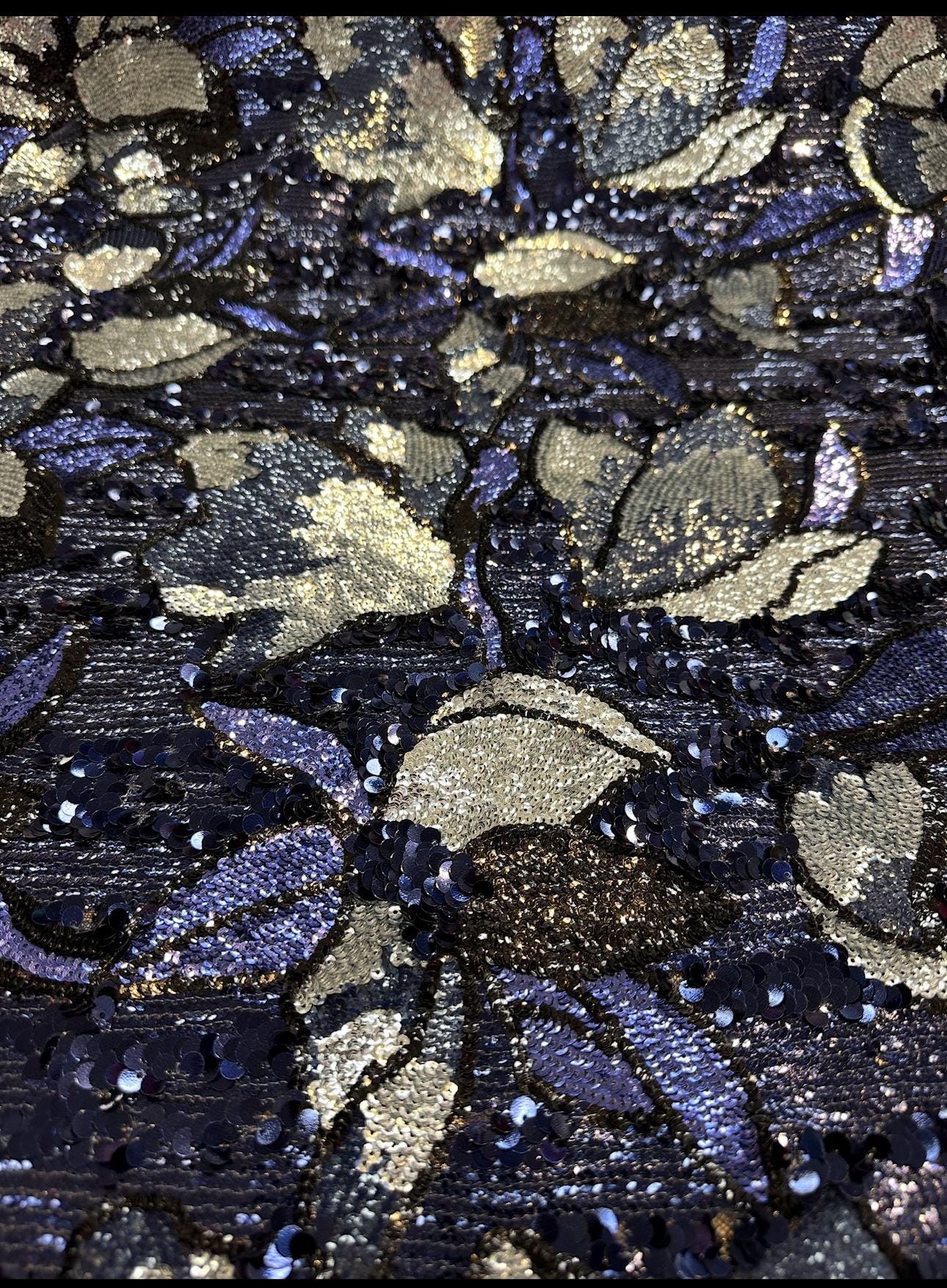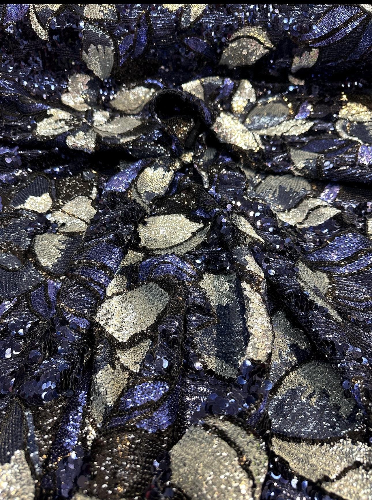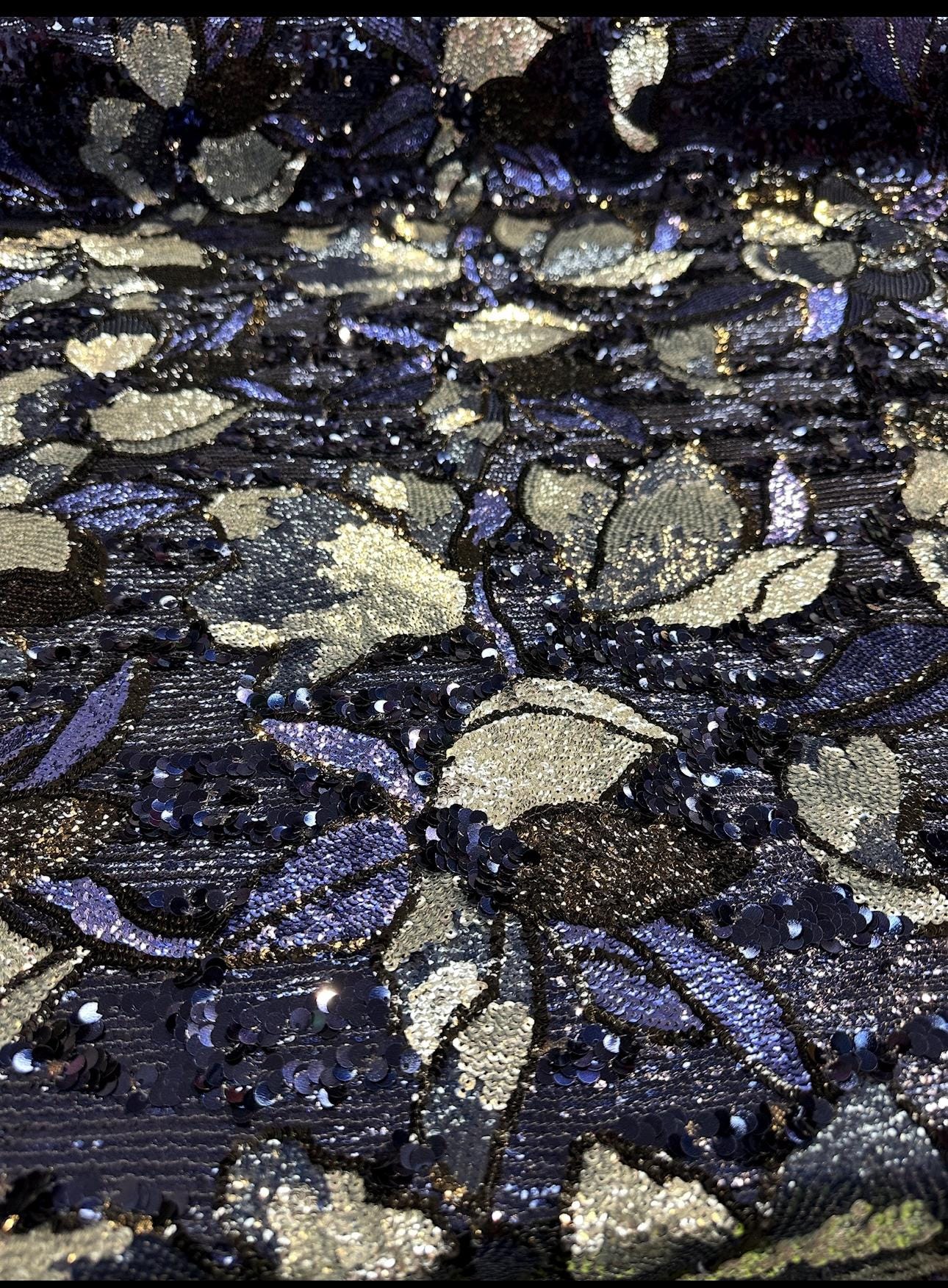 Bring elegance and drama to your designs with this Luxury Black, Gold & Purple Sequin Lace Fabric, featuring a richly detailed 3D floral pattern embroidered on a soft mesh base. The fabric is densely covered with shimmering sequins in deep black, metallic gold, and iridescent purple, creating a bold and sophisticated look.