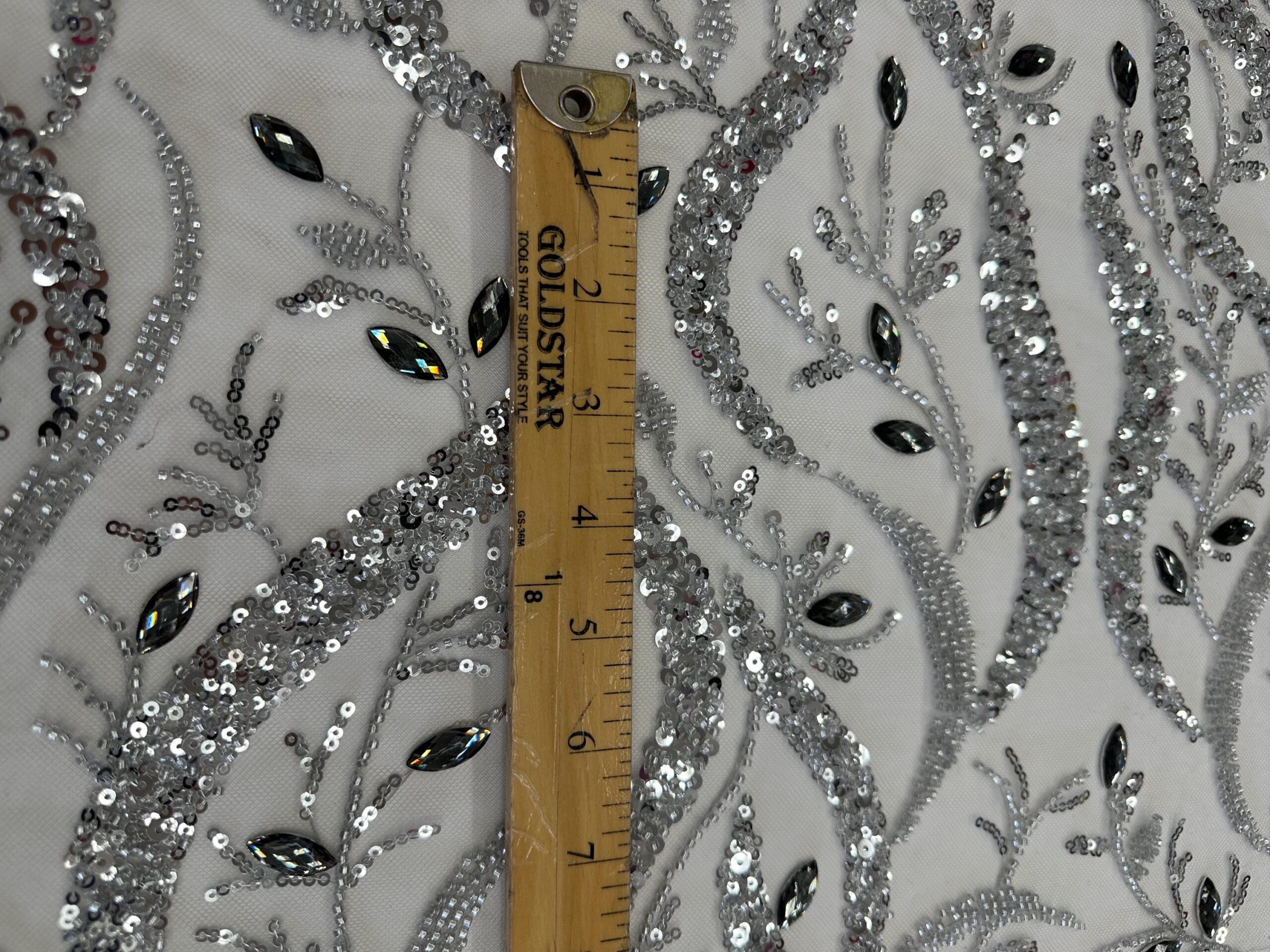 Silver Beaded Lace Fabric | Embroidered Mesh, Rhinestones /Sequins