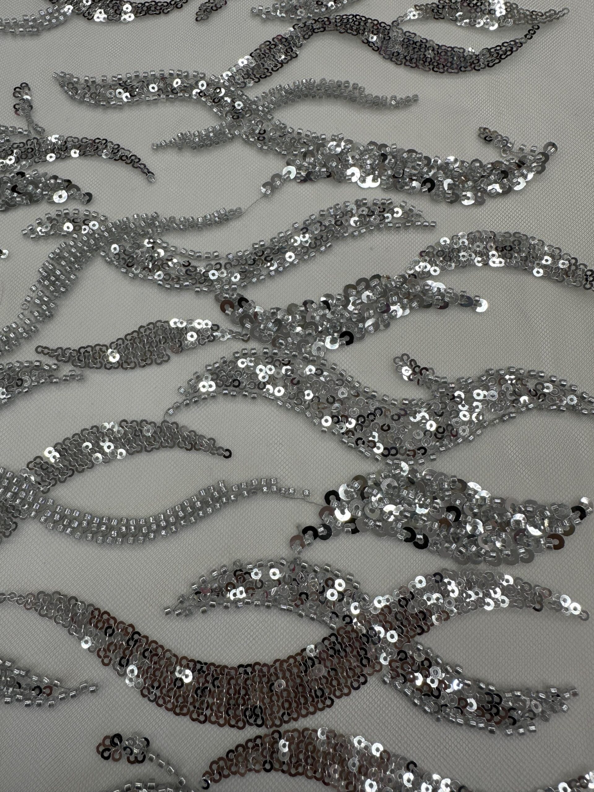 Crafted on a soft sheer mesh base, this lace drapes gracefully and works beautifully for wedding gowns, evening dresses, prom dresses, couture custom designs, veils, skirts, overlays, and high-fashion projects. The silver tones give an elegant, timeless look suitable for both modern and classic styles.
