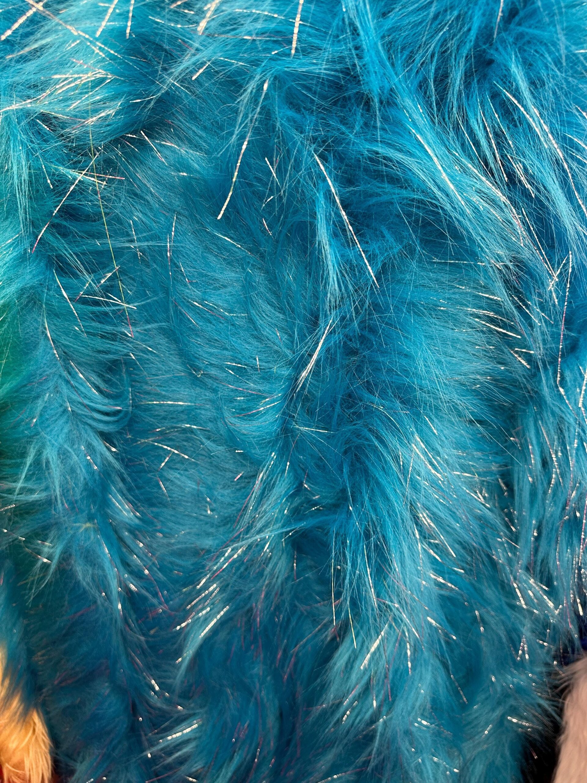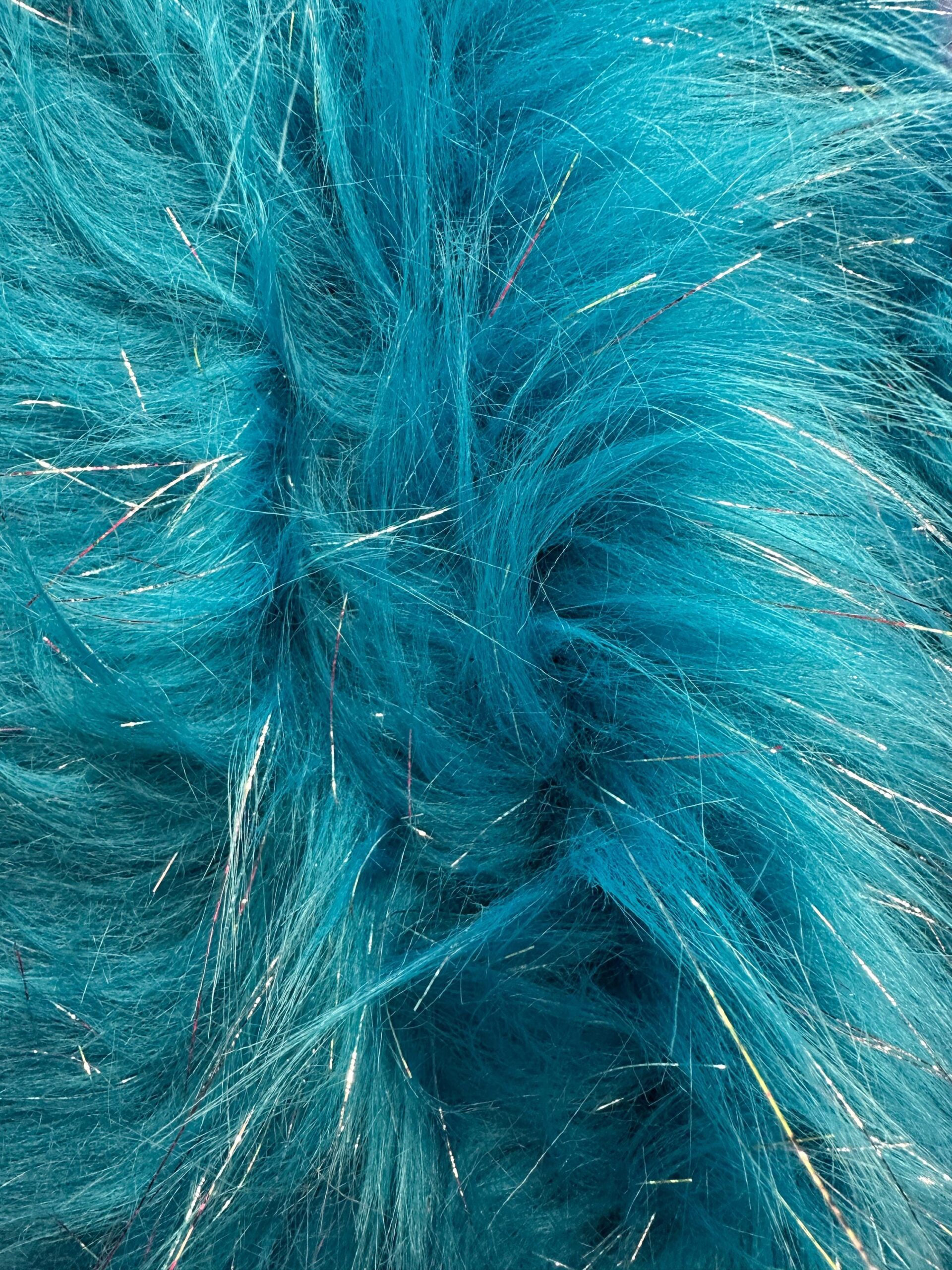 Add dazzling color and texture to your creative projects with this Sparkly Turquoise Shaggy Faux Fur Fabric. Featuring long, luxurious turquoise fibers woven with shimmering silver tinsel strands, this fur sparkles beautifully under light and adds instant drama to any design. Soft, fluffy, and full-bodied, it’s perfect for standout costume and décor work.
