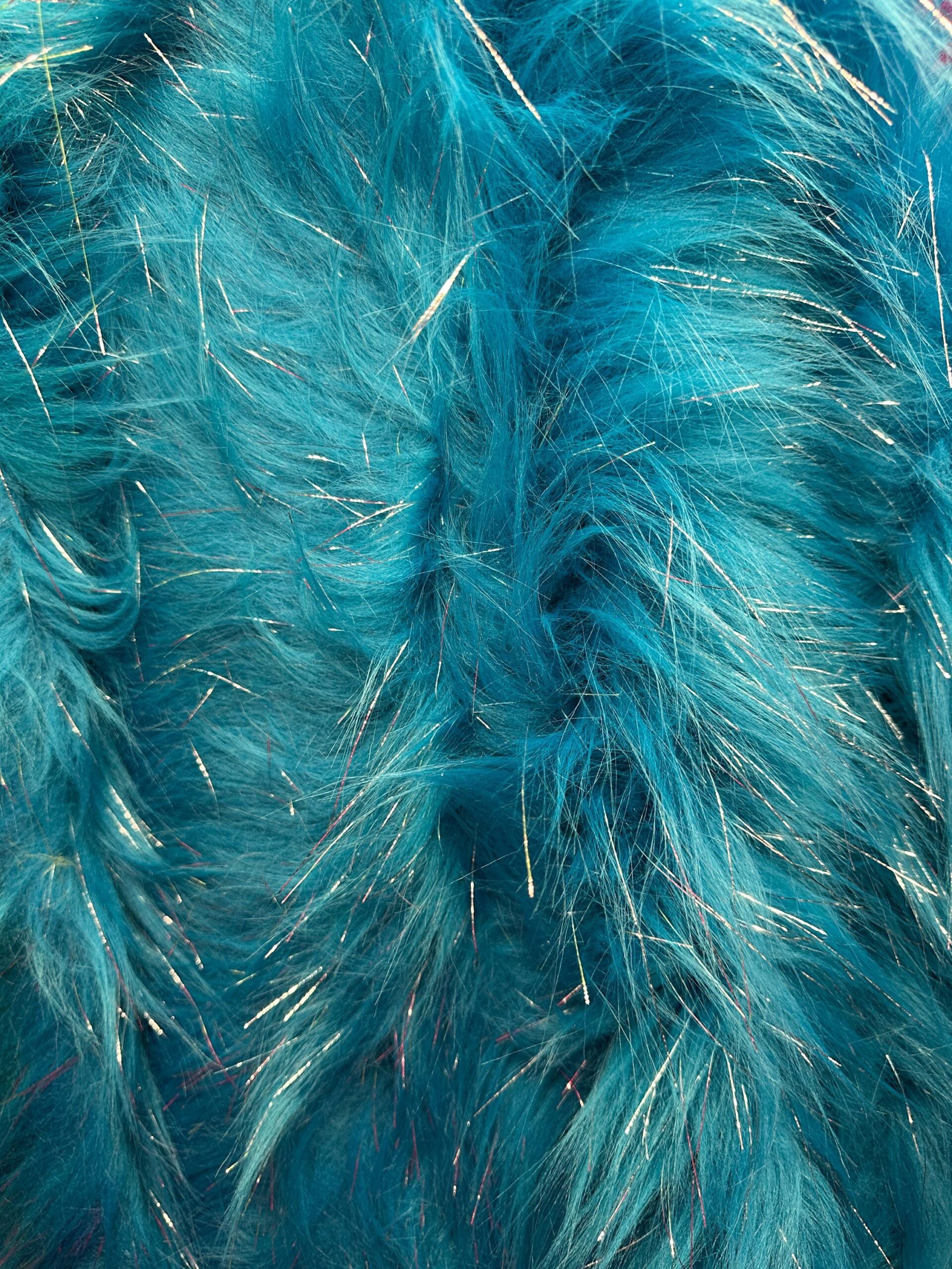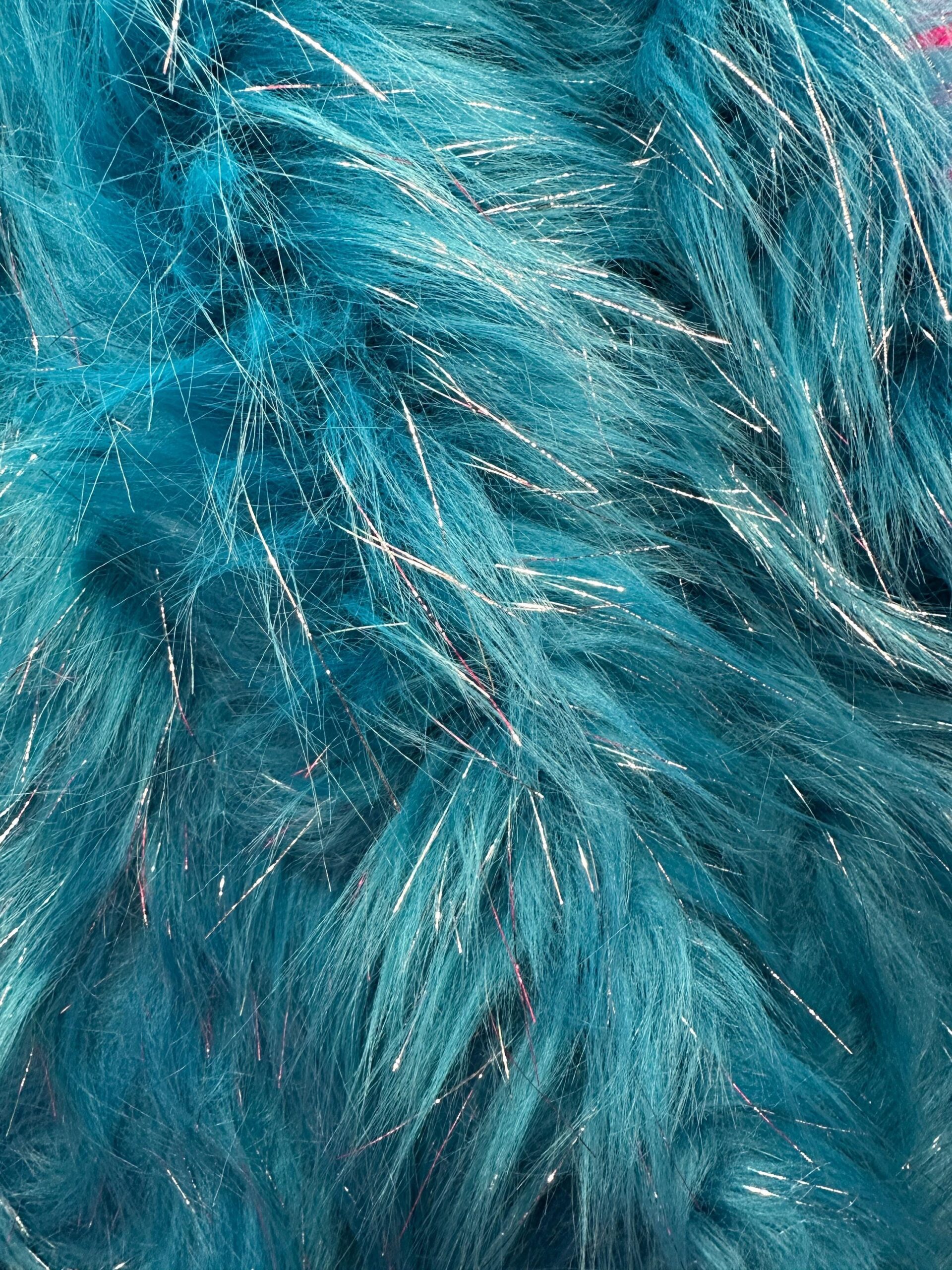 Turquoise Shaggy Faux Fur Fabric with Silver Tinsel 60″ Wide