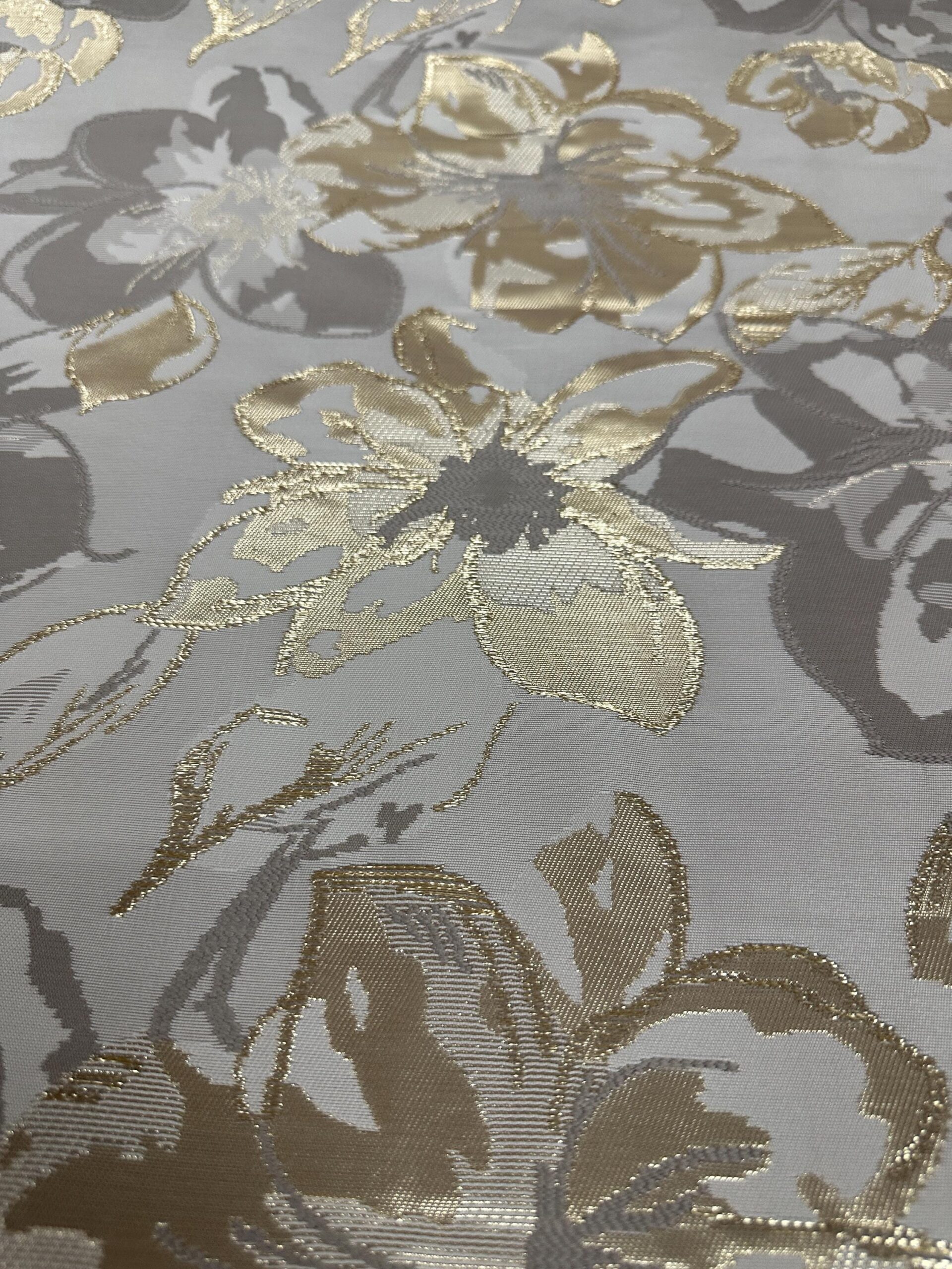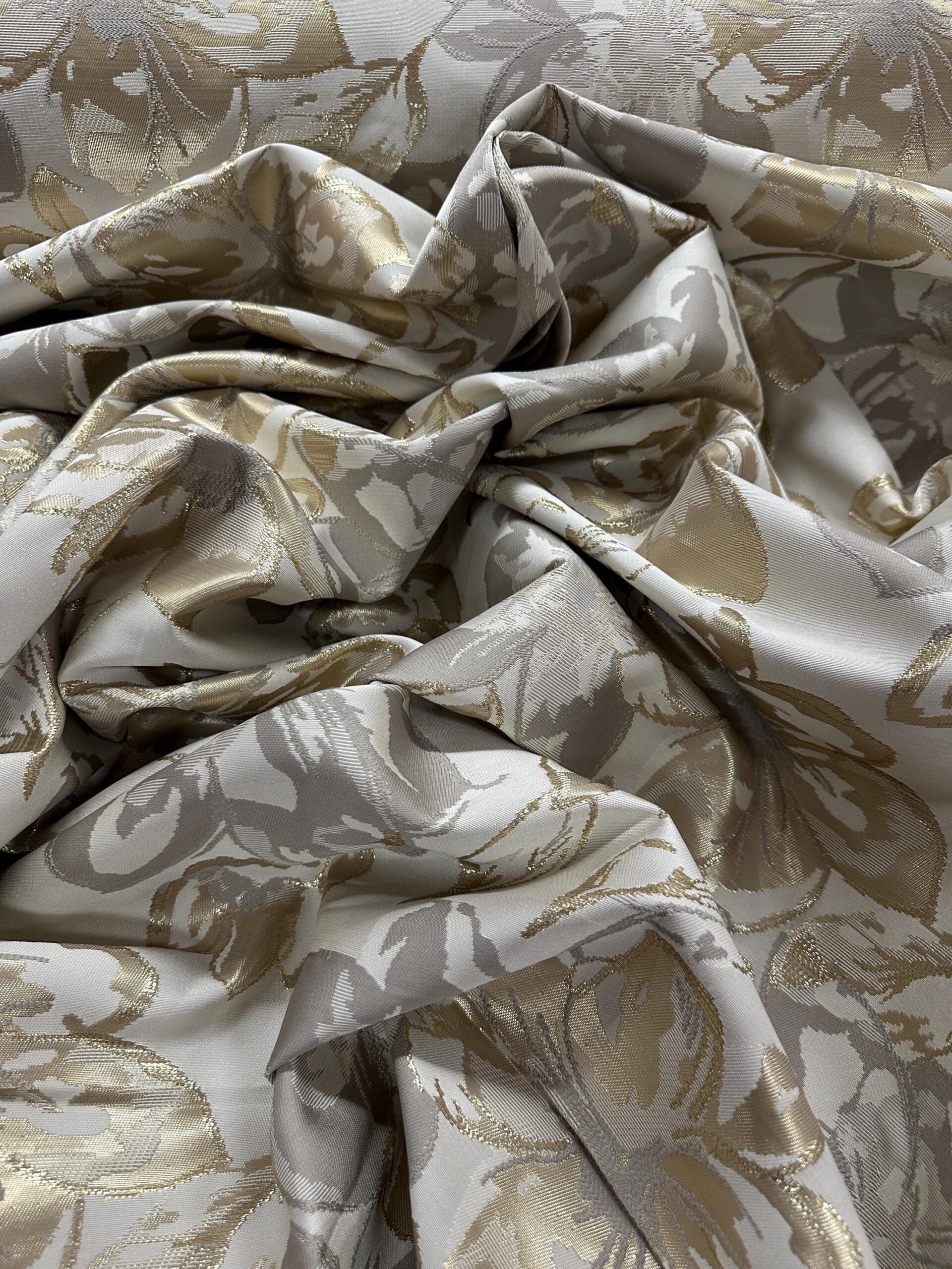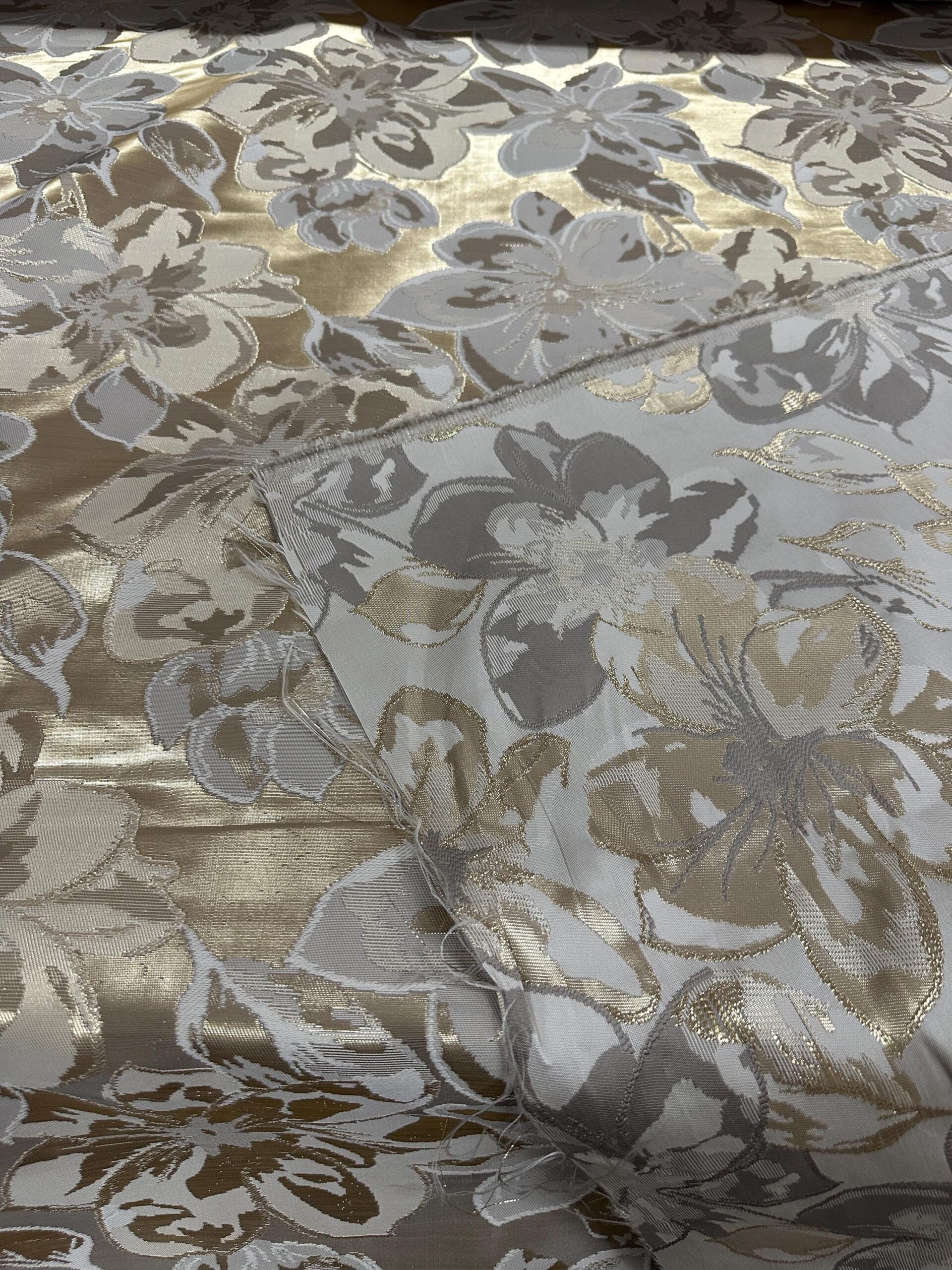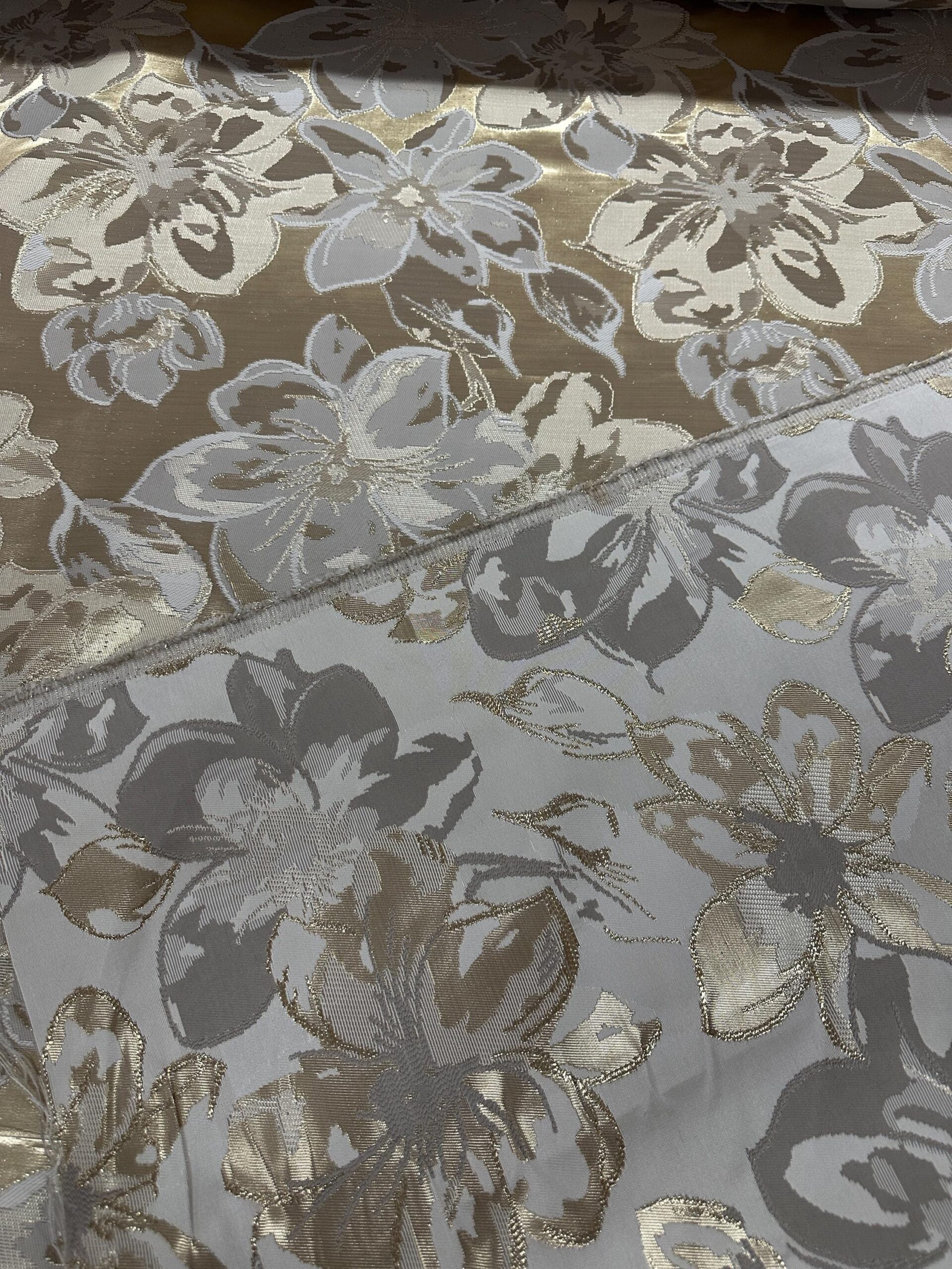 Elevate your designs with this exquisite White and Gold Floral Brocade Fabric. Woven with metallic threads that shimmer beautifully in light, this fabric combines timeless floral elegance with modern sophistication. The jacquard weave adds depth and texture, making it perfect for statement garments and luxurious home décor.