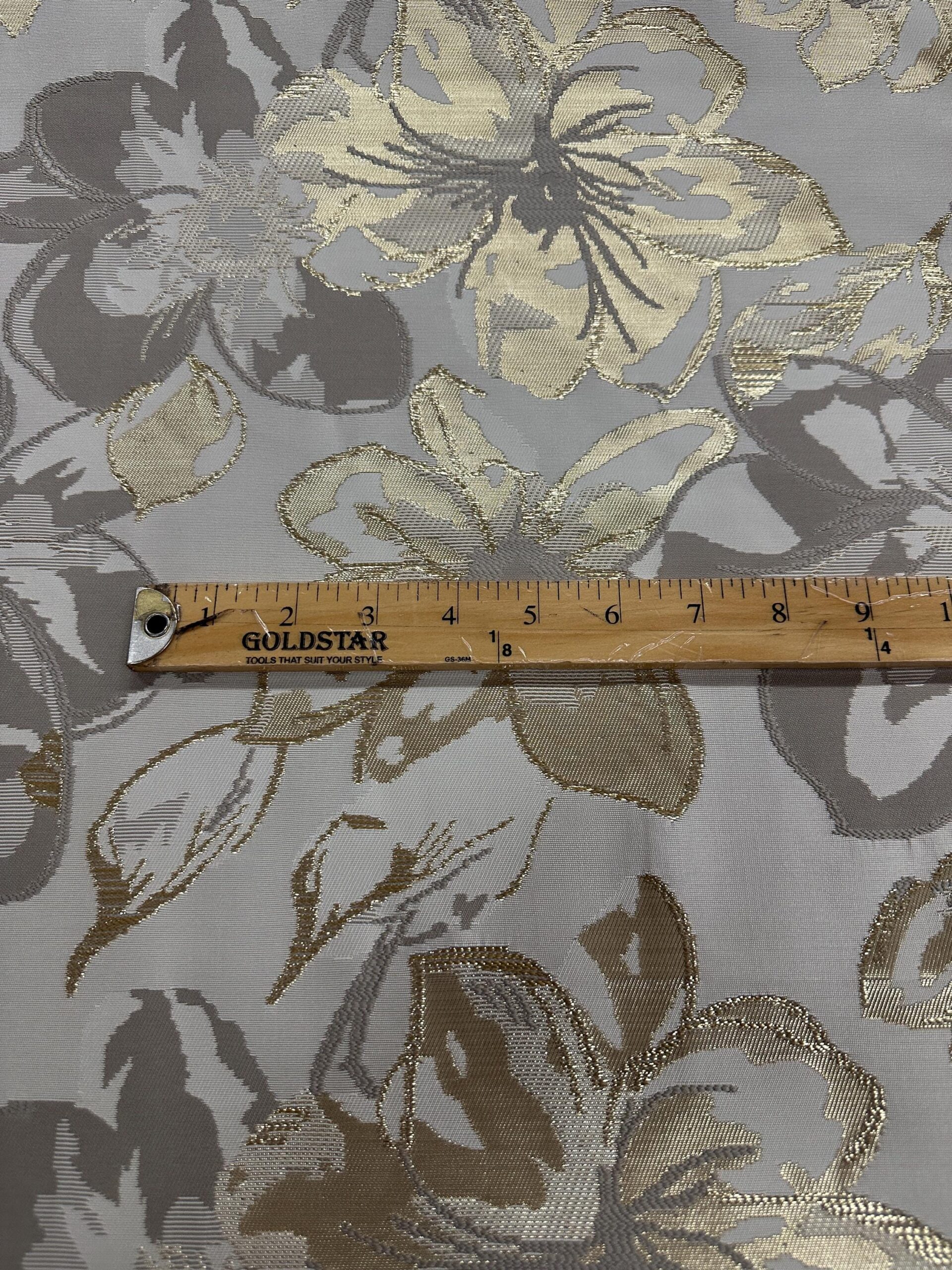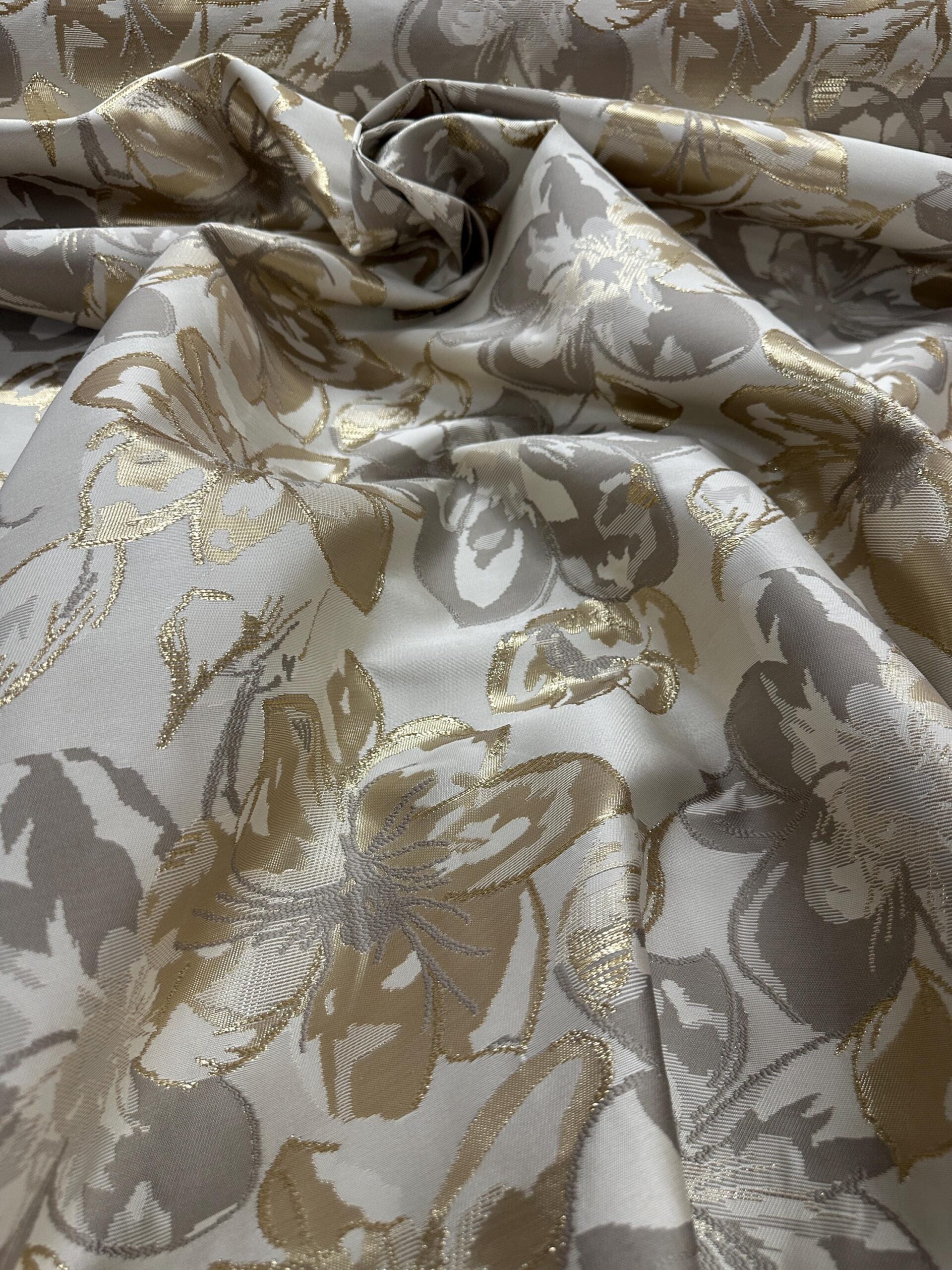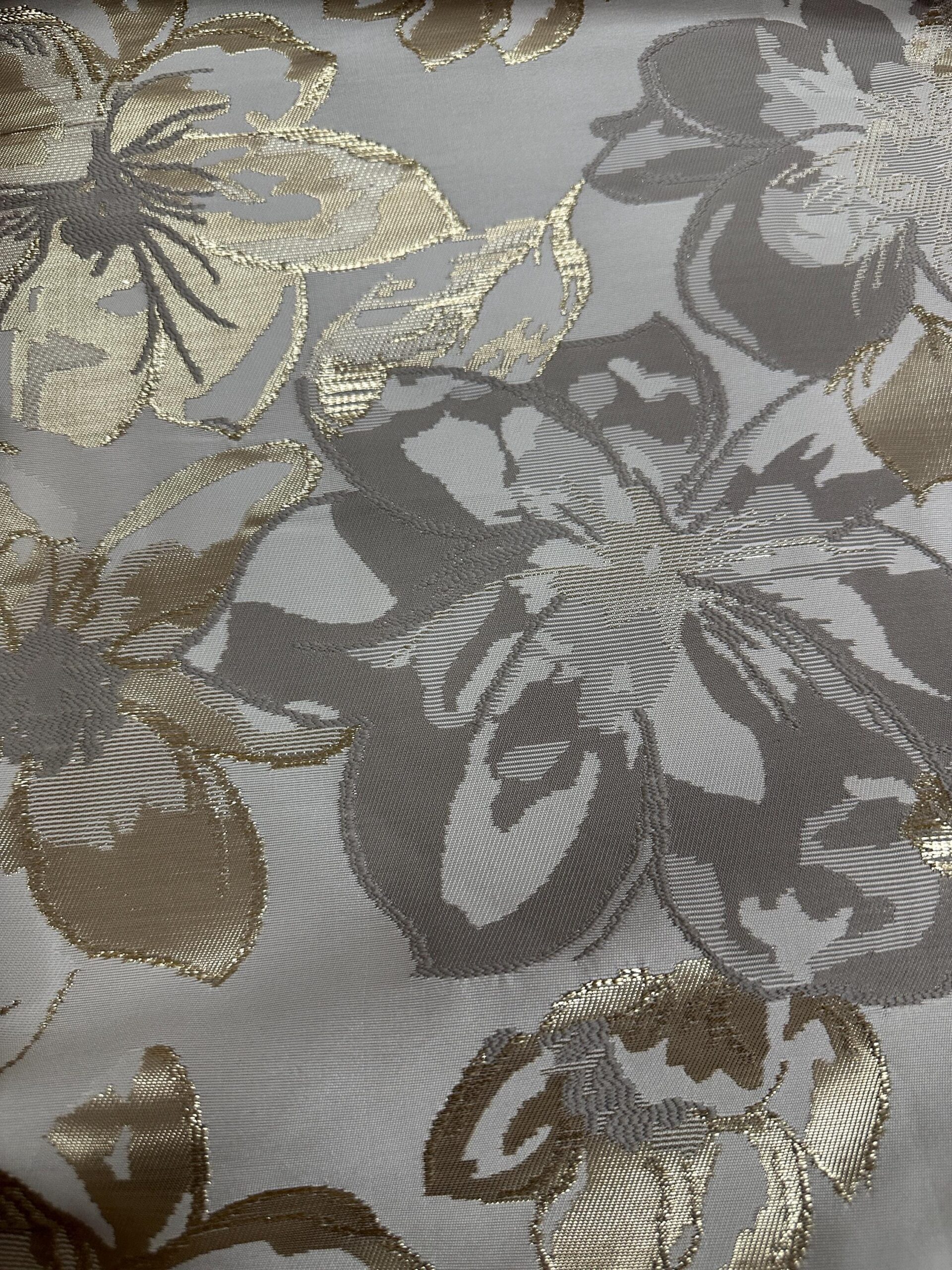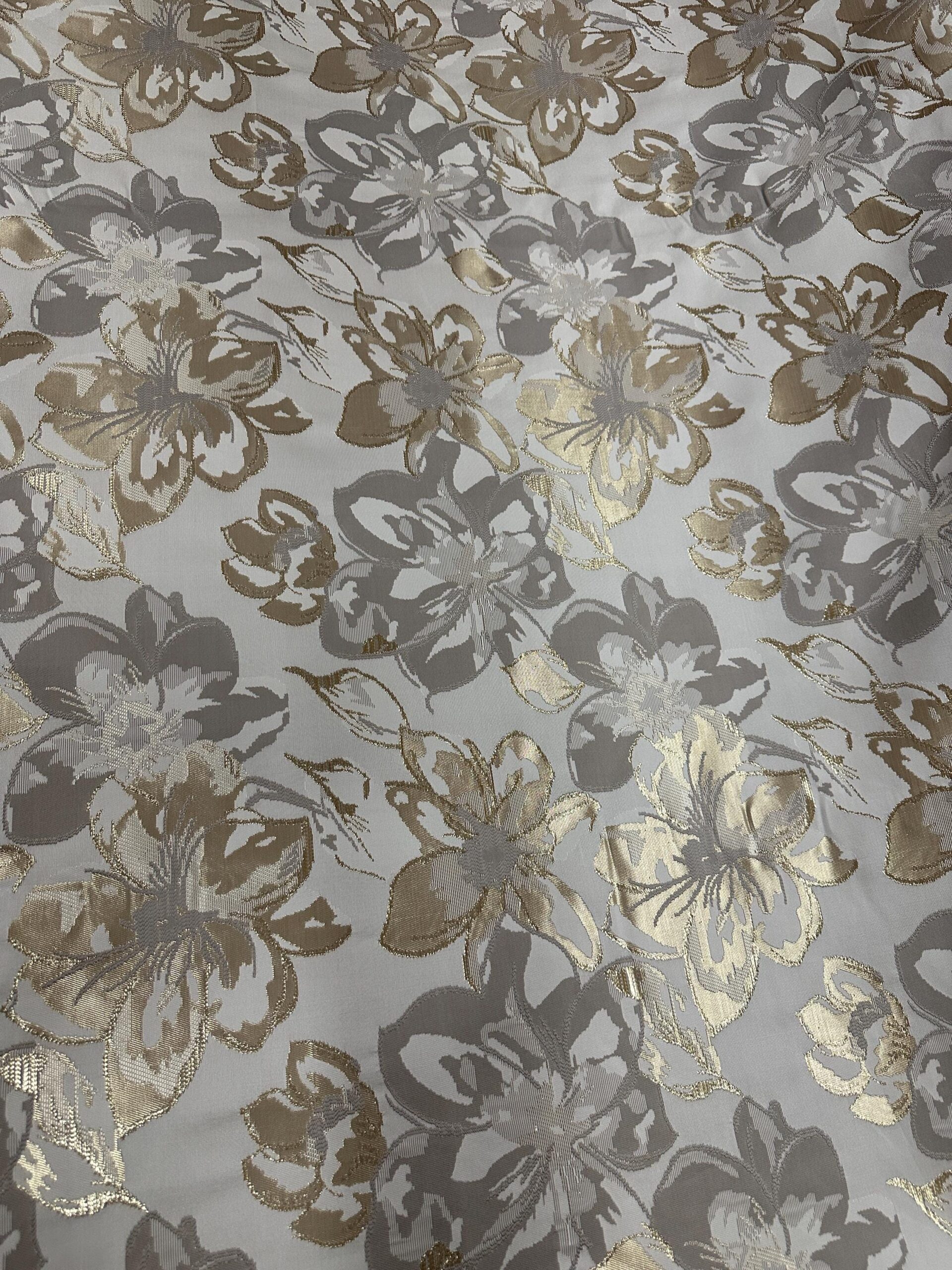 Elevate your designs with this exquisite White and Gold Floral Brocade Fabric. Woven with metallic threads that shimmer beautifully in light, this fabric combines timeless floral elegance with modern sophistication. The jacquard weave adds depth and texture, making it perfect for statement garments and luxurious home décor.